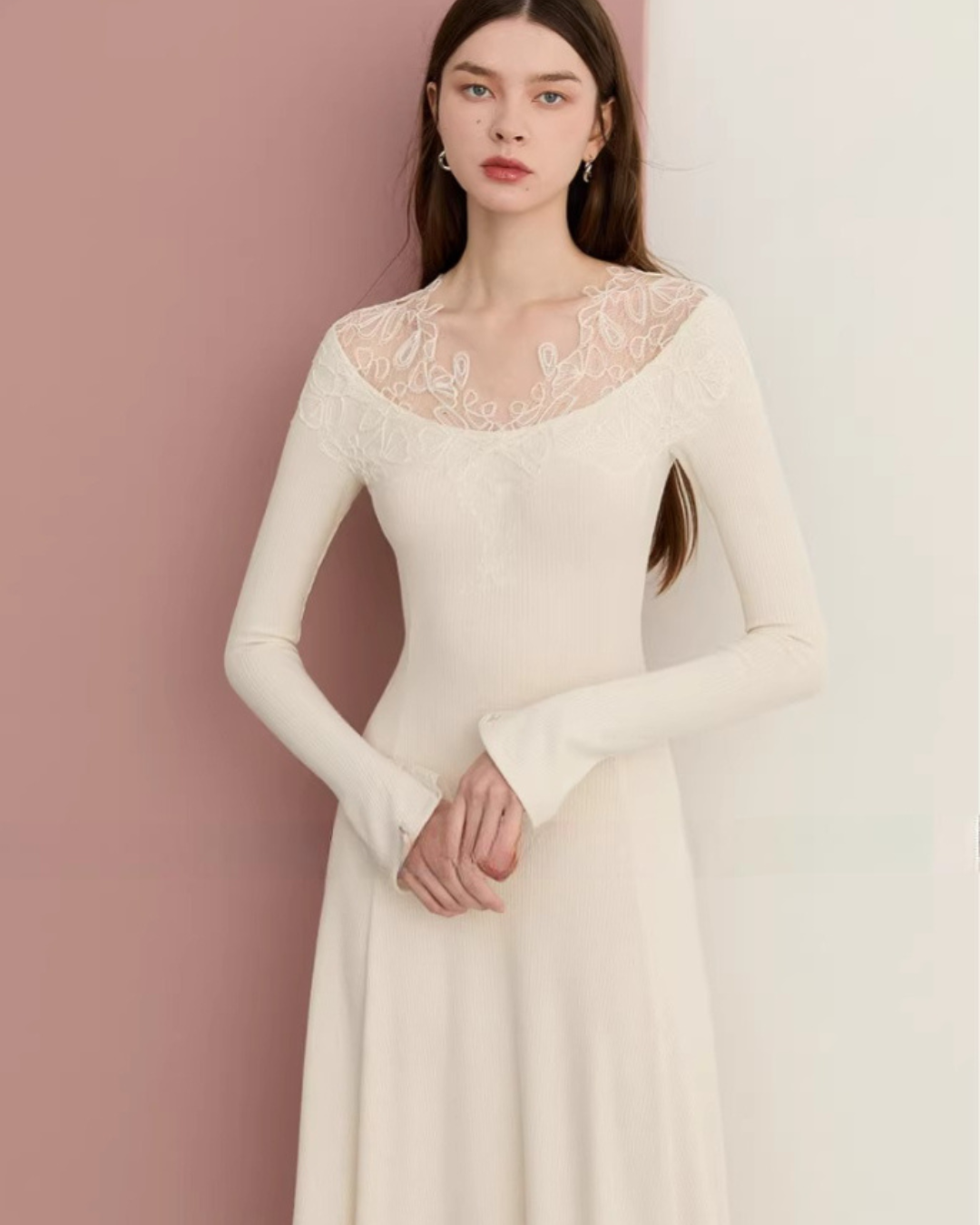 A long dress made of ribbed material that exudes a feminine atmosphere.
