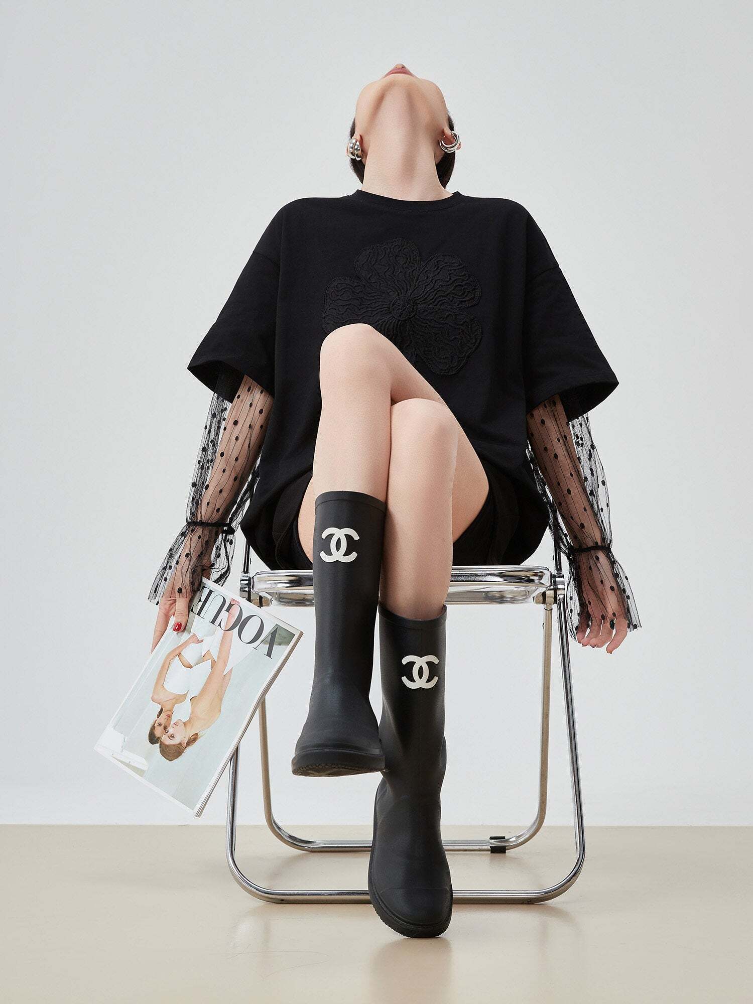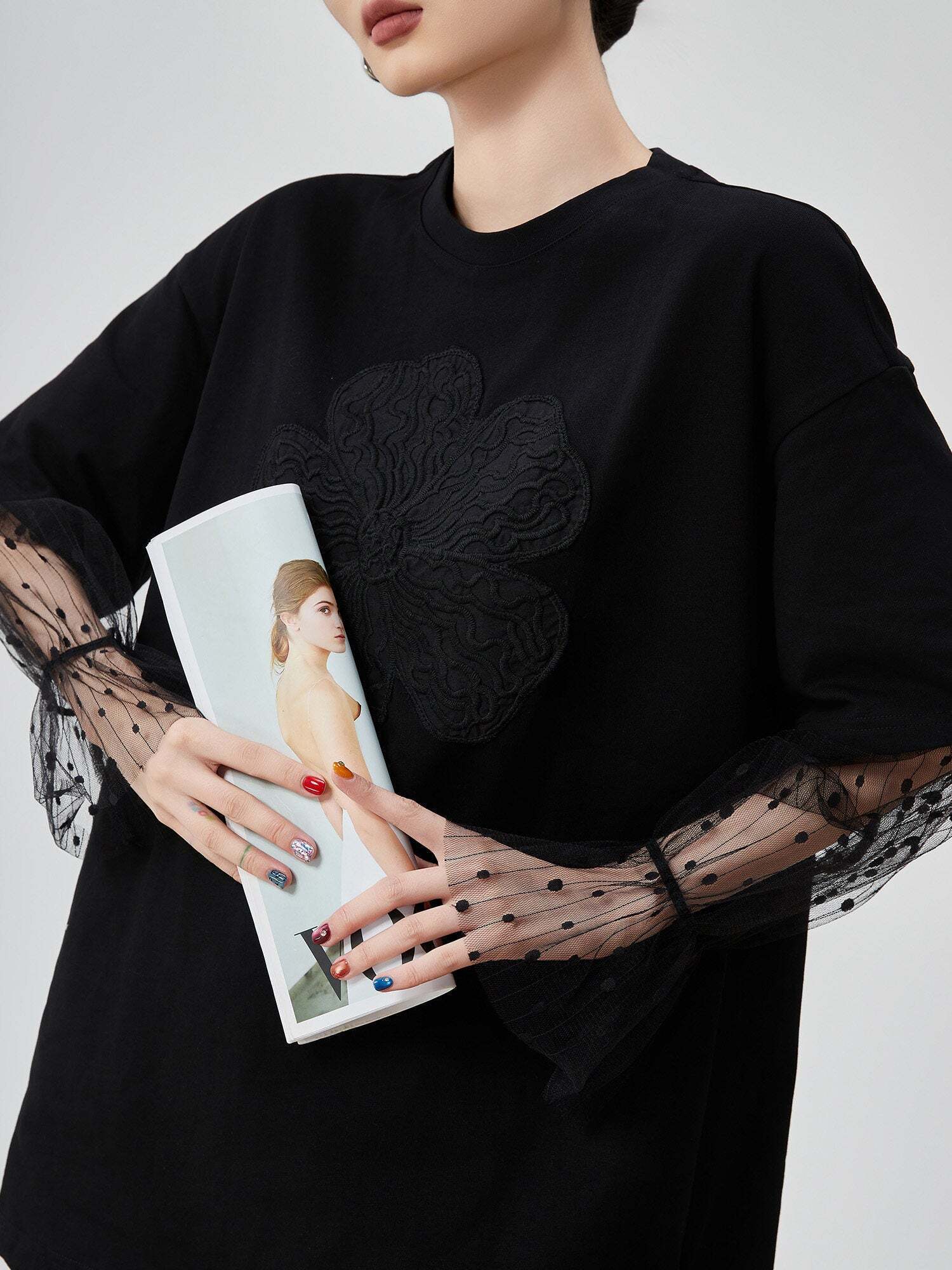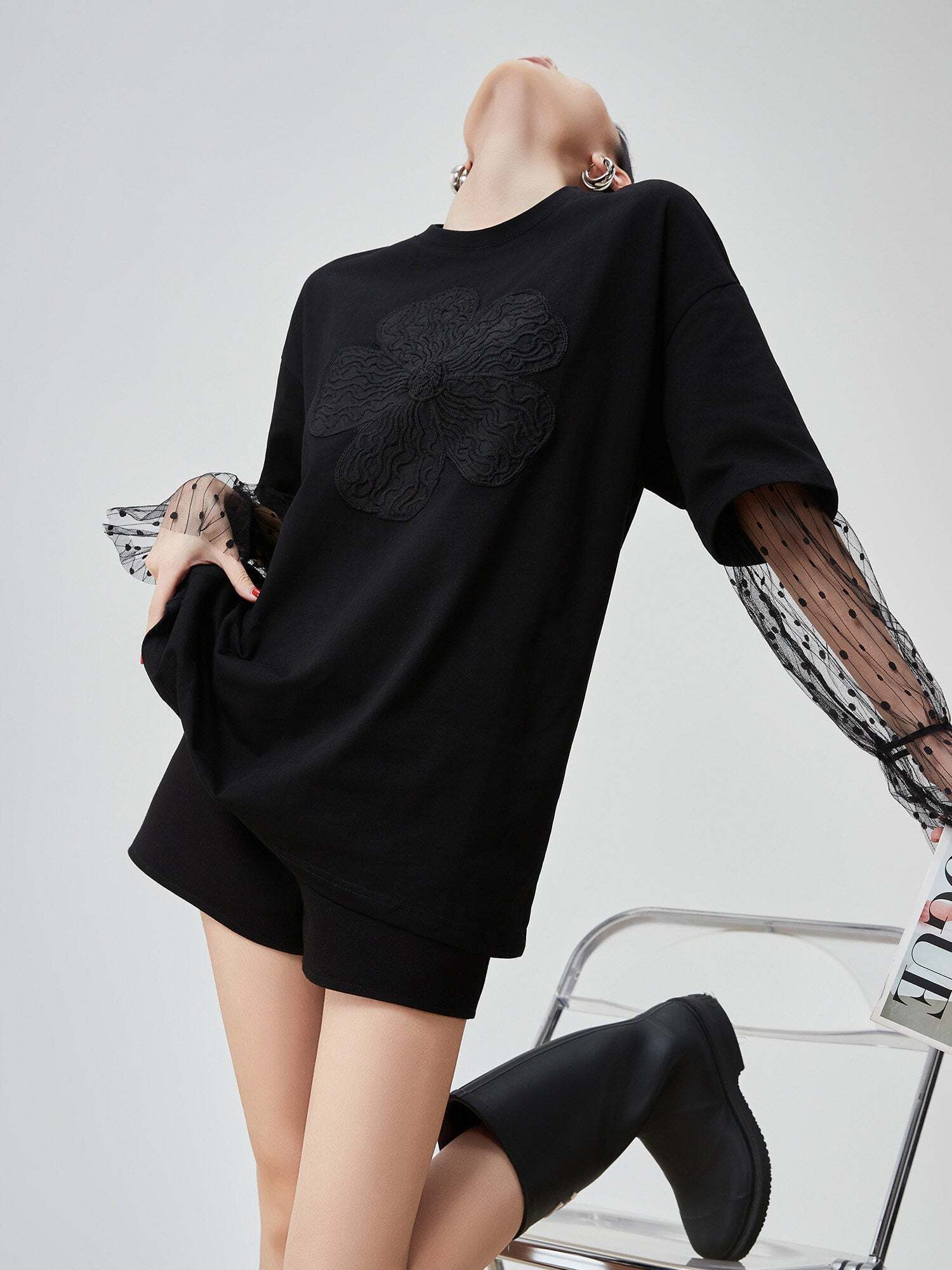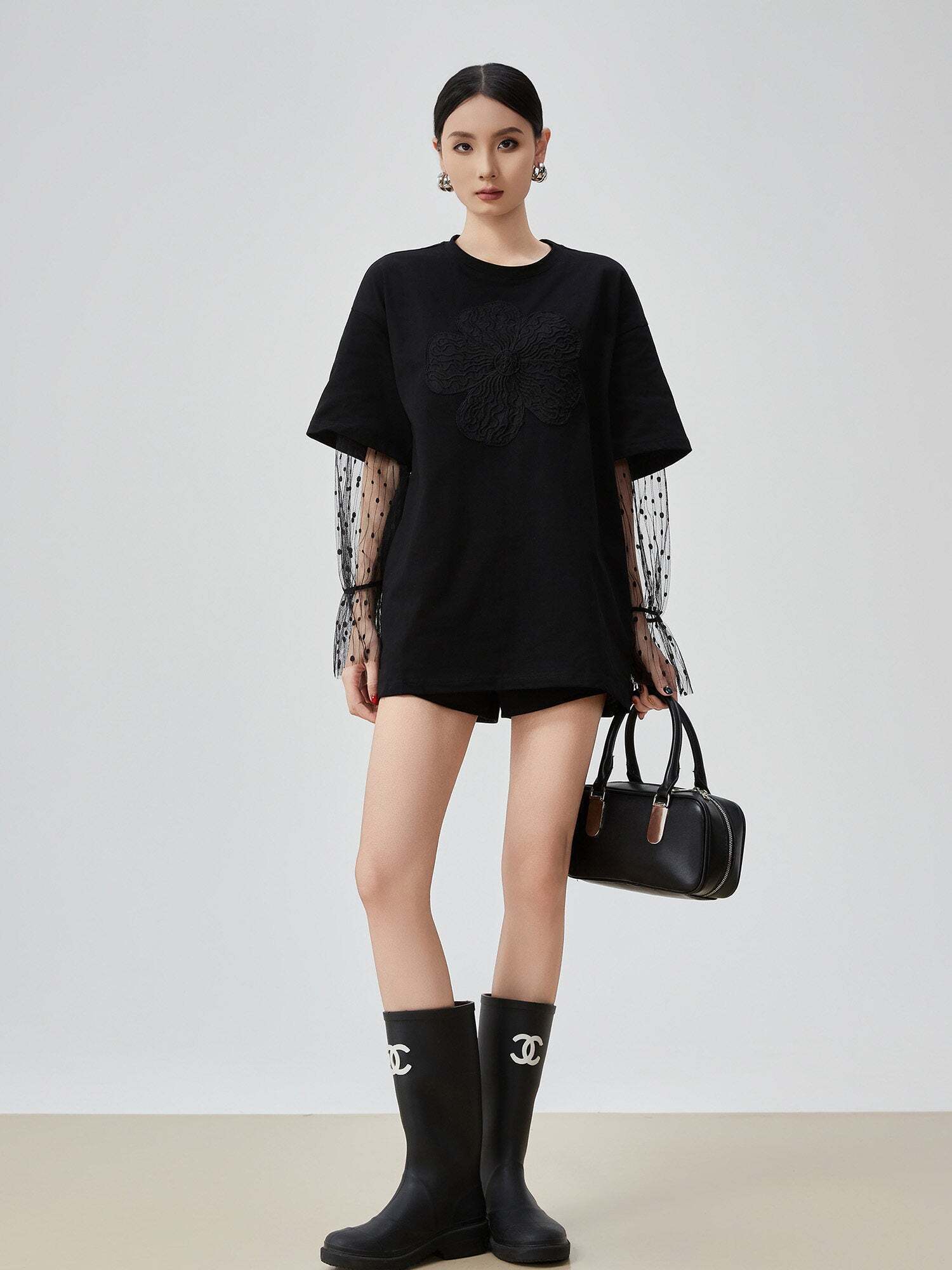 A short-sleeved T-shirt with flower embroidery on the front that exudes presence.
