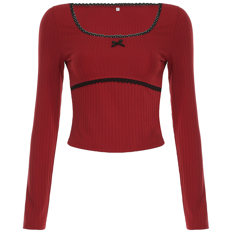Lace Trim Round Neck Bow Coquette Long Sleeve Tee