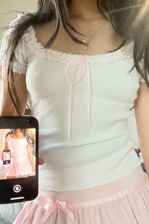 - This item: Lace Trim Square Neck Bubble Short Sleeve Tee Original price was: $30.80.$21.56Current price is: $21.56.