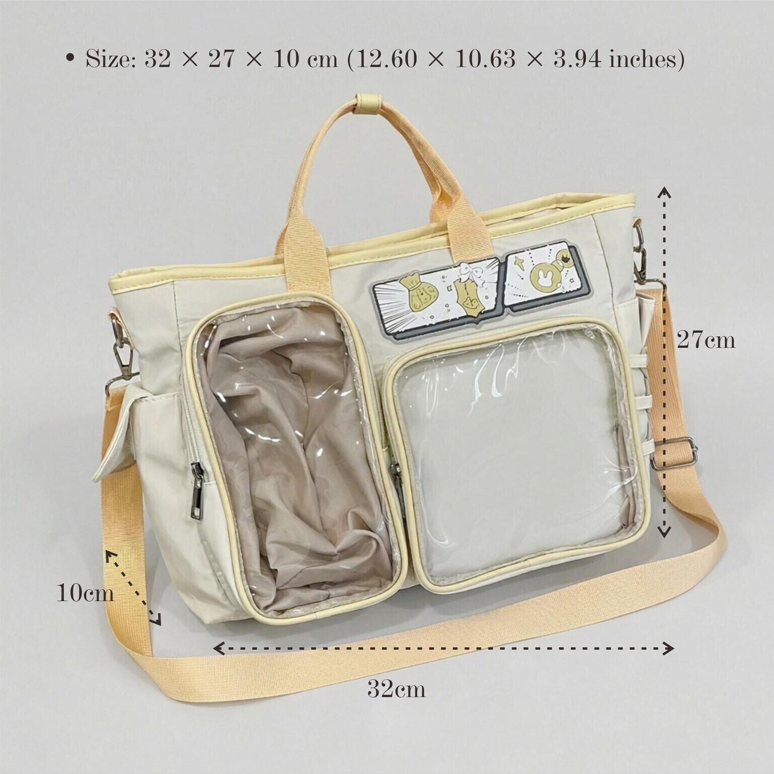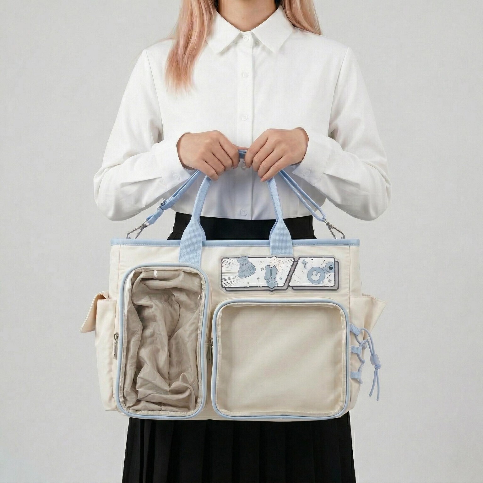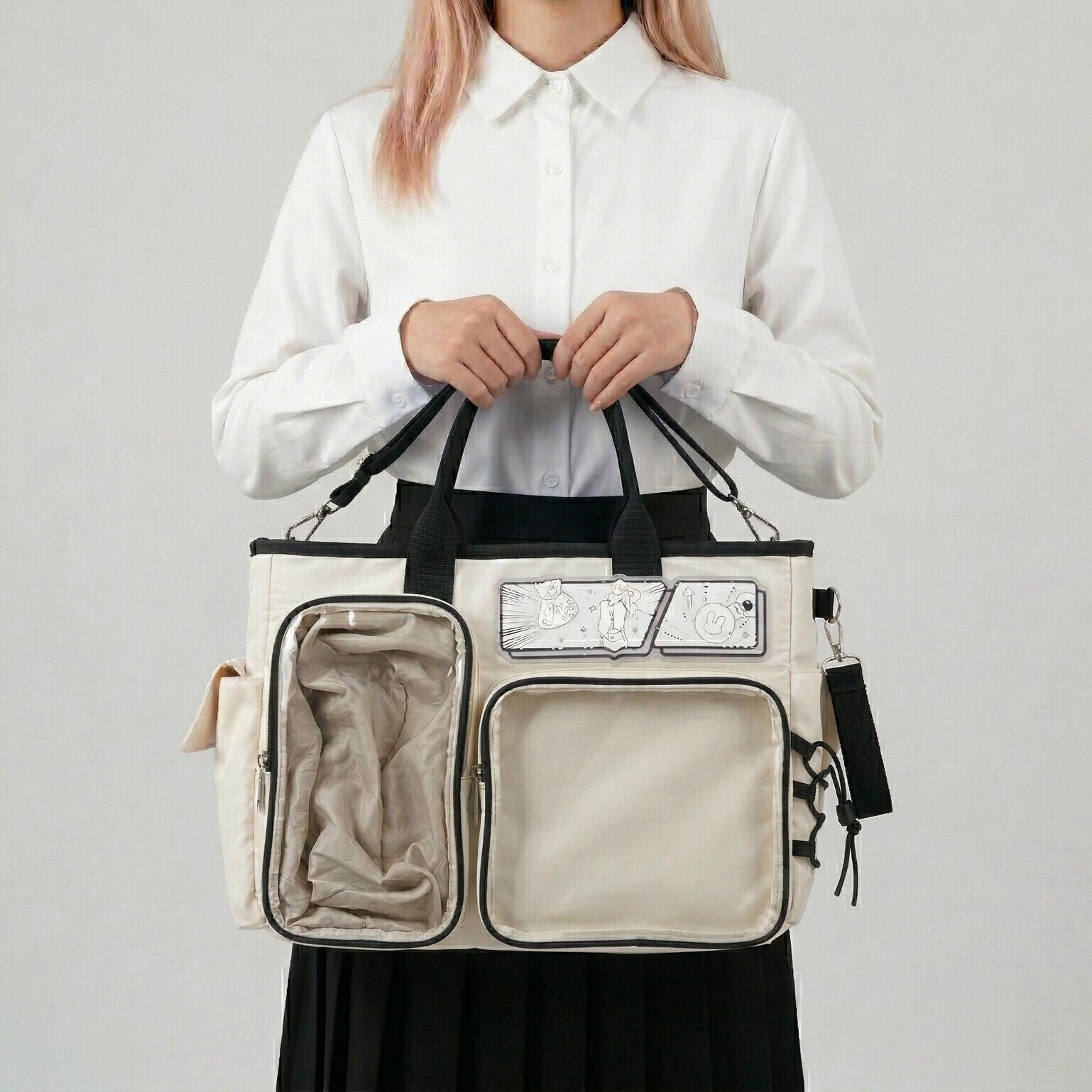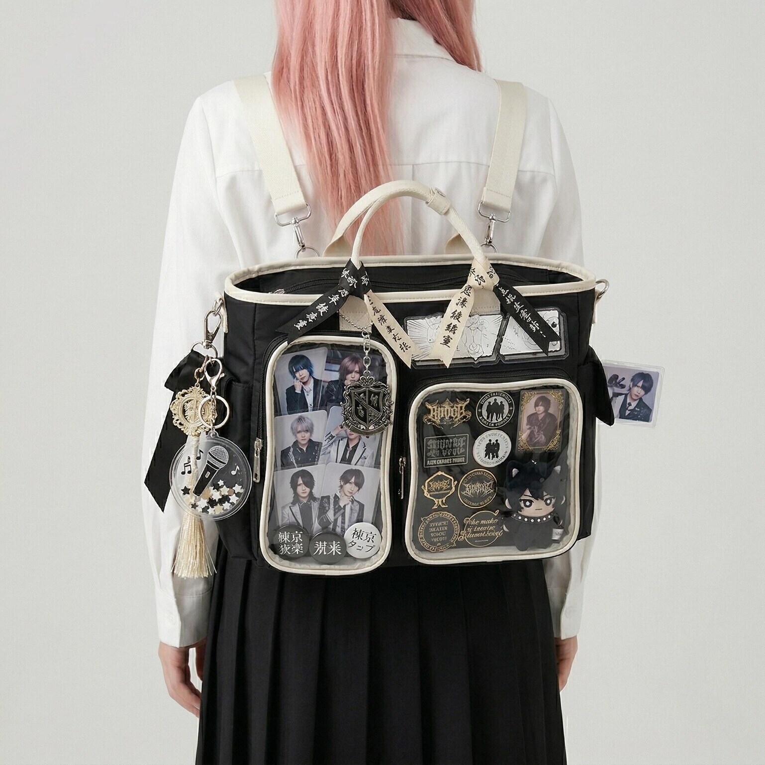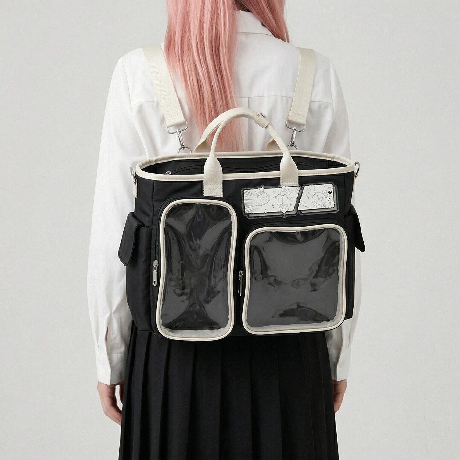 Large Black Kawaii Y2K Ita Backpack with Clear Window for Photocards and Pins gives you a clear, secure way to display photocards, pins, and small accessories while carrying daily essentials.