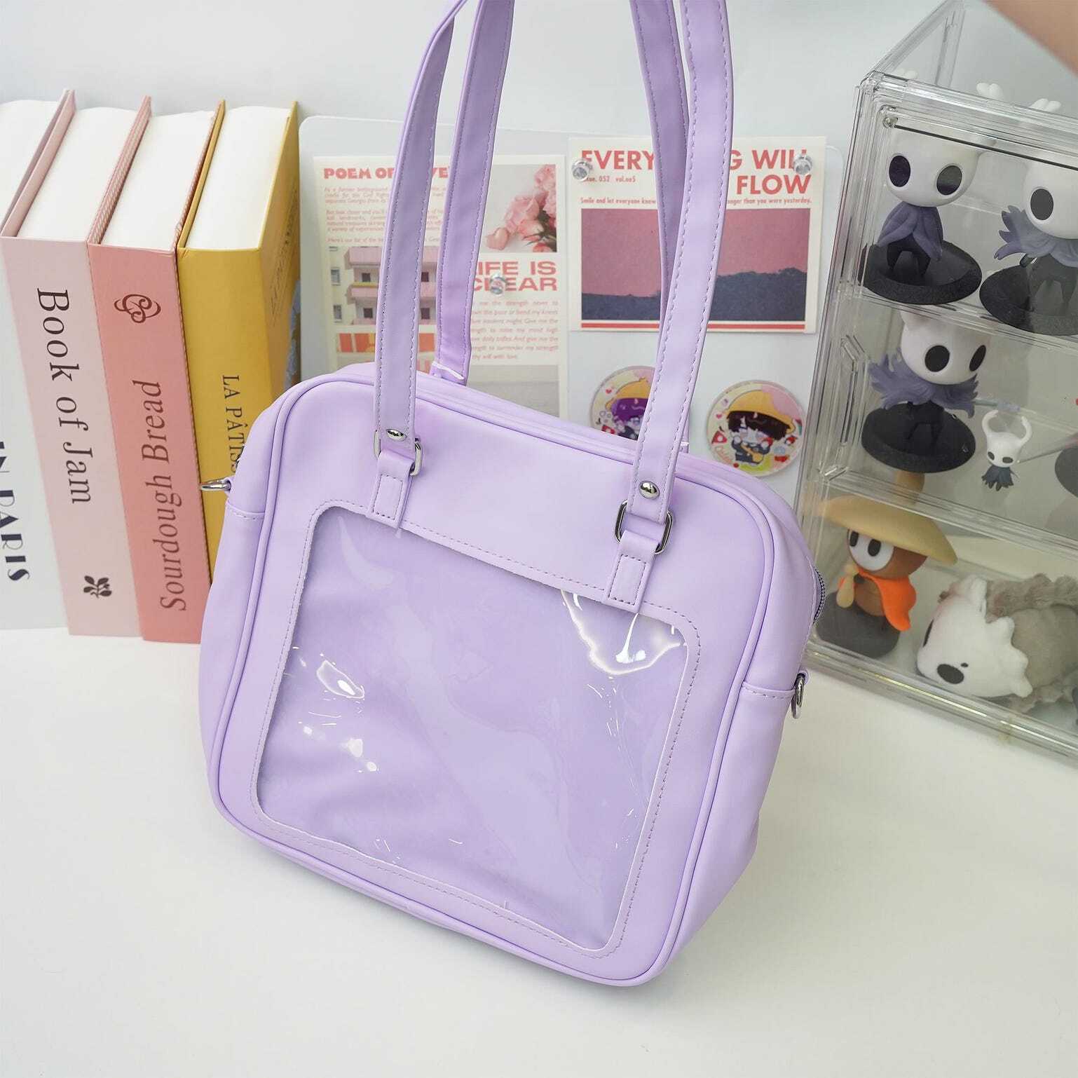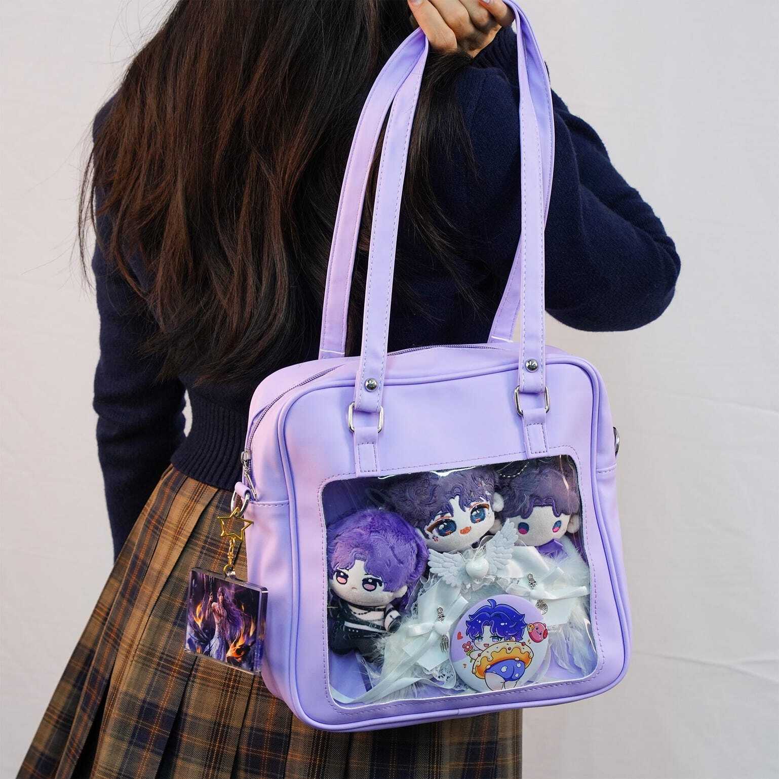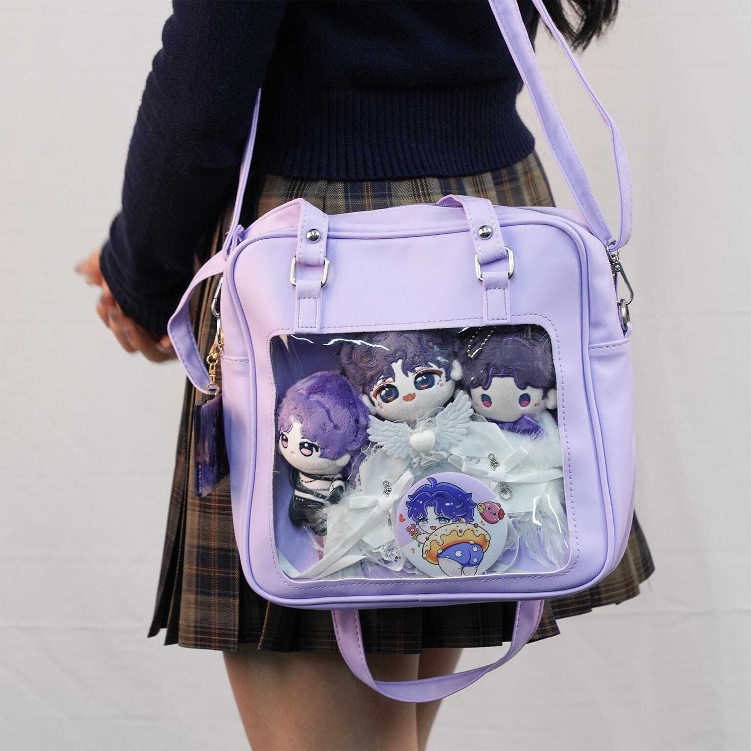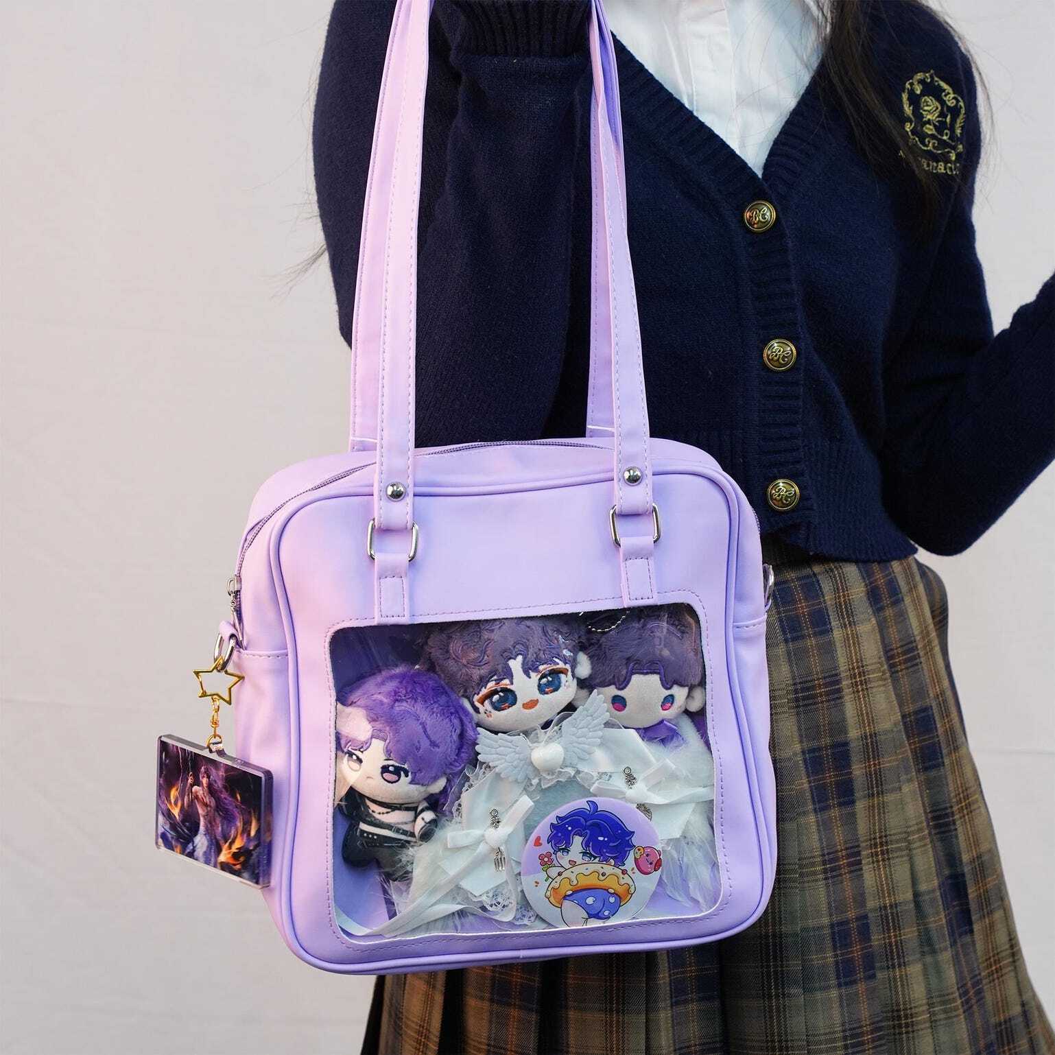 Embrace the cute kawaii vibe with this compact, glossy ita bag-available in Blue, Lilac, and Pink! Perfect for showing off your favorite pins, charms, or small merch while staying stylish.