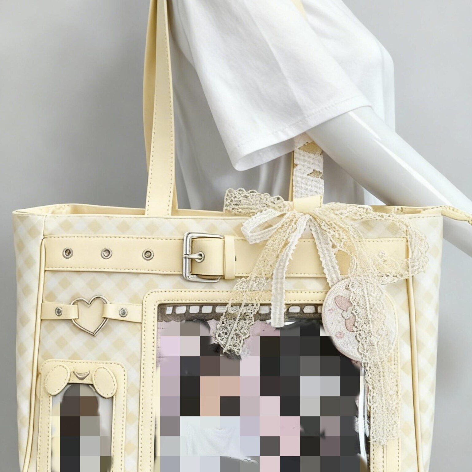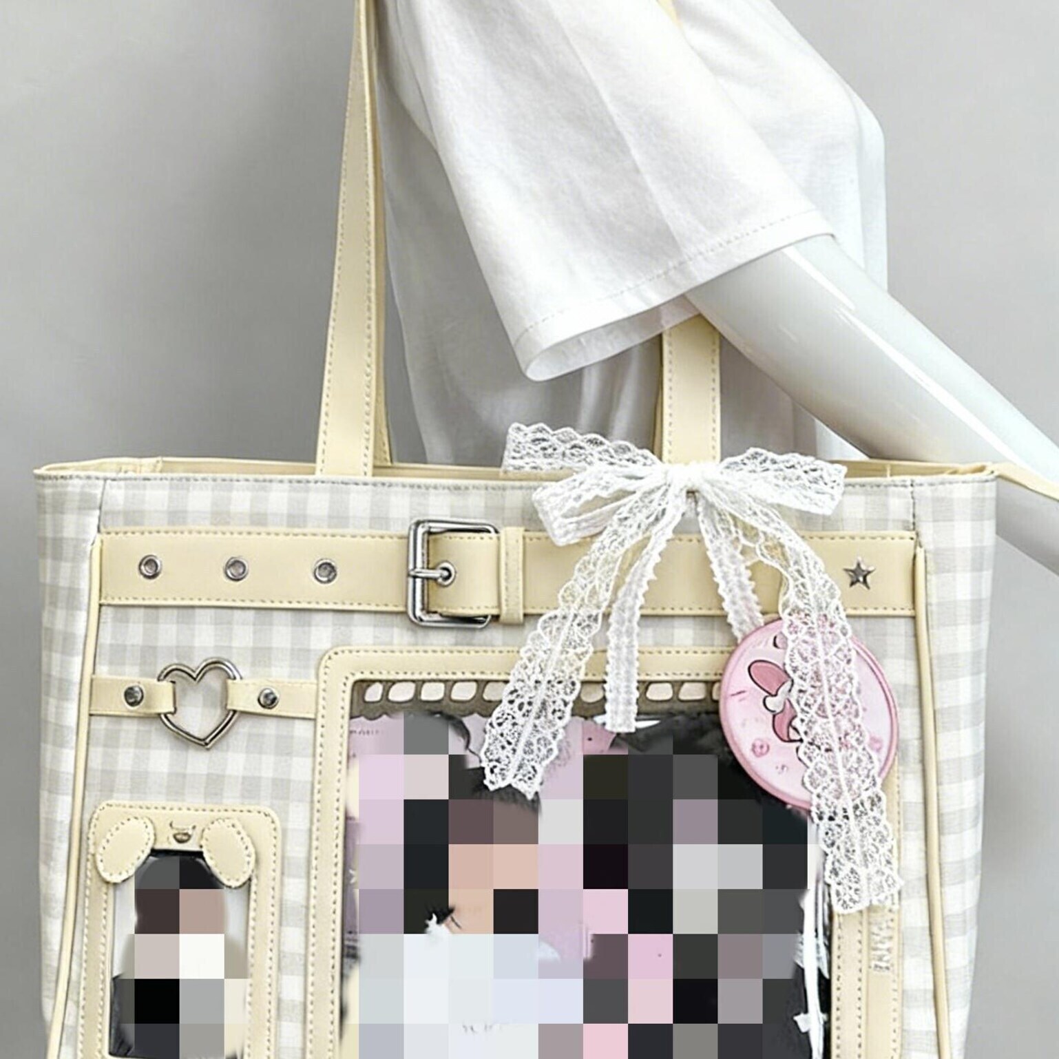 Large Pink Y2K Ita Shoulder Bag with Clear Window for Plushies and Pins is designed to display plushies, dolls, pins, and badges while keeping everyday essentials organized.