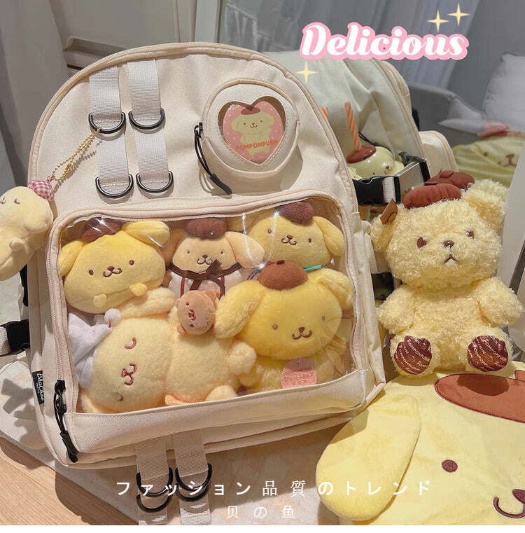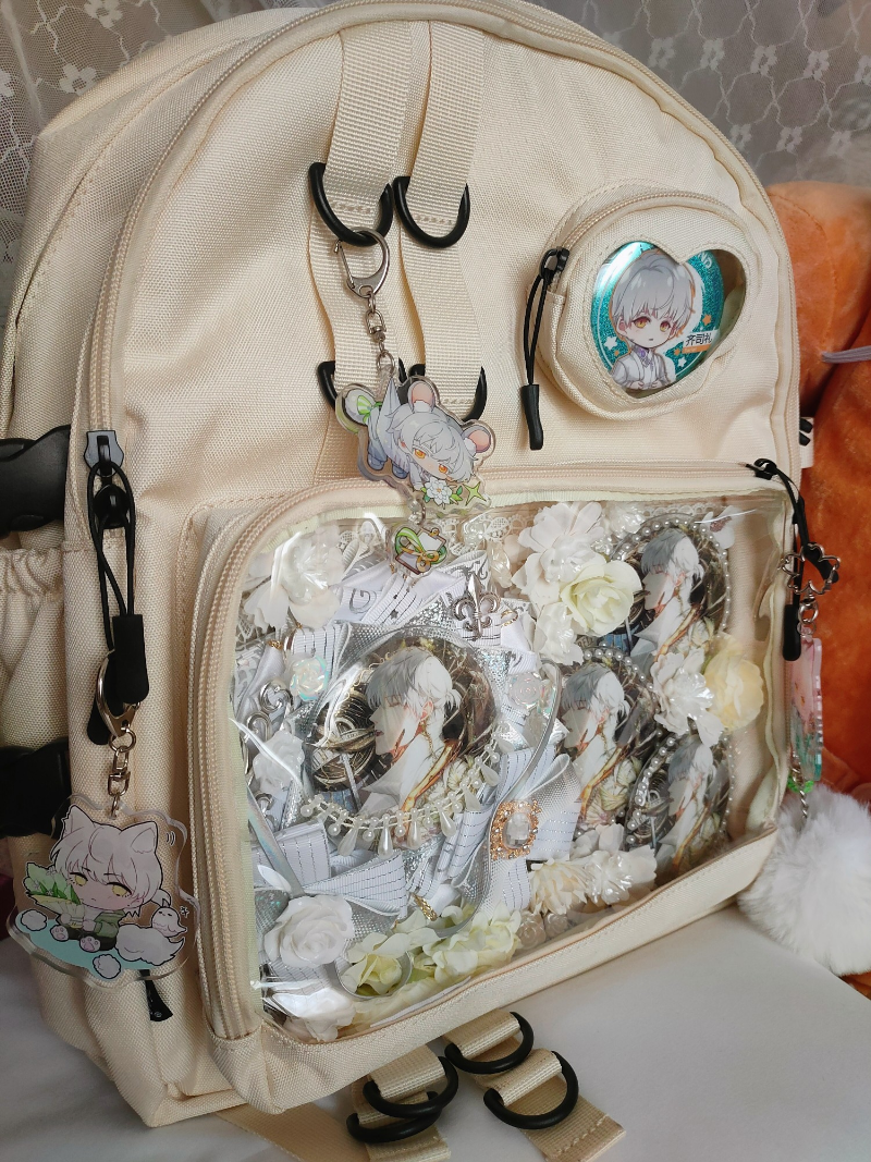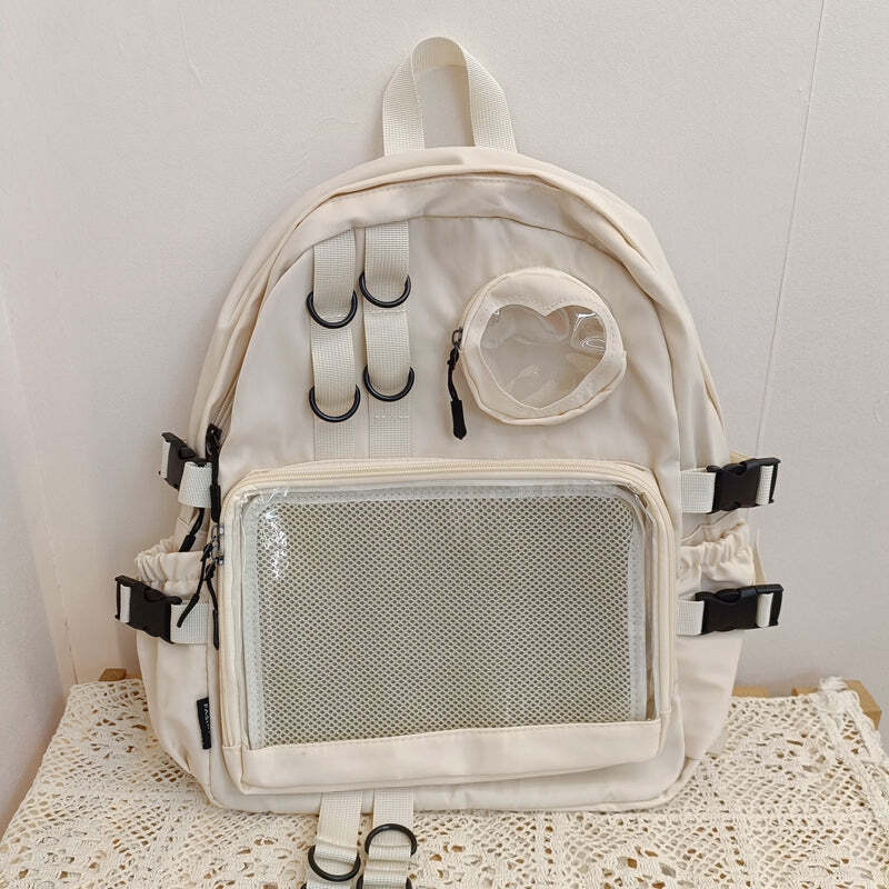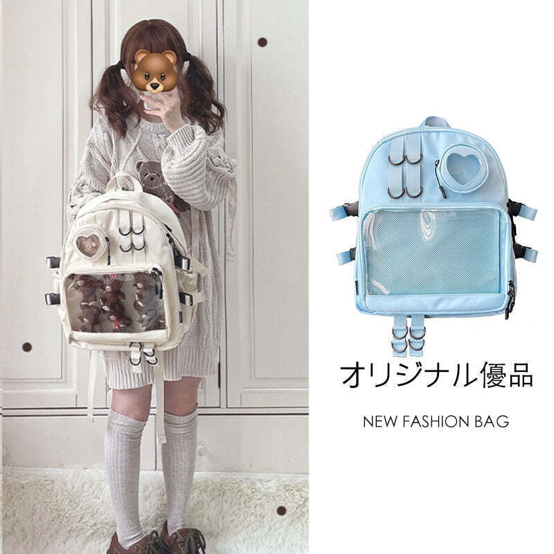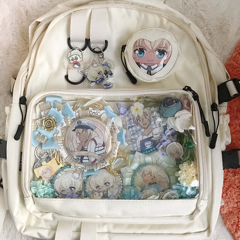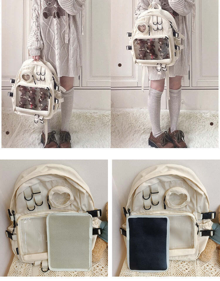 Large White Kawaii Ita Backpack with Clear Window and Included Insert for Pin Display combines everyday carry with a clear display area for pins, badges, charms, or character merch.