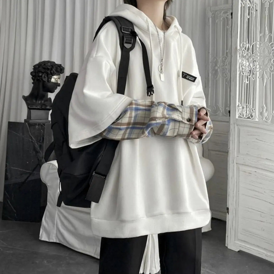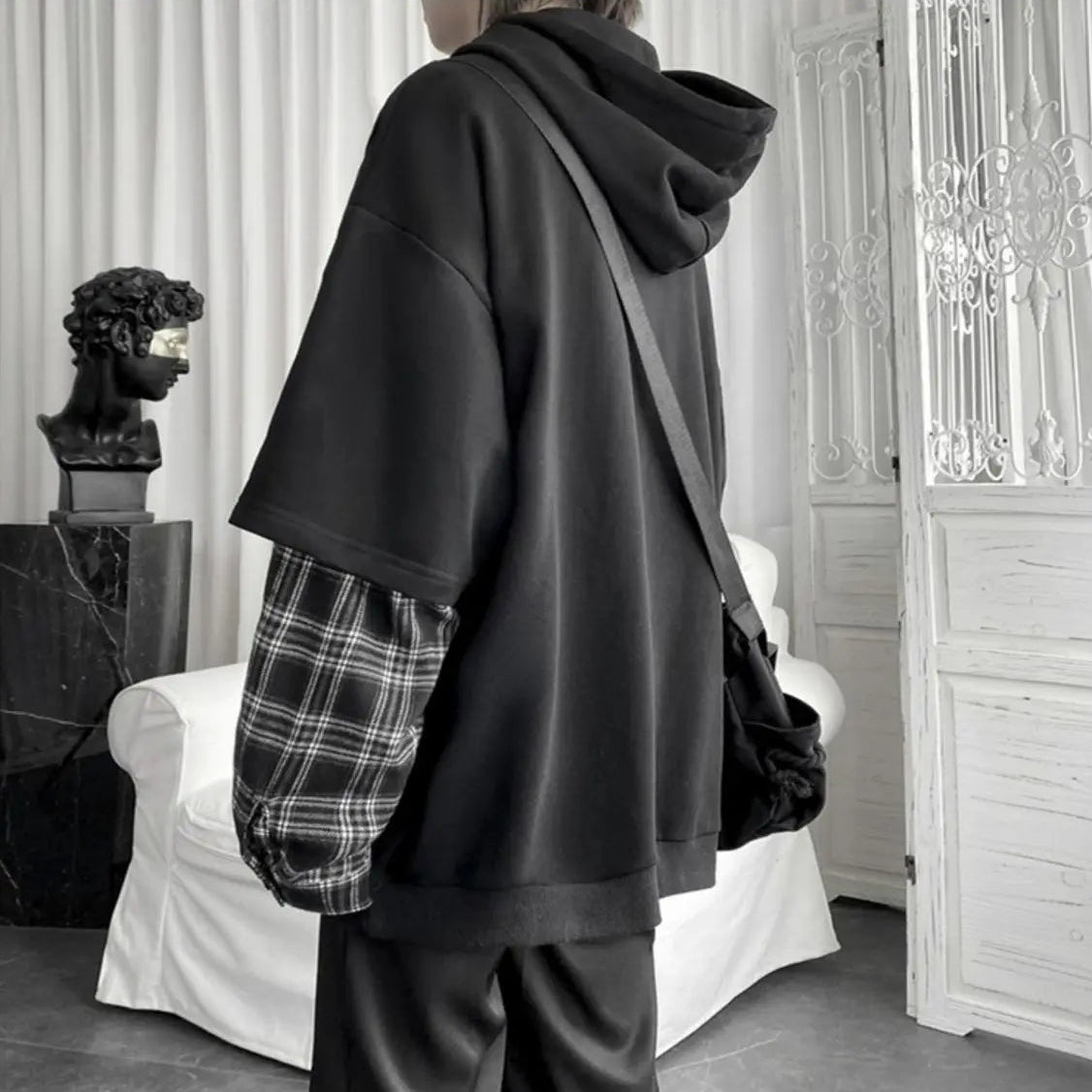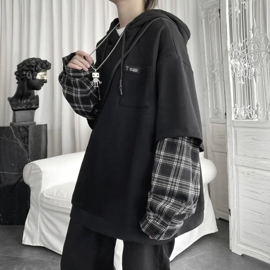 Layered Plaid Sleeve Hoodie