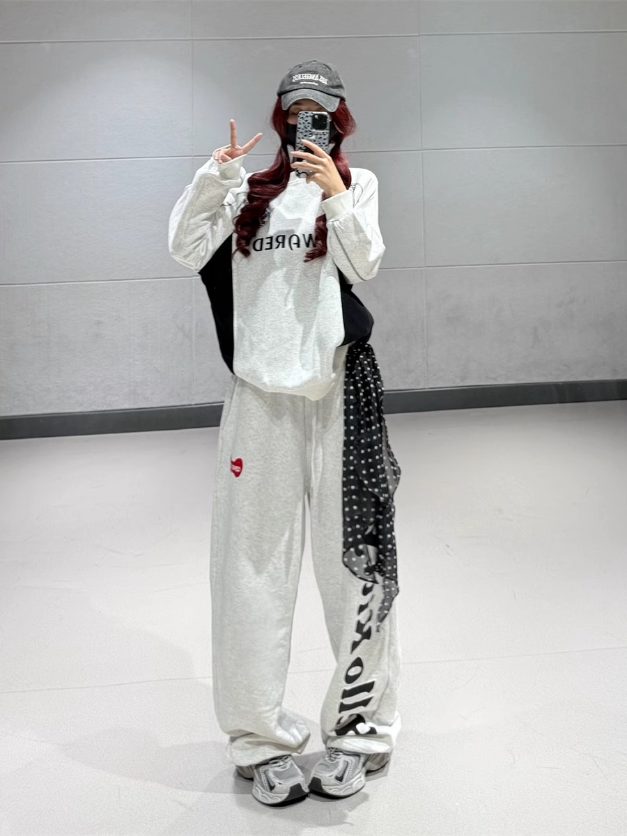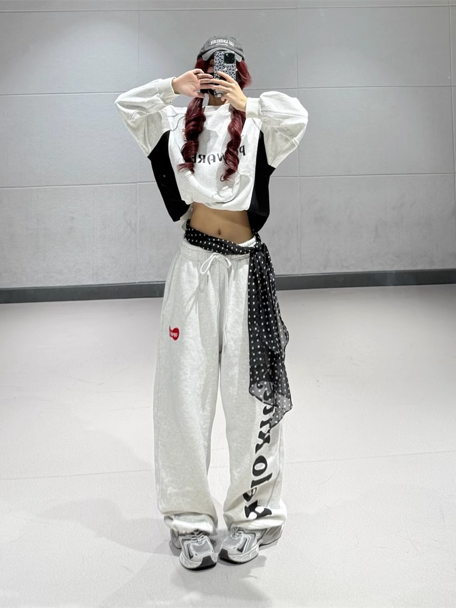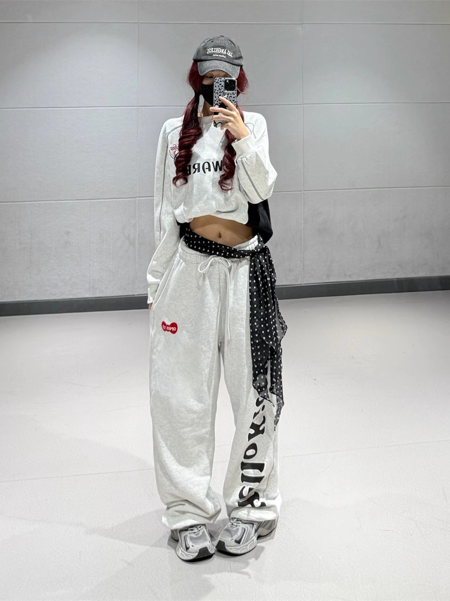 | Color | Polka dot waist tie, White gray lettered sweatpants, White gray sweatshirt |
