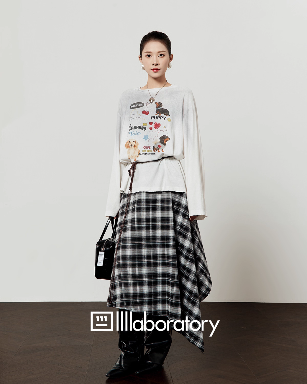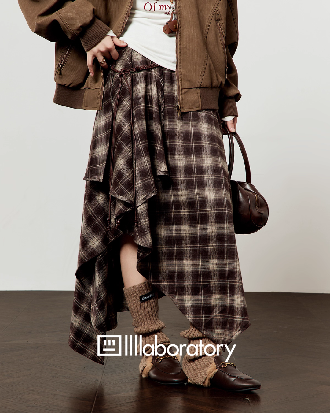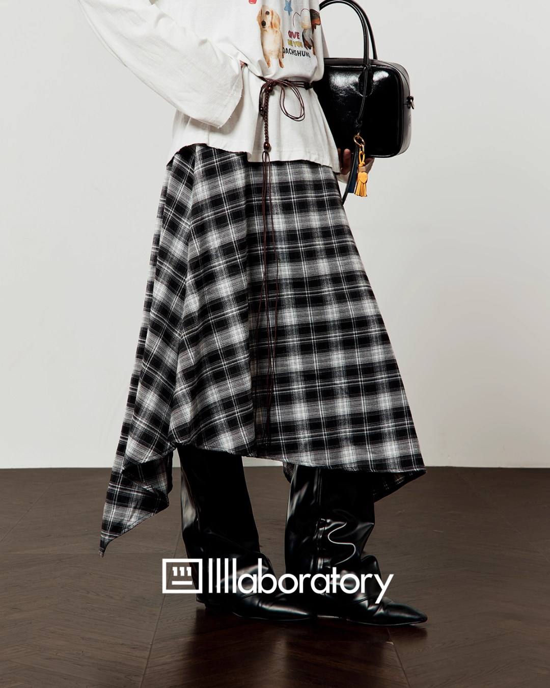 The check-patterned skirt has a trendy asymmetrical hemline.