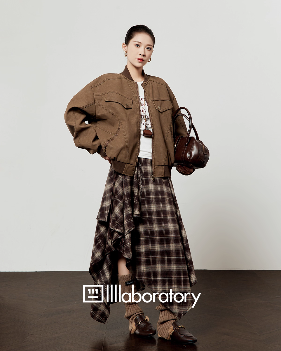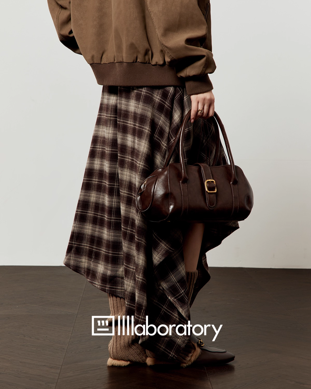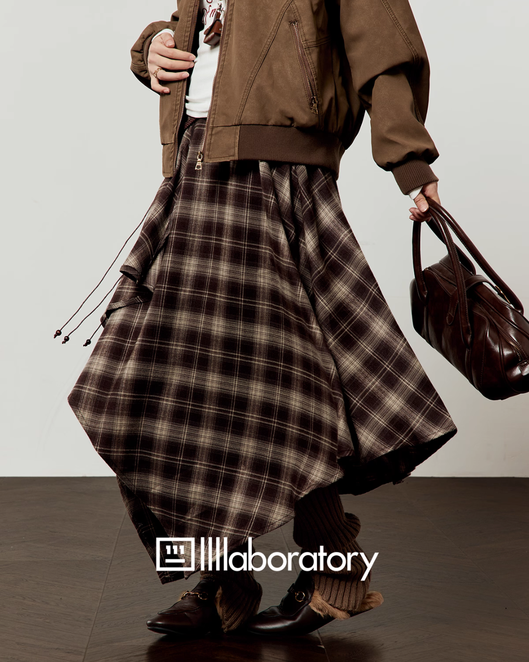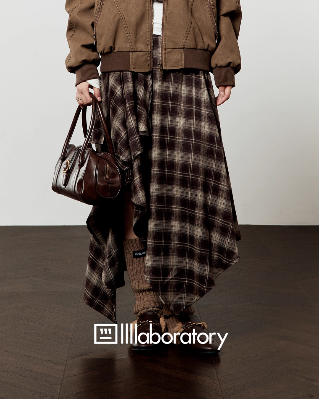 The check-patterned skirt has a trendy asymmetrical hemline.