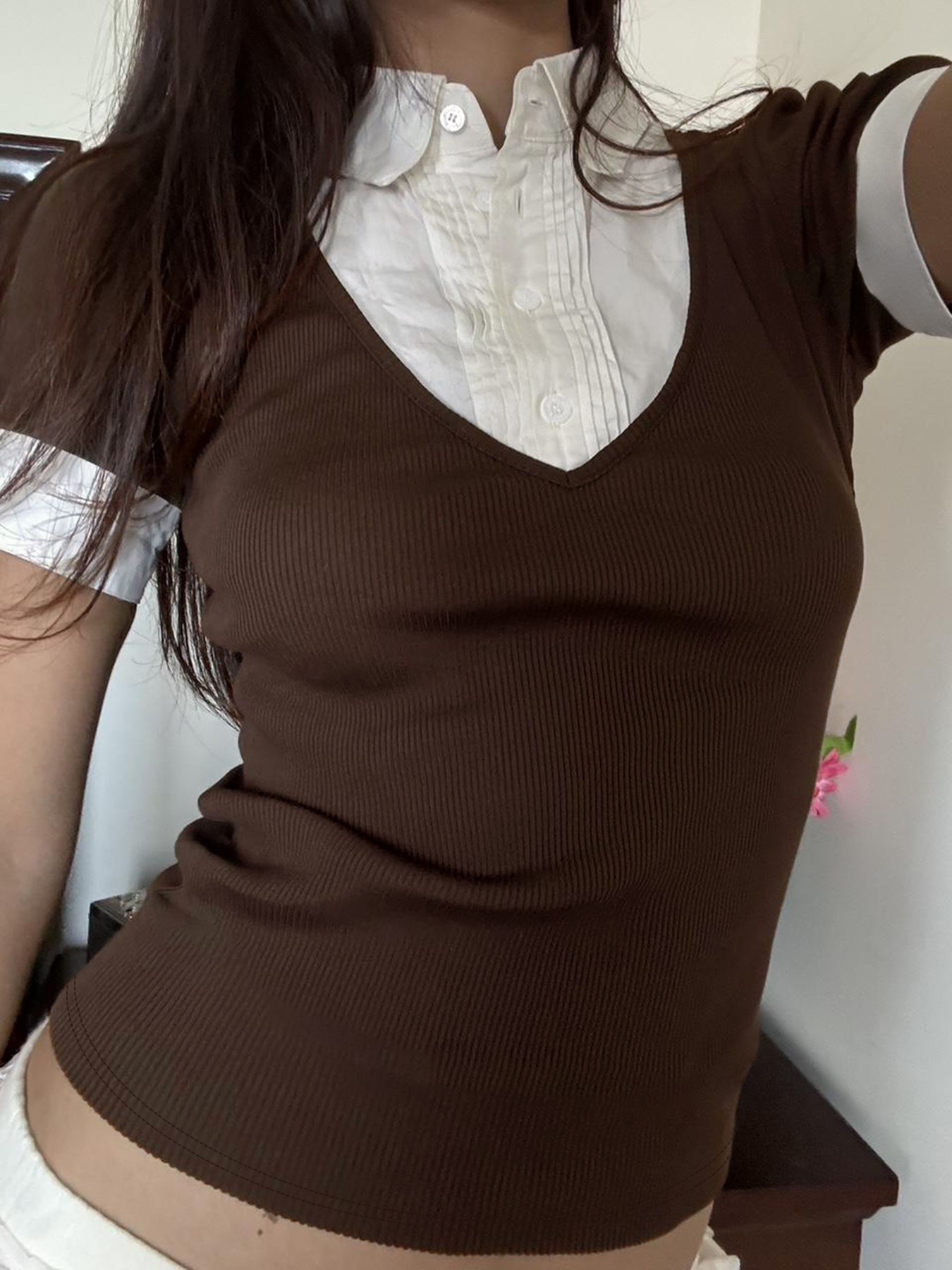Be the first to review “Casual Faux Two Polo Collar Top Women Ribbed Knitted Slim Fit Short Top, Y2K” Cancel reply