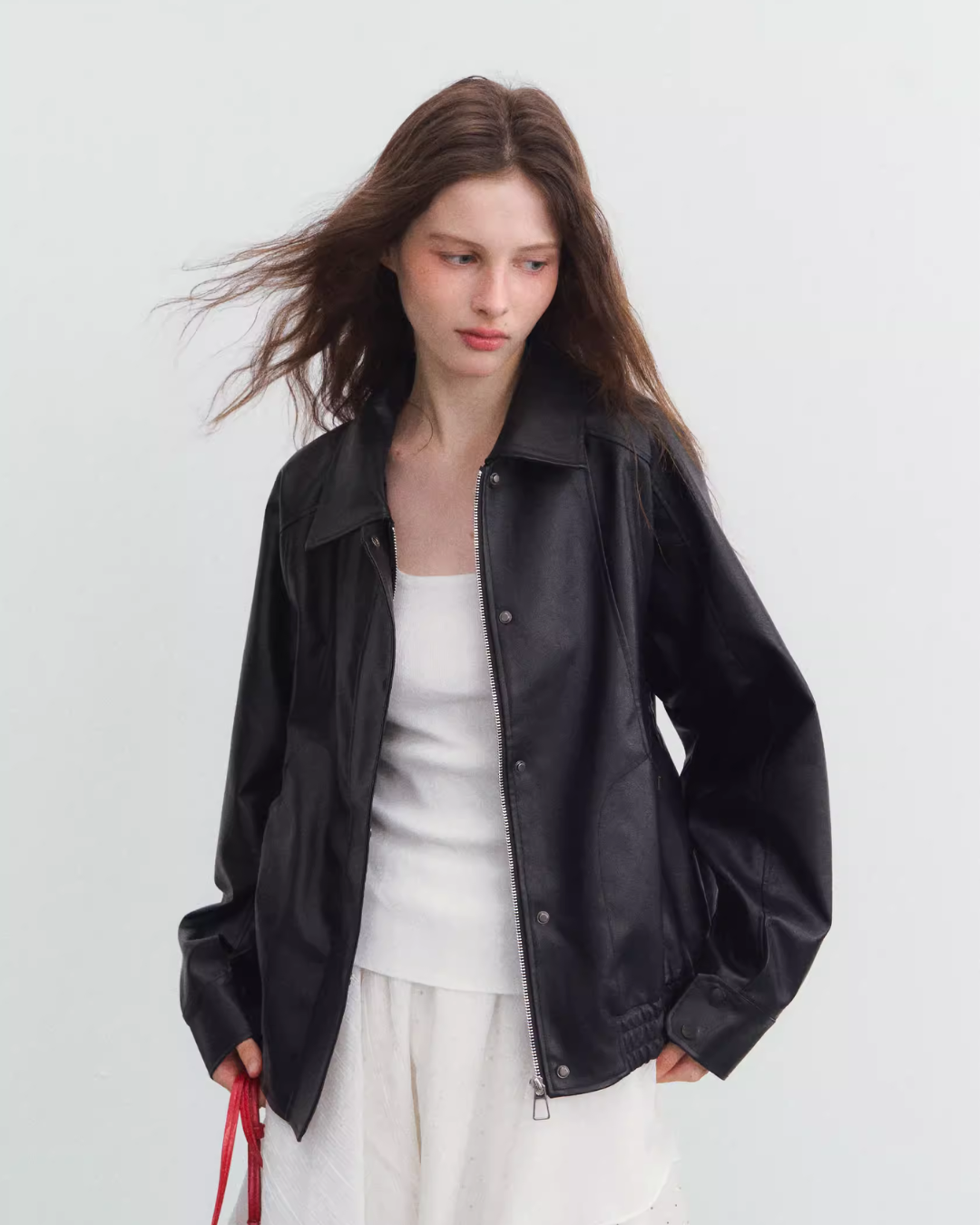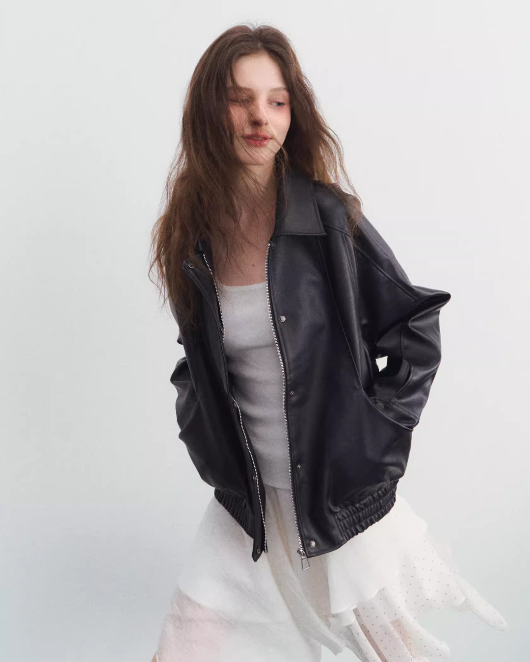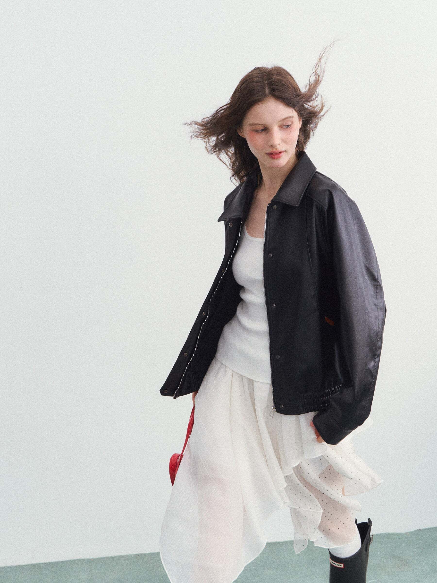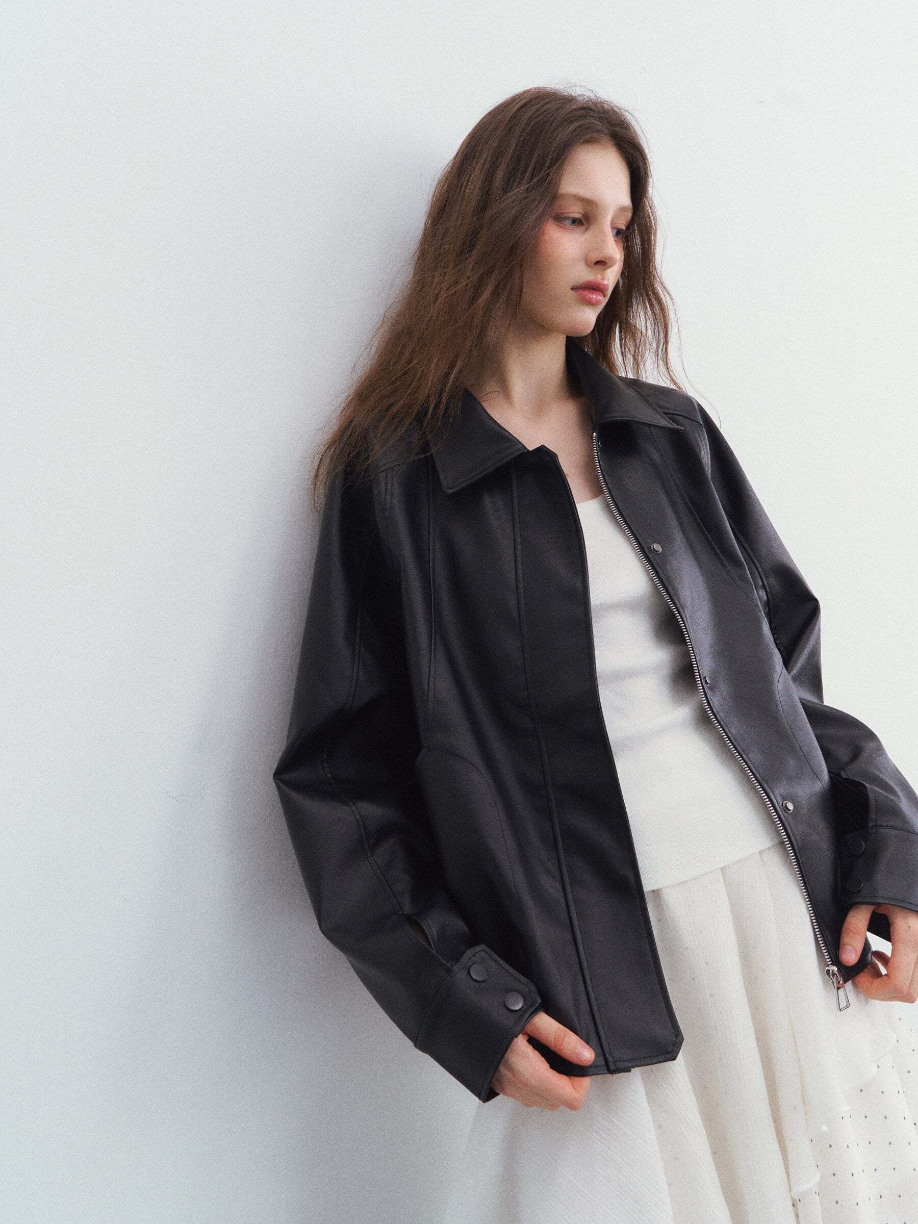 Enjoy a men’s-like styling with this oversized faux leather jacket.
