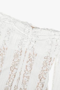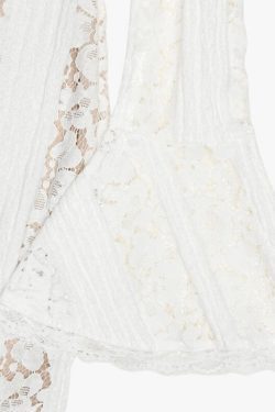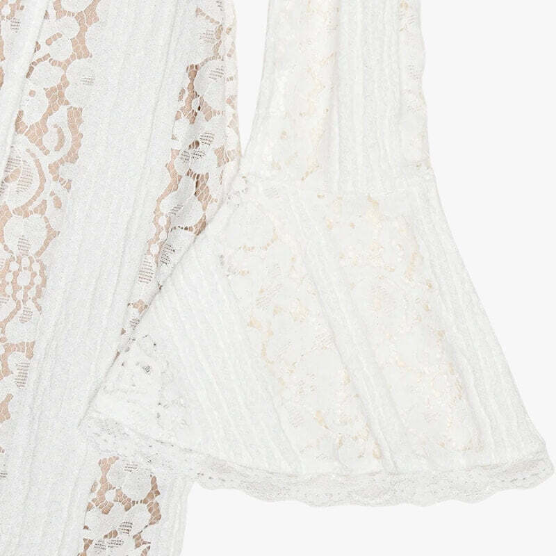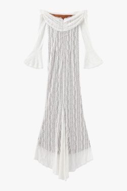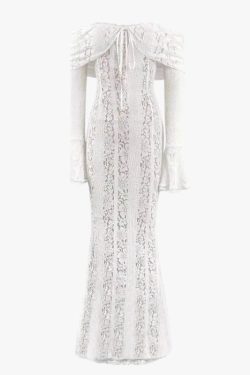 Off-Shoulder Lace Maxi Dress features a full-length silhouette with a semi-sheer lace overlay layered over a soft lining. The off-shoulder neckline sits evenly across the collarbone, while long flared sleeves add balanced coverage. Vertical lace panels create subtle structure through the body. The fitted upper section transitions into a fluid hemline, allowing natural movement without stiffness.
