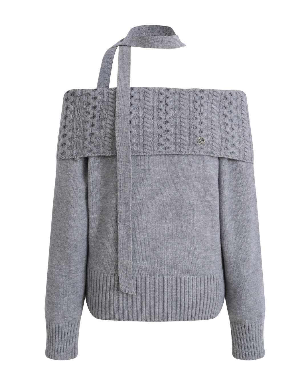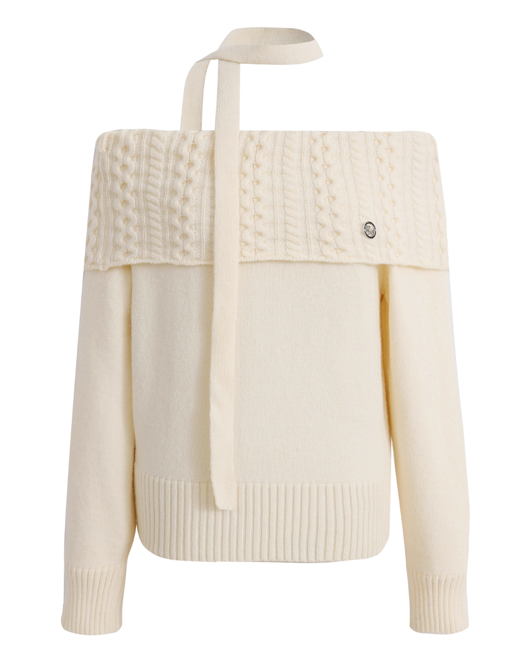 The top has a folded off-shoulder design that gives a trendy impression.