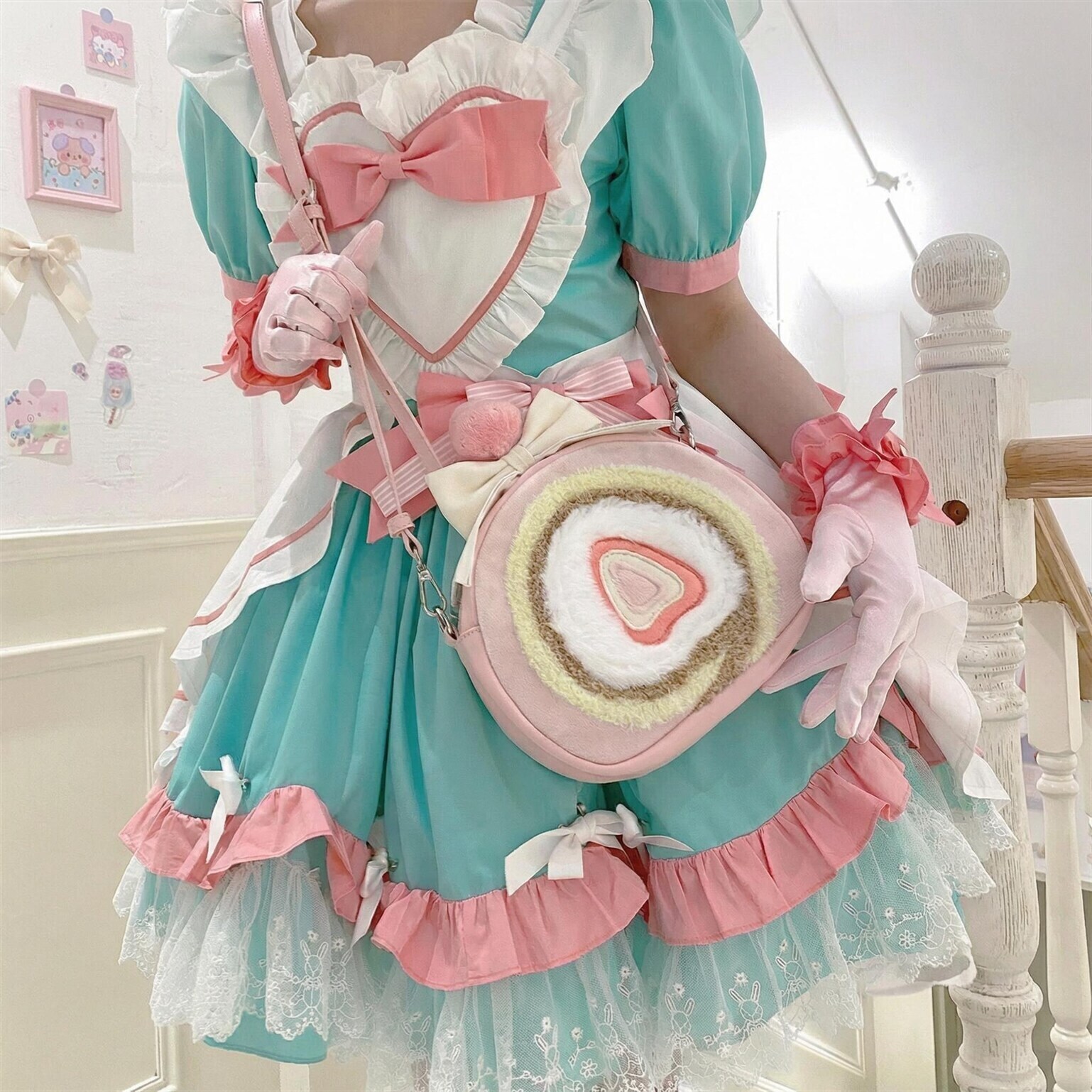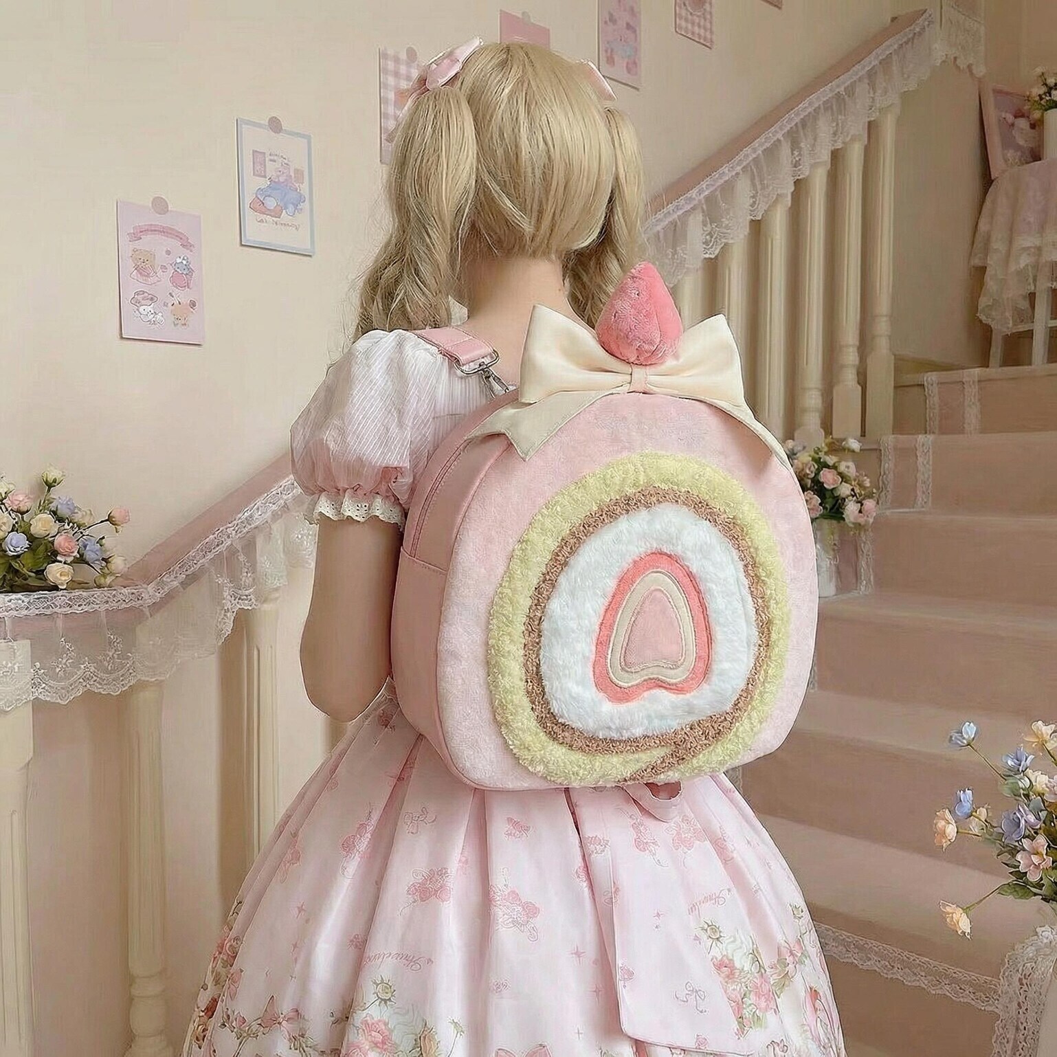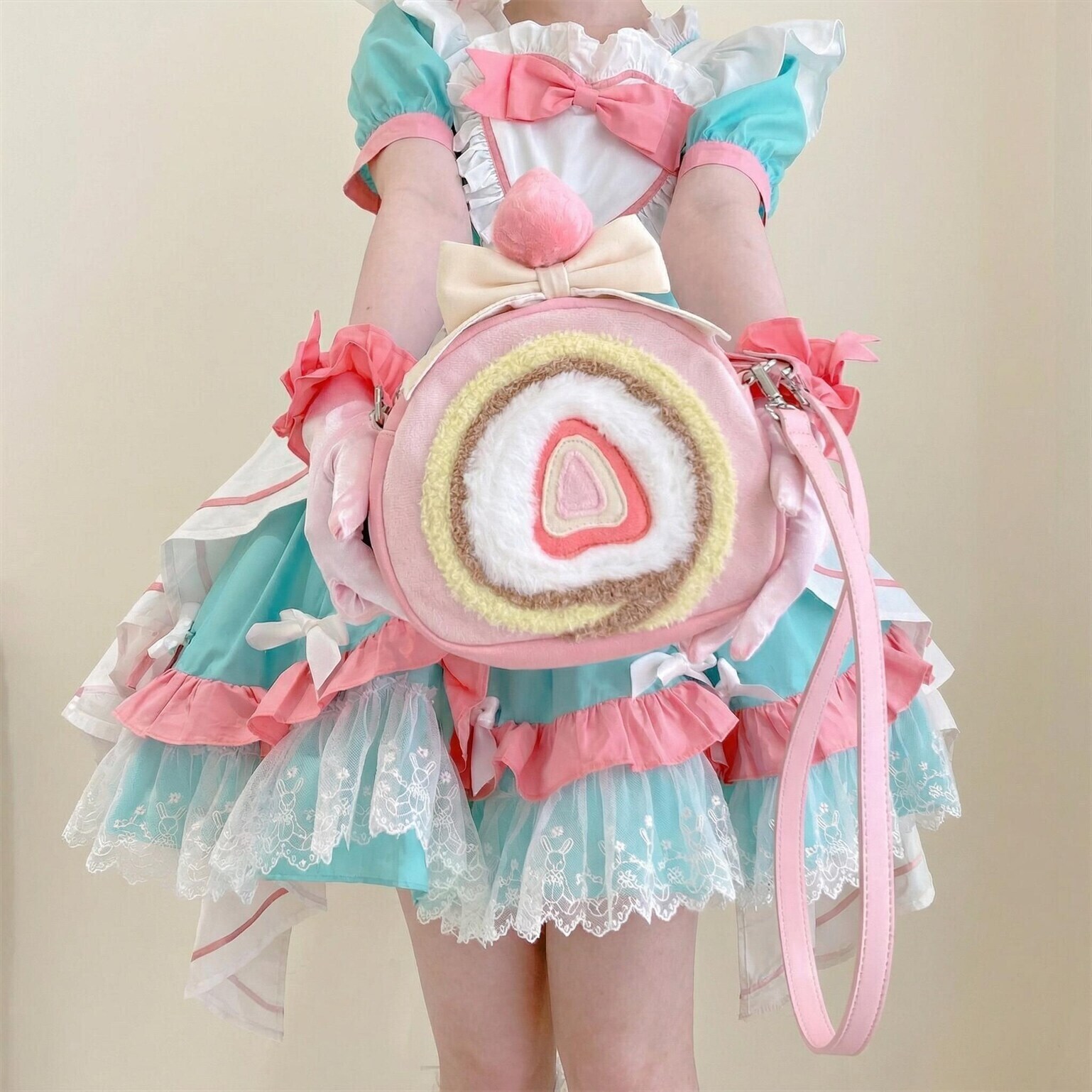 This strawberry cake roll inspired plush bag brings a soft, whimsical touch to your everyday outfits. Designed with a fluffy cake roll texture and pastel strawberry theme, it captures the charm of kawaii and Lolita style fashion while adding a fun statement to your look.