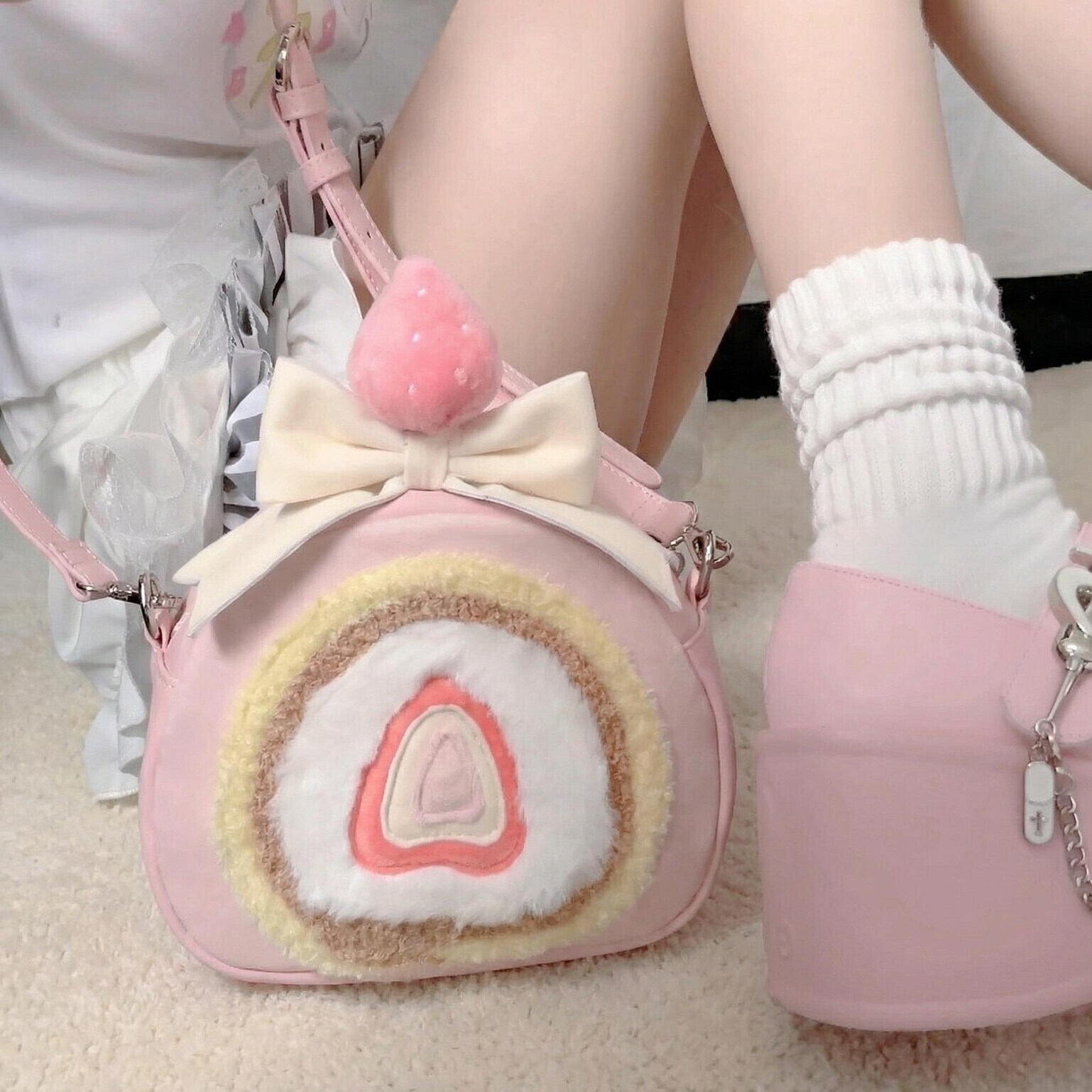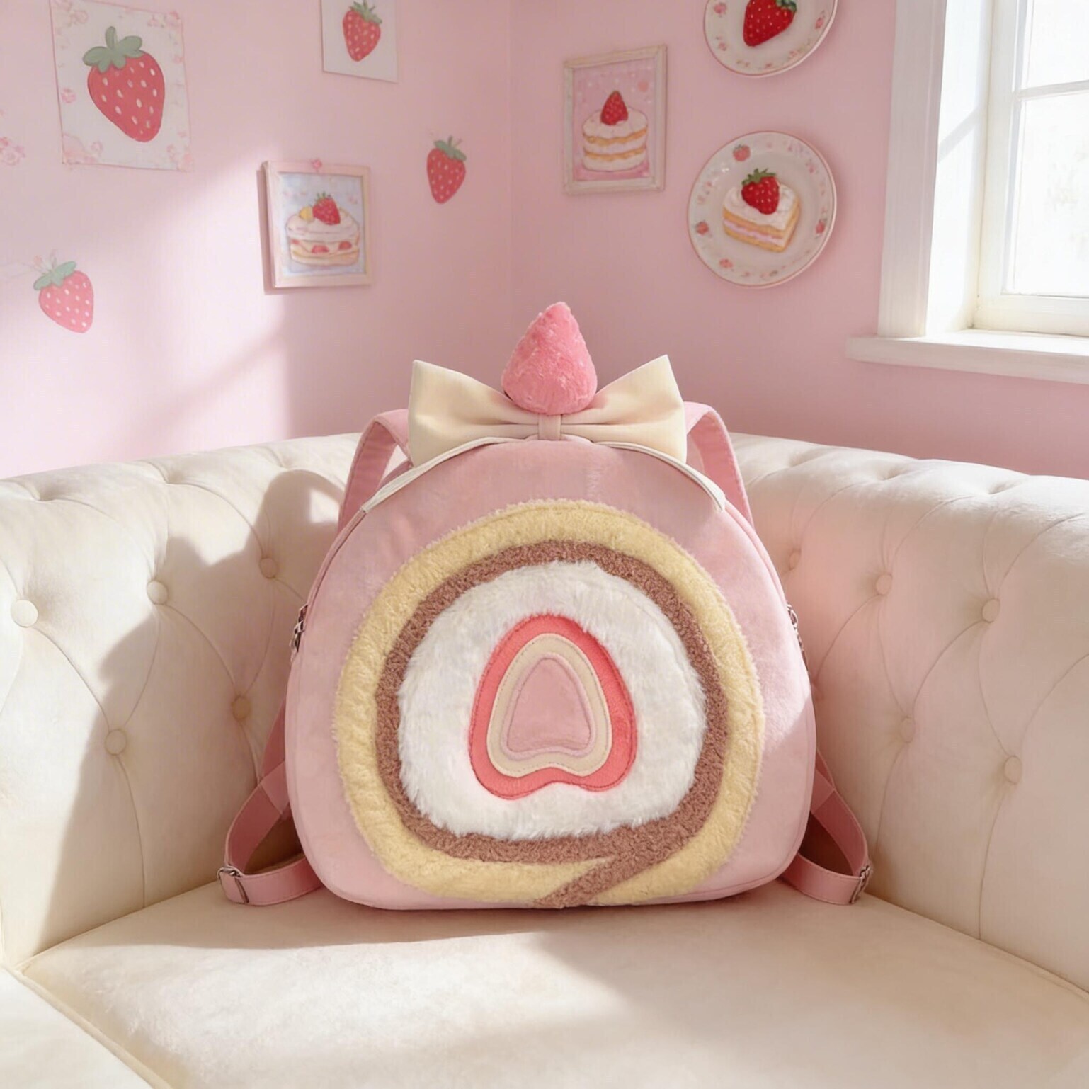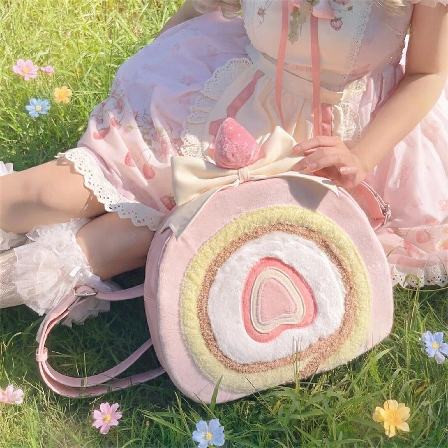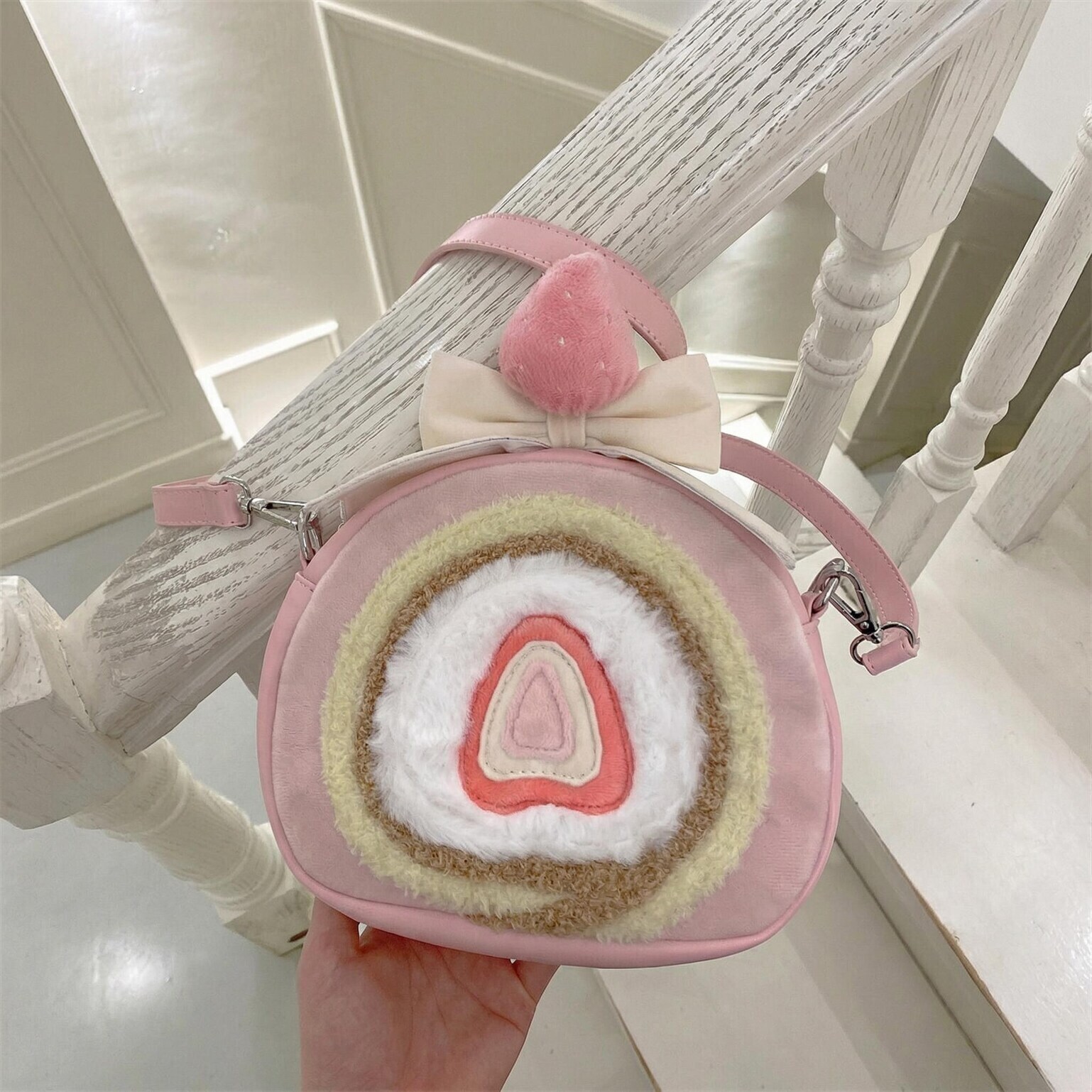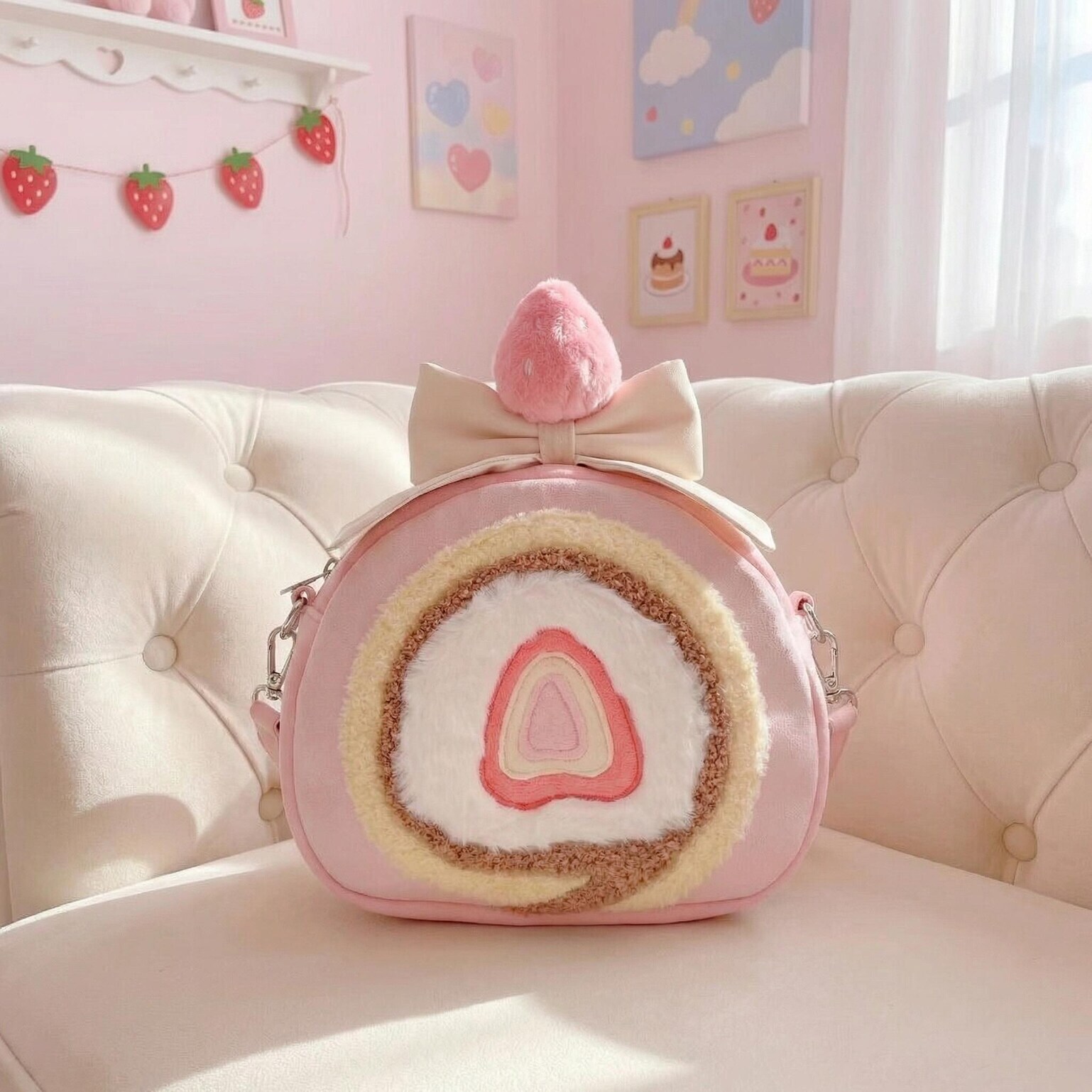 A playful strawberry cake roll inspired bag that blends kawaii charm with versatile everyday styling.