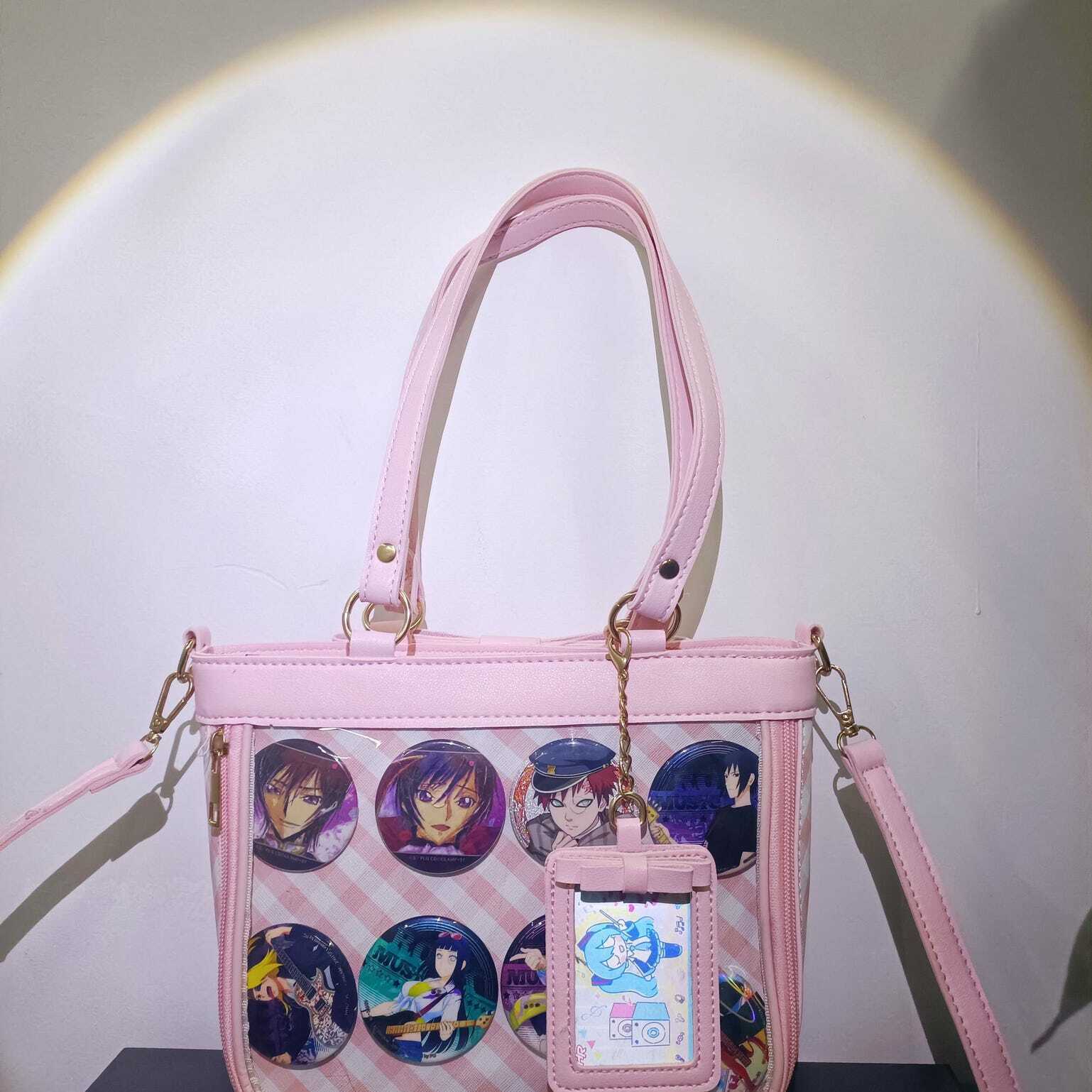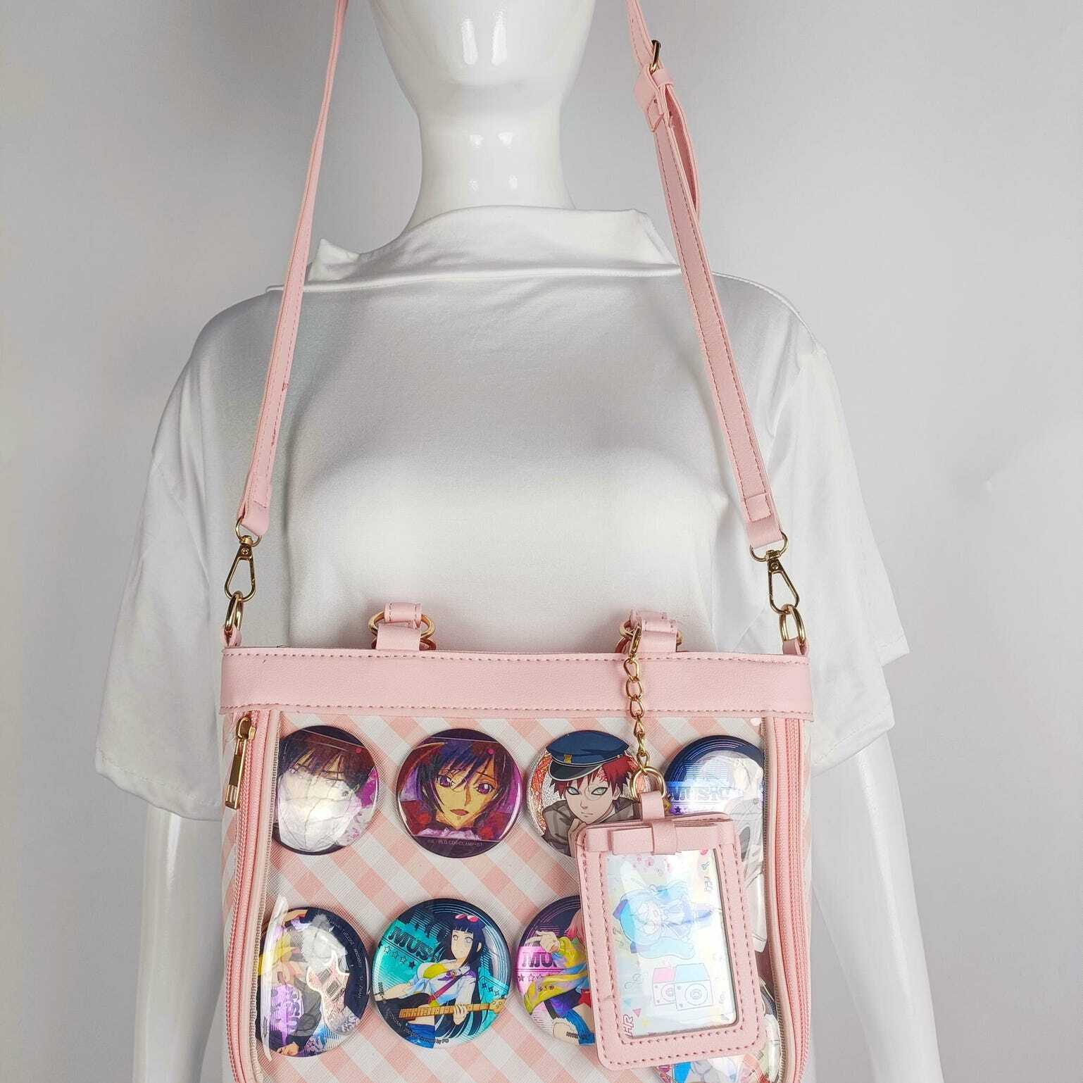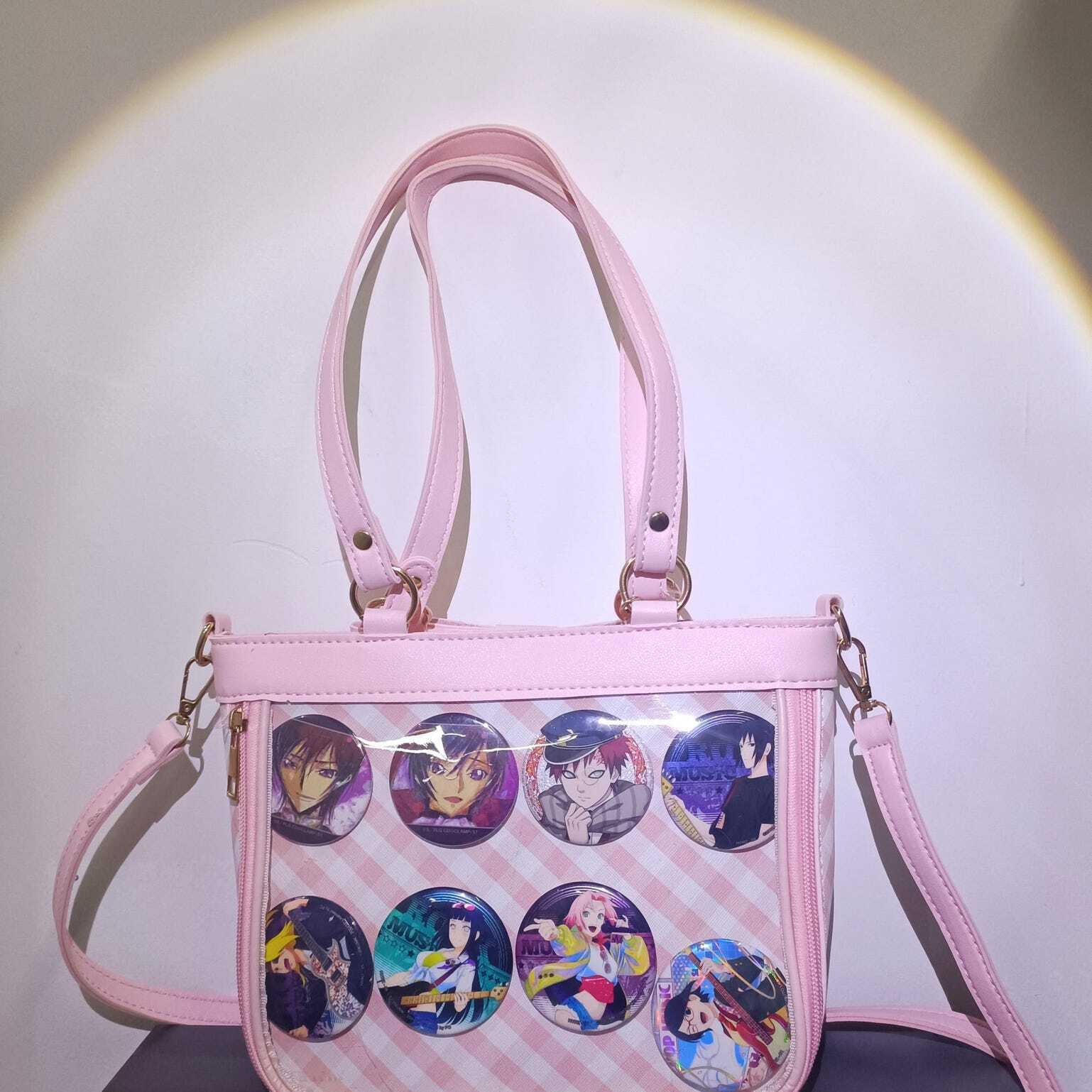 Pink Convertible Ita Bag with Clear Window for Pin Display combines everyday carry with a clear display area for pins, badges, charms, or character merch.