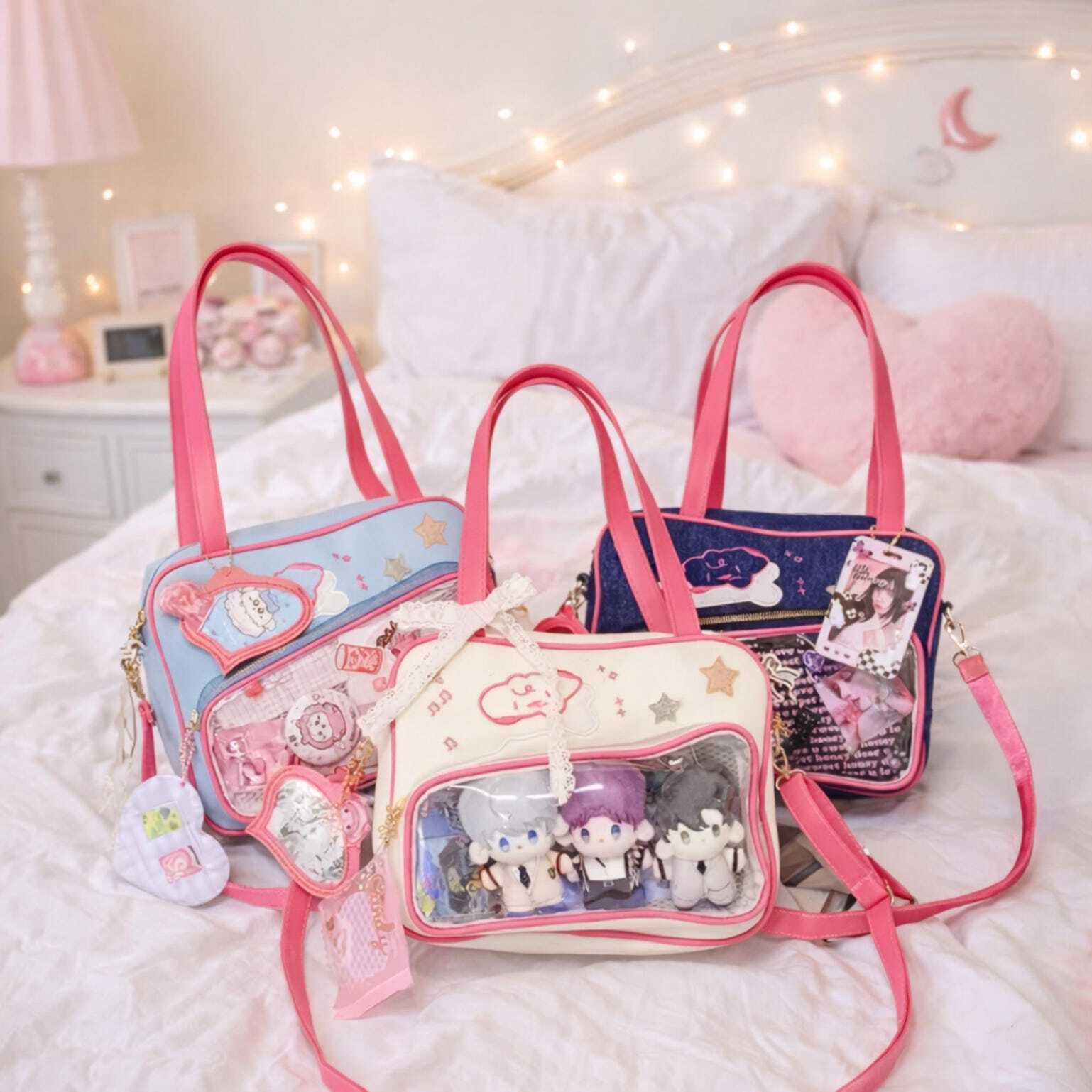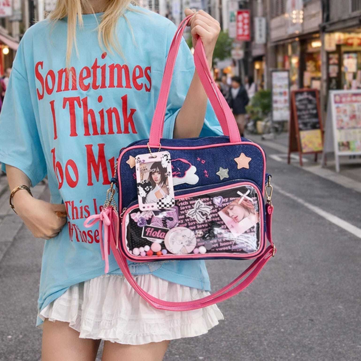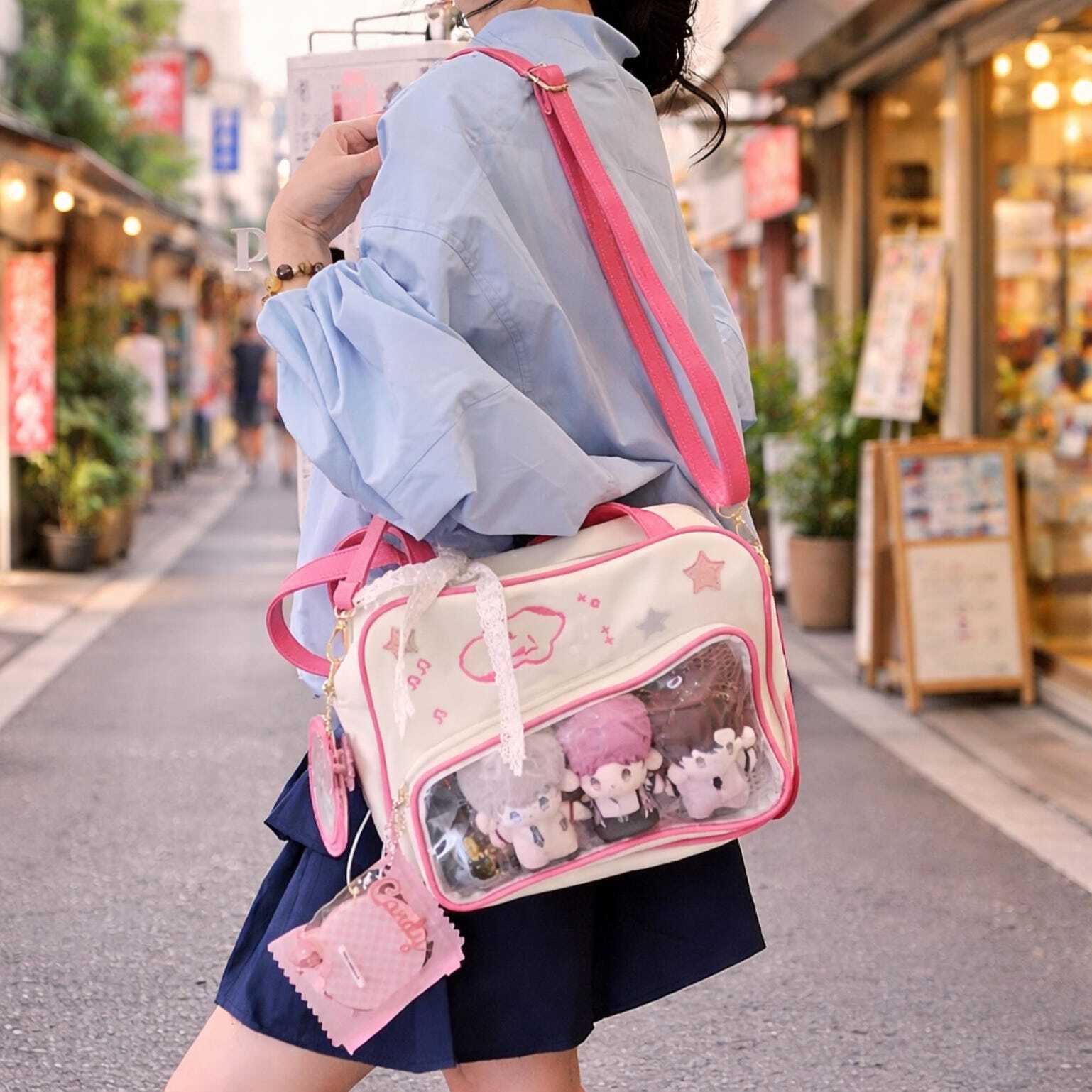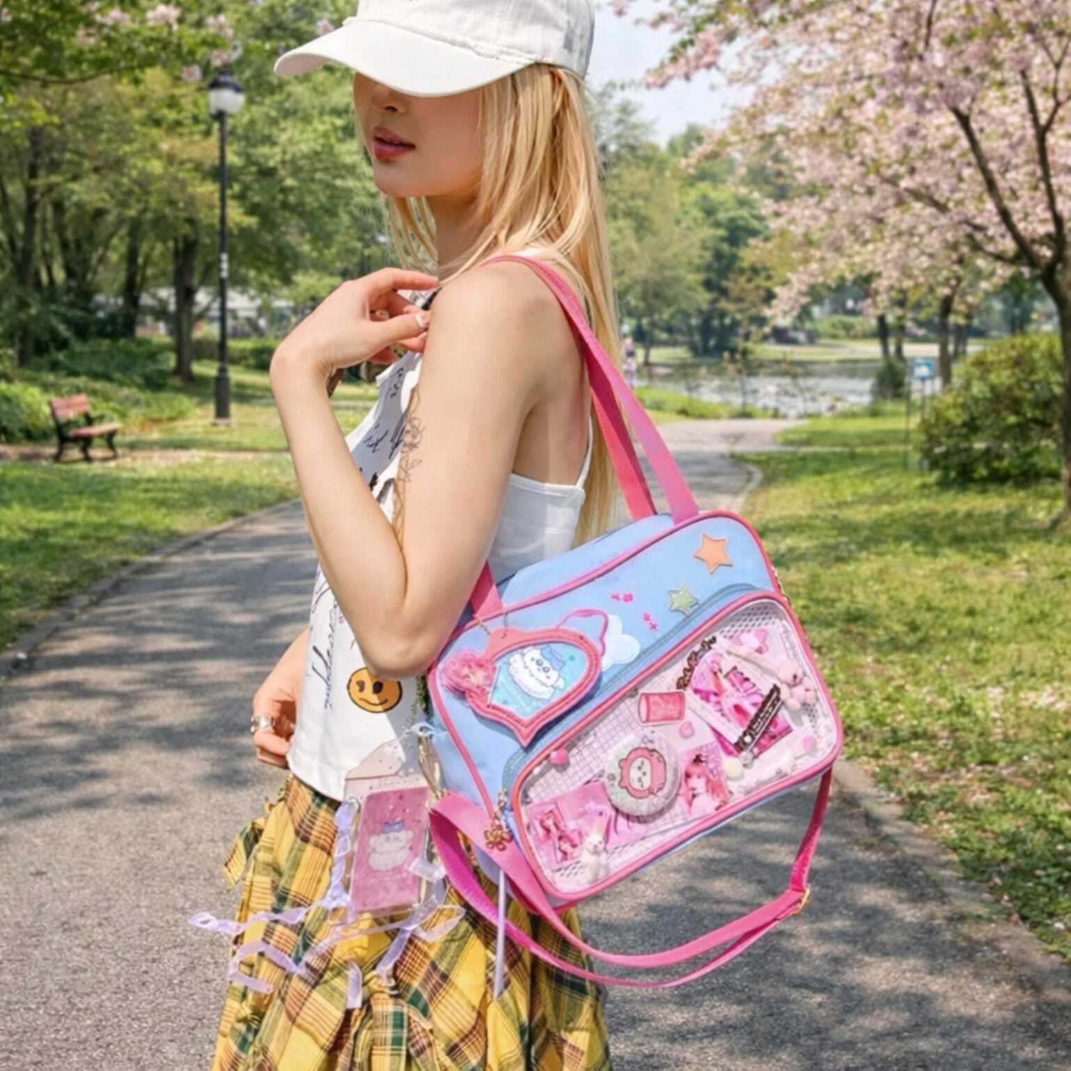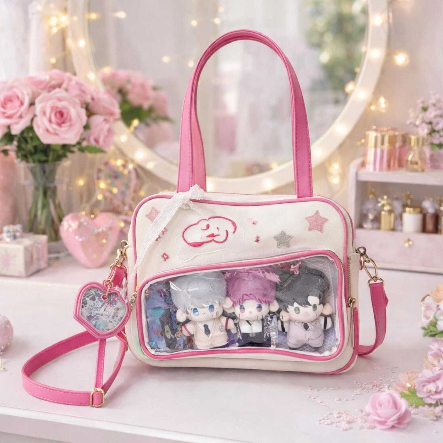 Pink Heart Convertible Ita Bag for Plushies and Pins combines everyday carry with a clear display area for pins, badges, charms, or character merch.