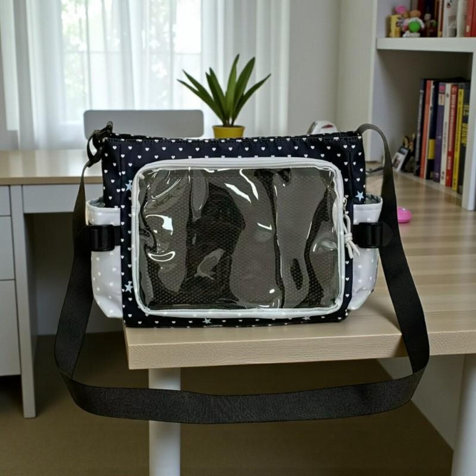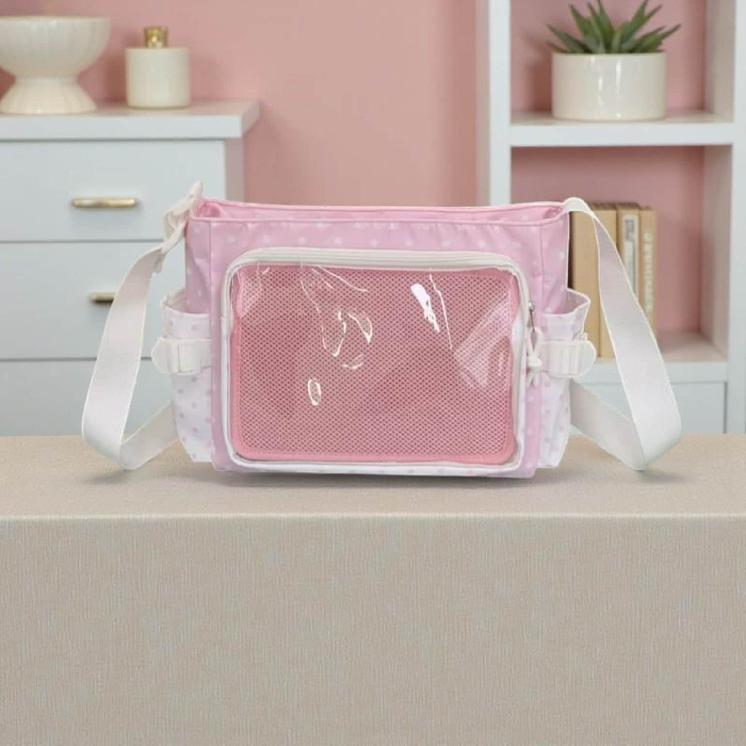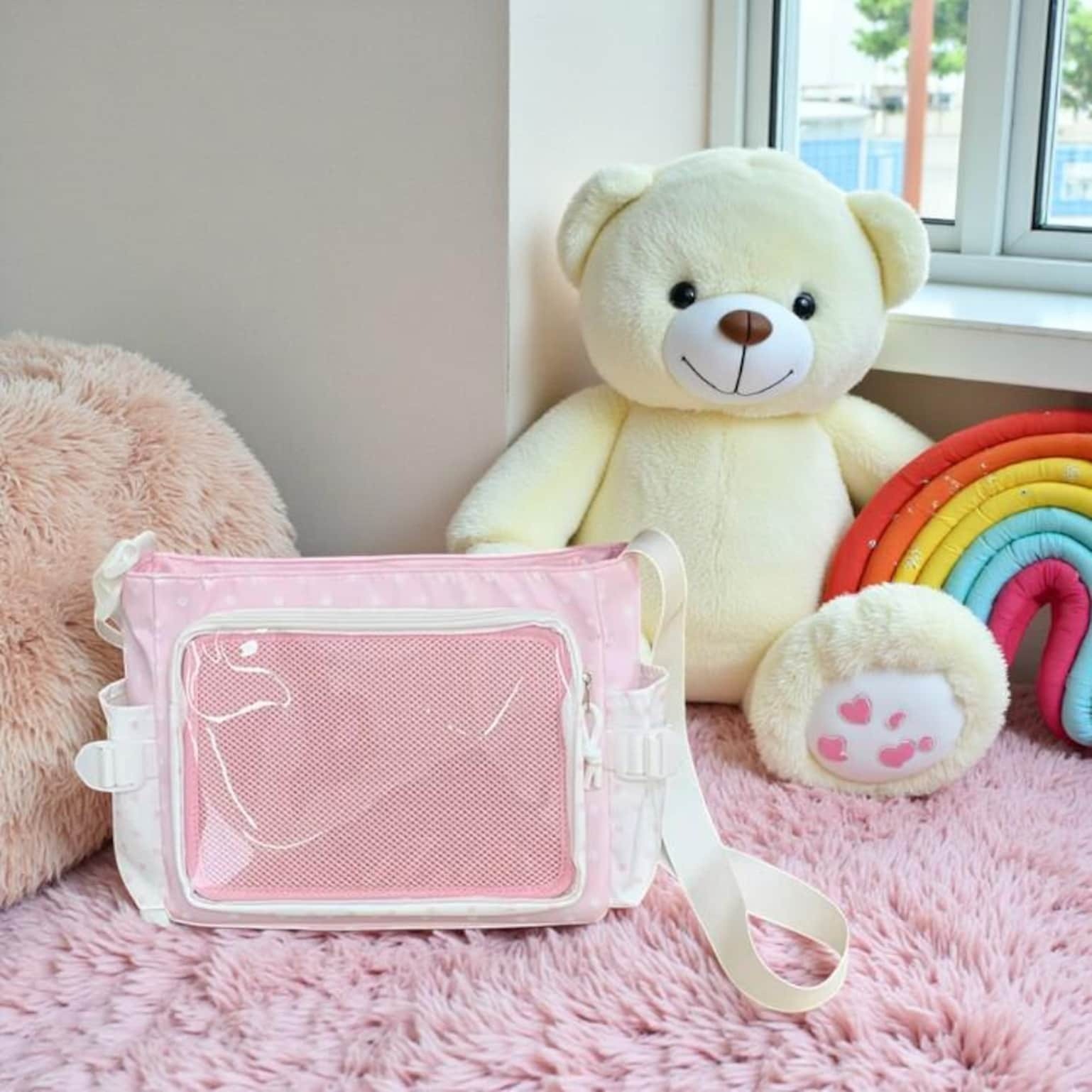 Pink Kawaii Convertible Ita Bag with Clear Window for Pin Display combines everyday carry with a clear display area for pins, badges, charms, or character merch.