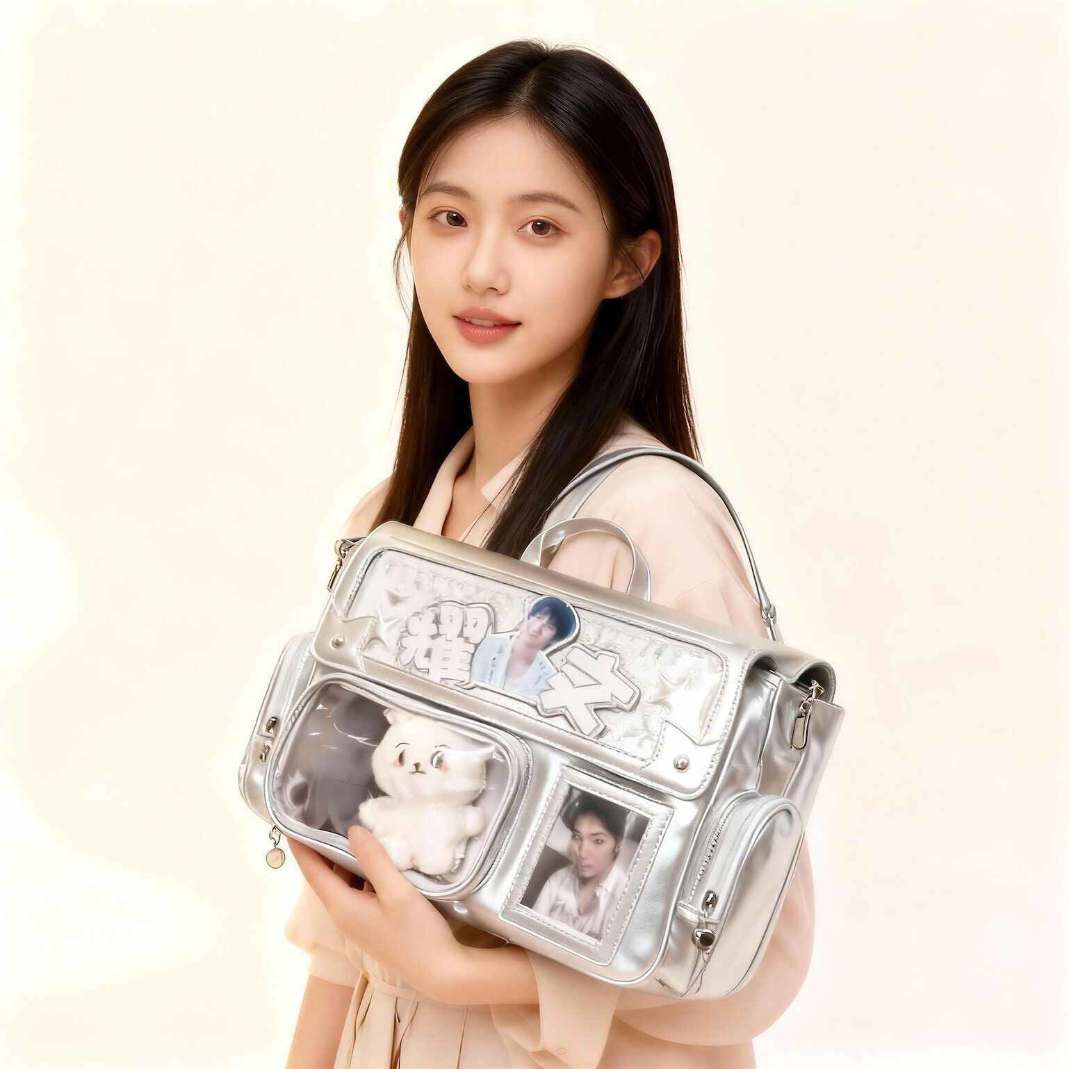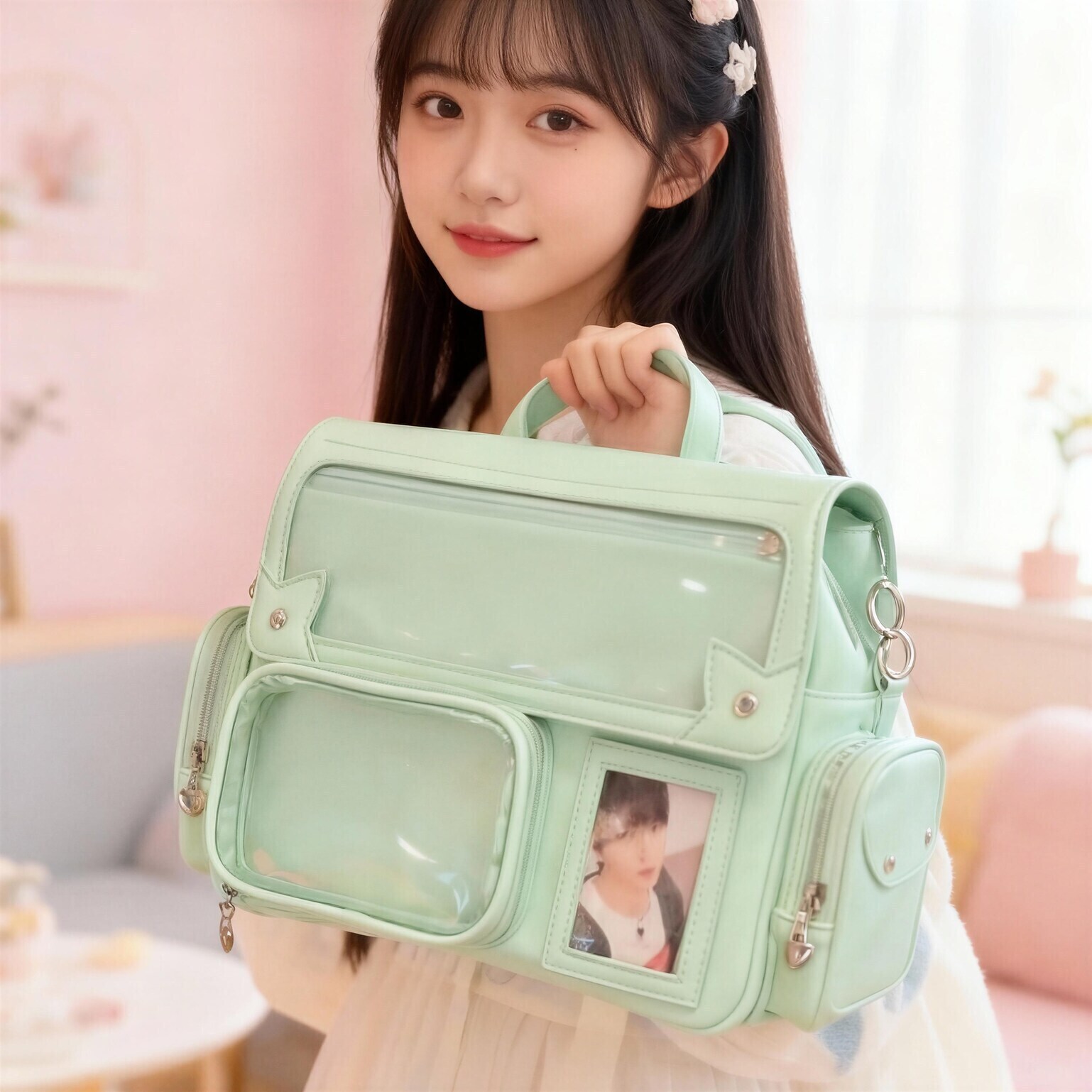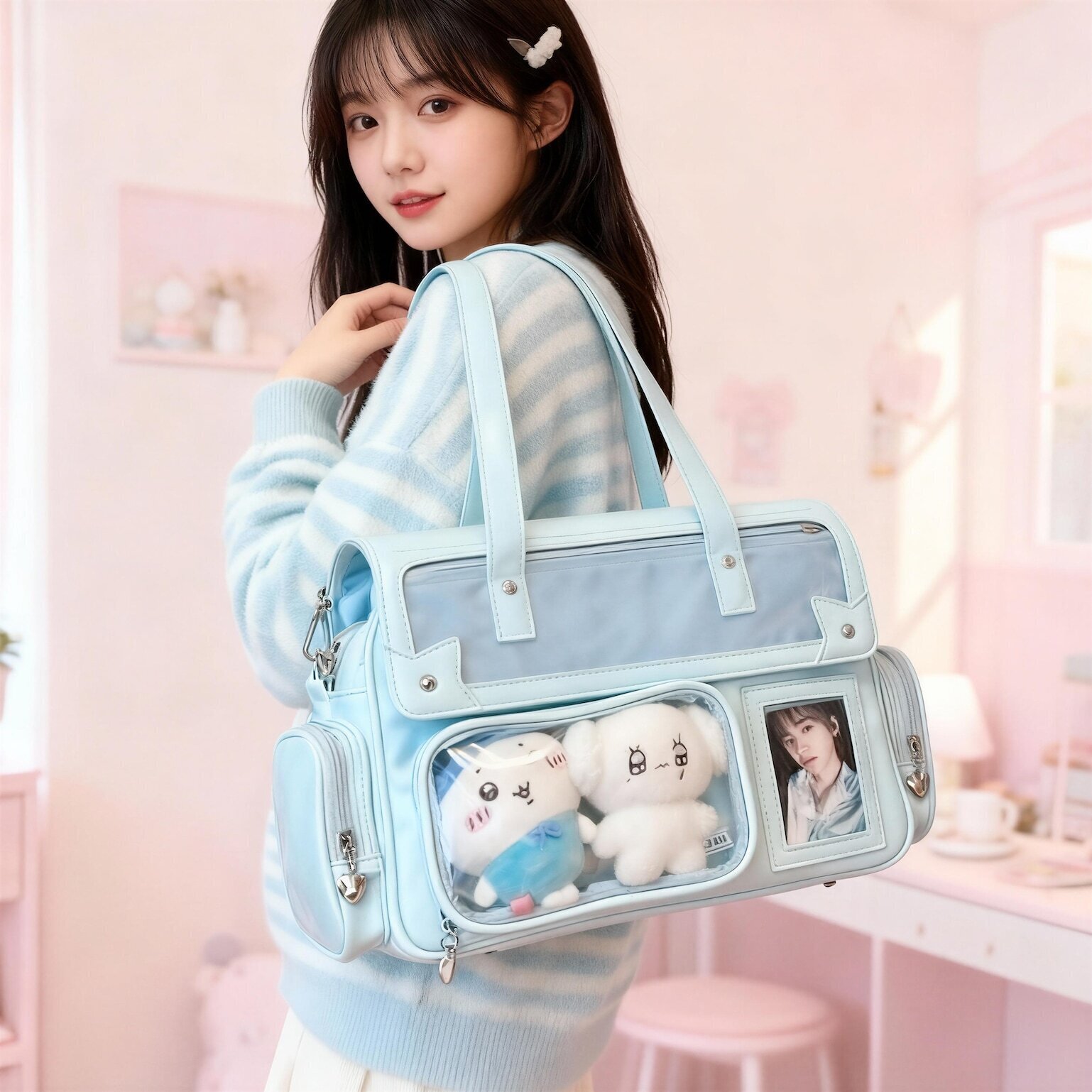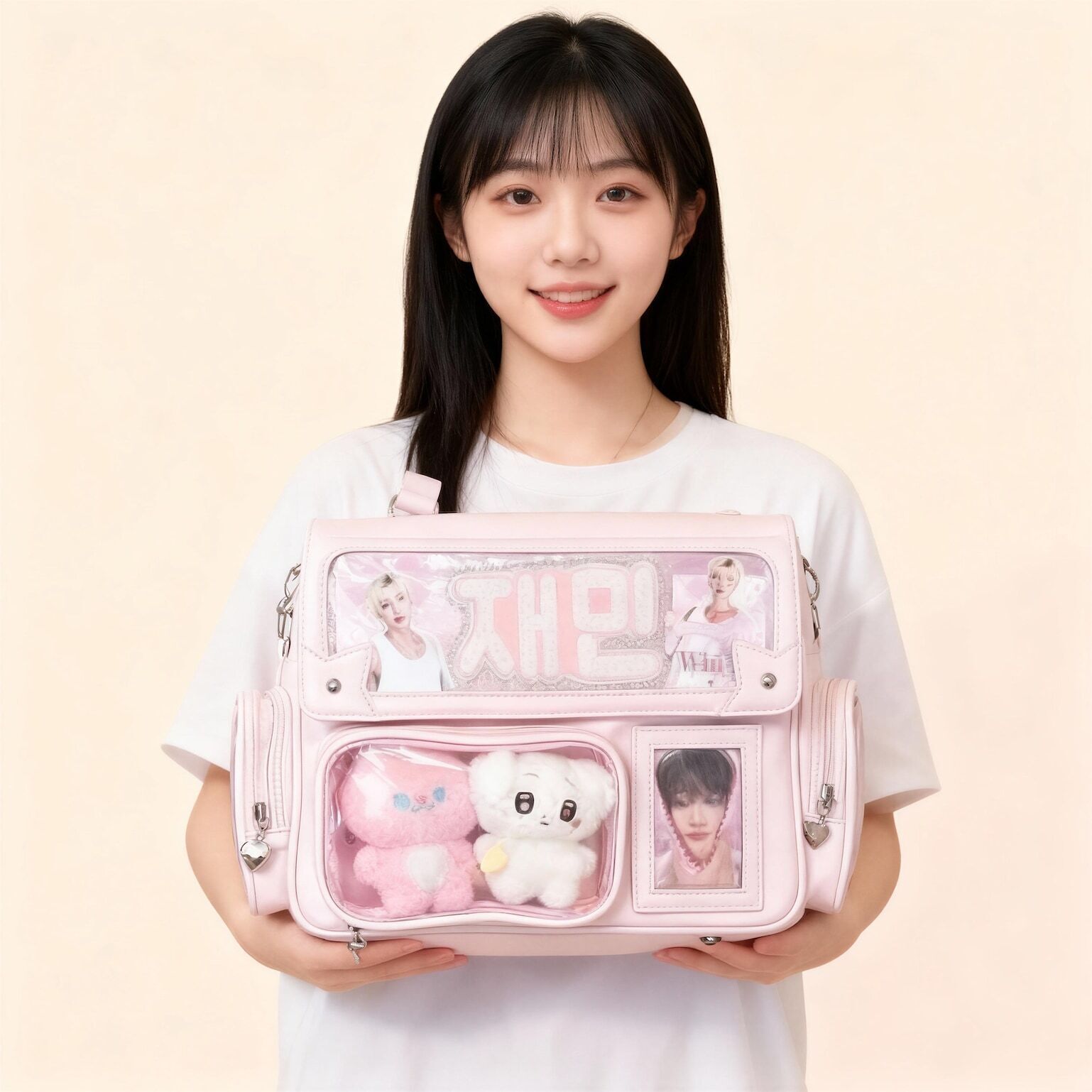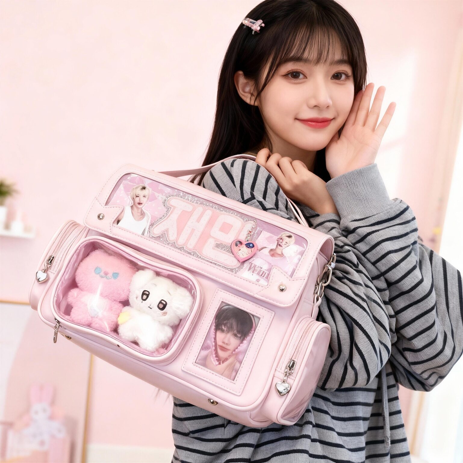 Pink Kawaii Ita Tote Bag with Clear Window for Plushies and Pins is designed to display plushies, dolls, pins, and badges while keeping everyday essentials organized.