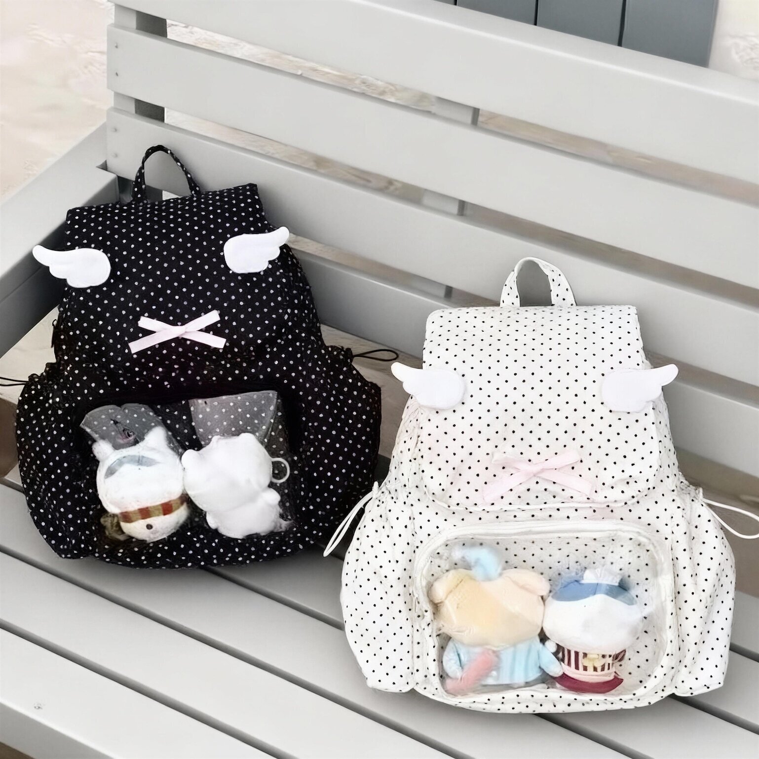 Pink Kawaii Y2K Ita Backpack with Clear Window for Plushies and Pins is designed to display plushies, dolls, pins, and badges while keeping everyday essentials organized.