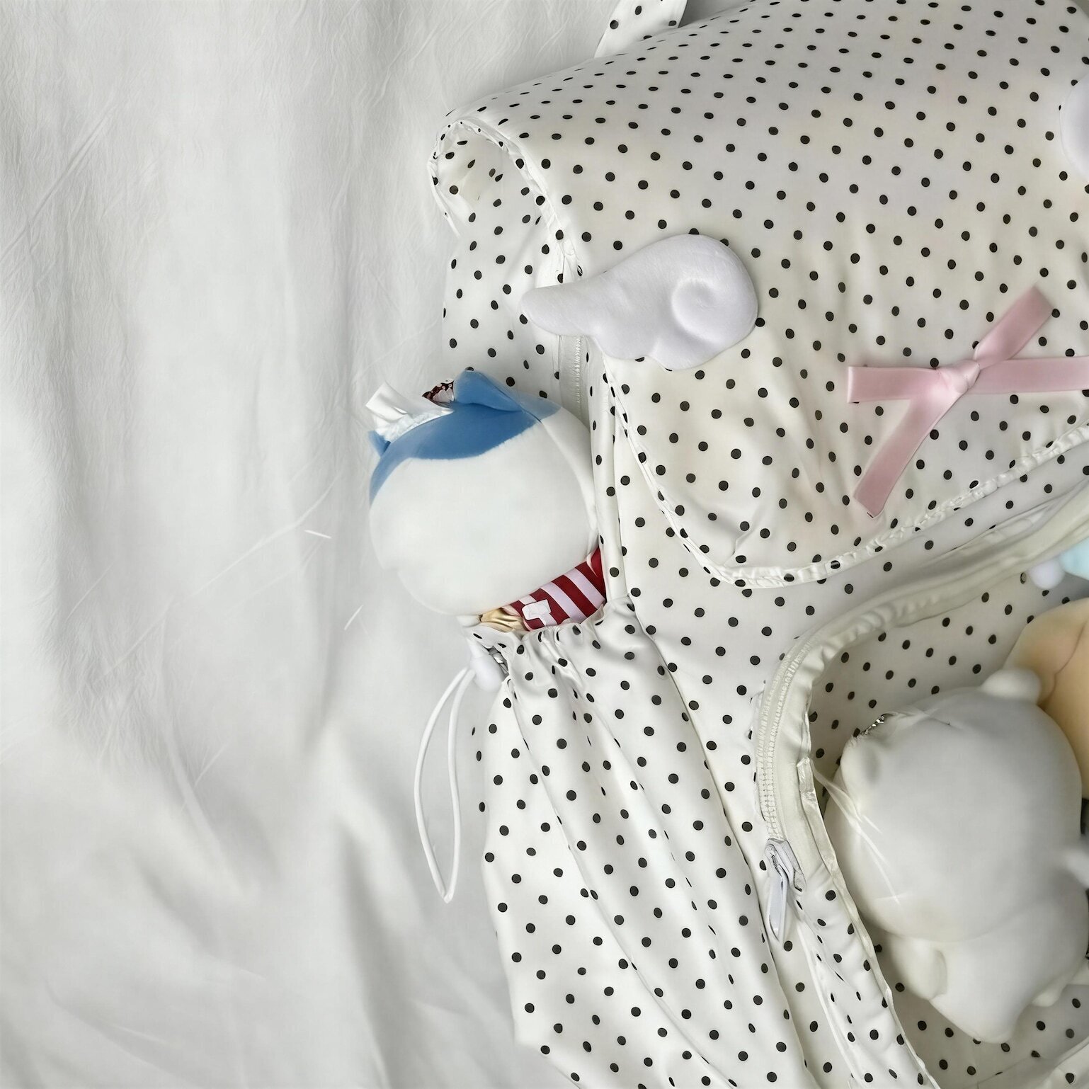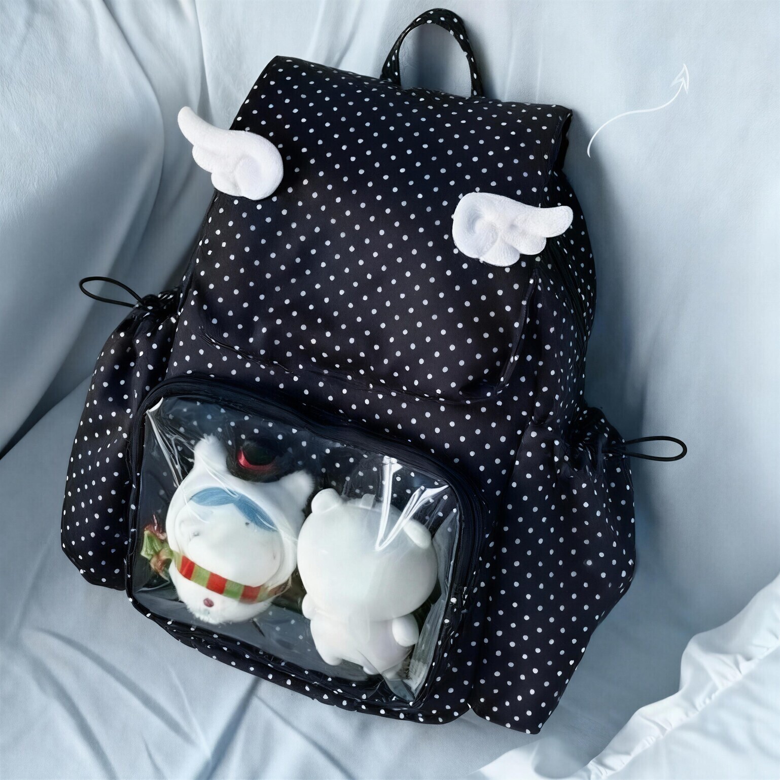 A: This bag is positioned for plushies, dolls, pins, badges, and other small display merch shown through the clear window.