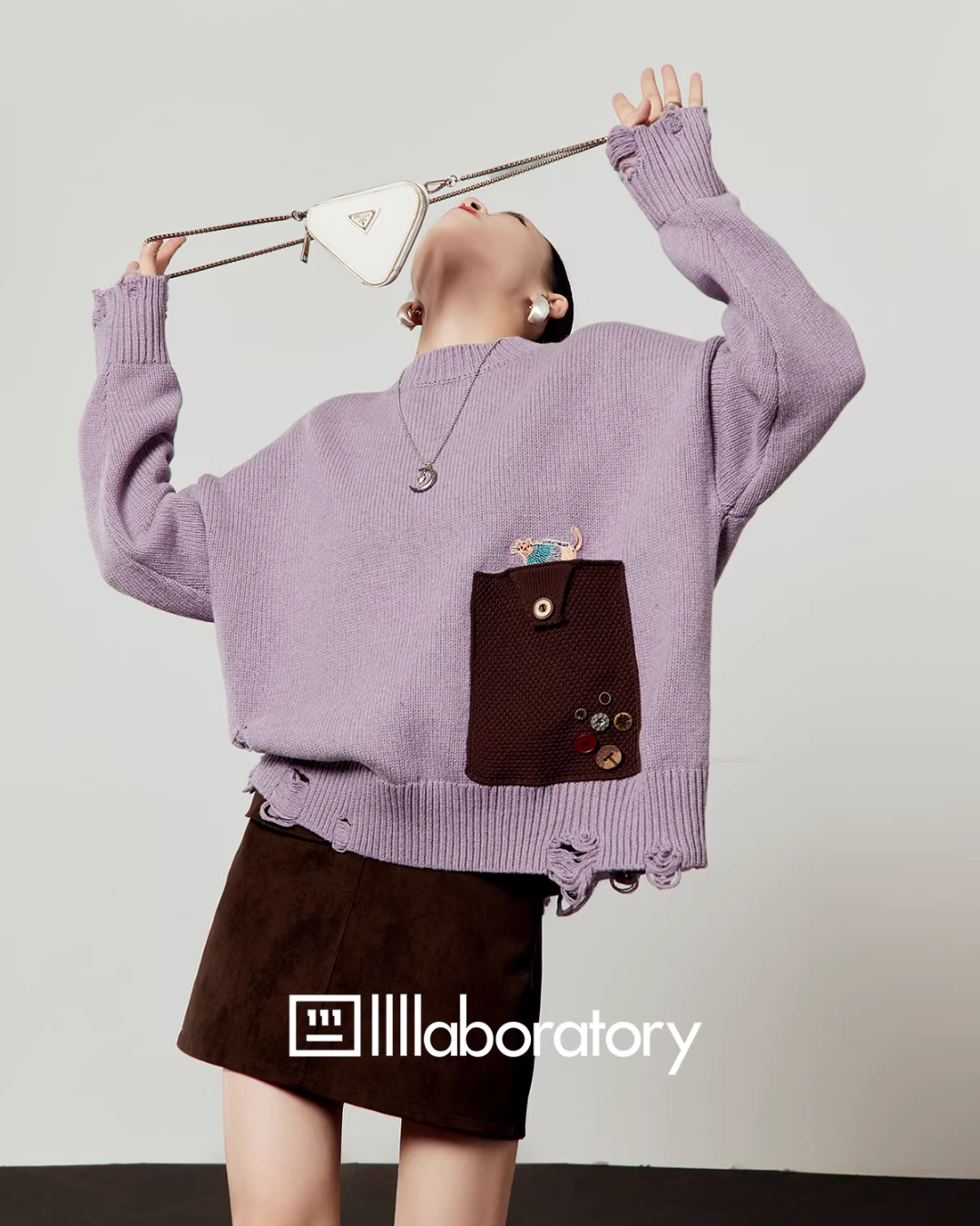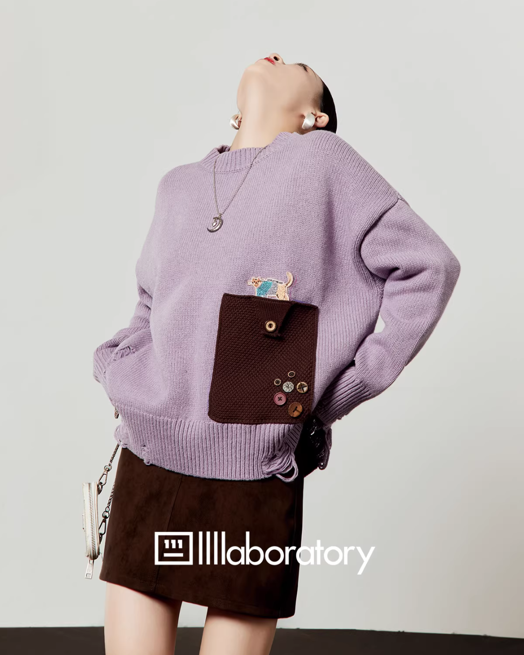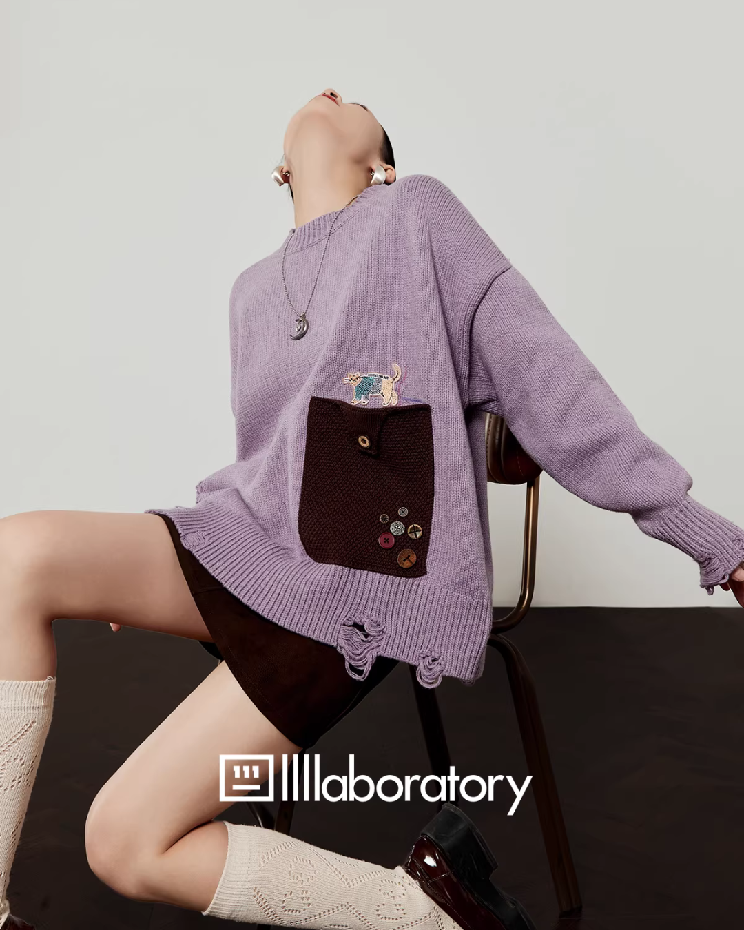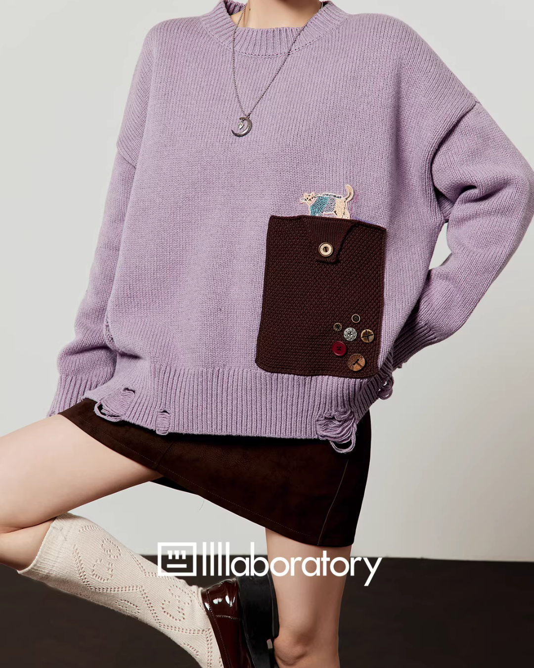 A cute knit top with moderate damage processing and a cat motif embroidery.