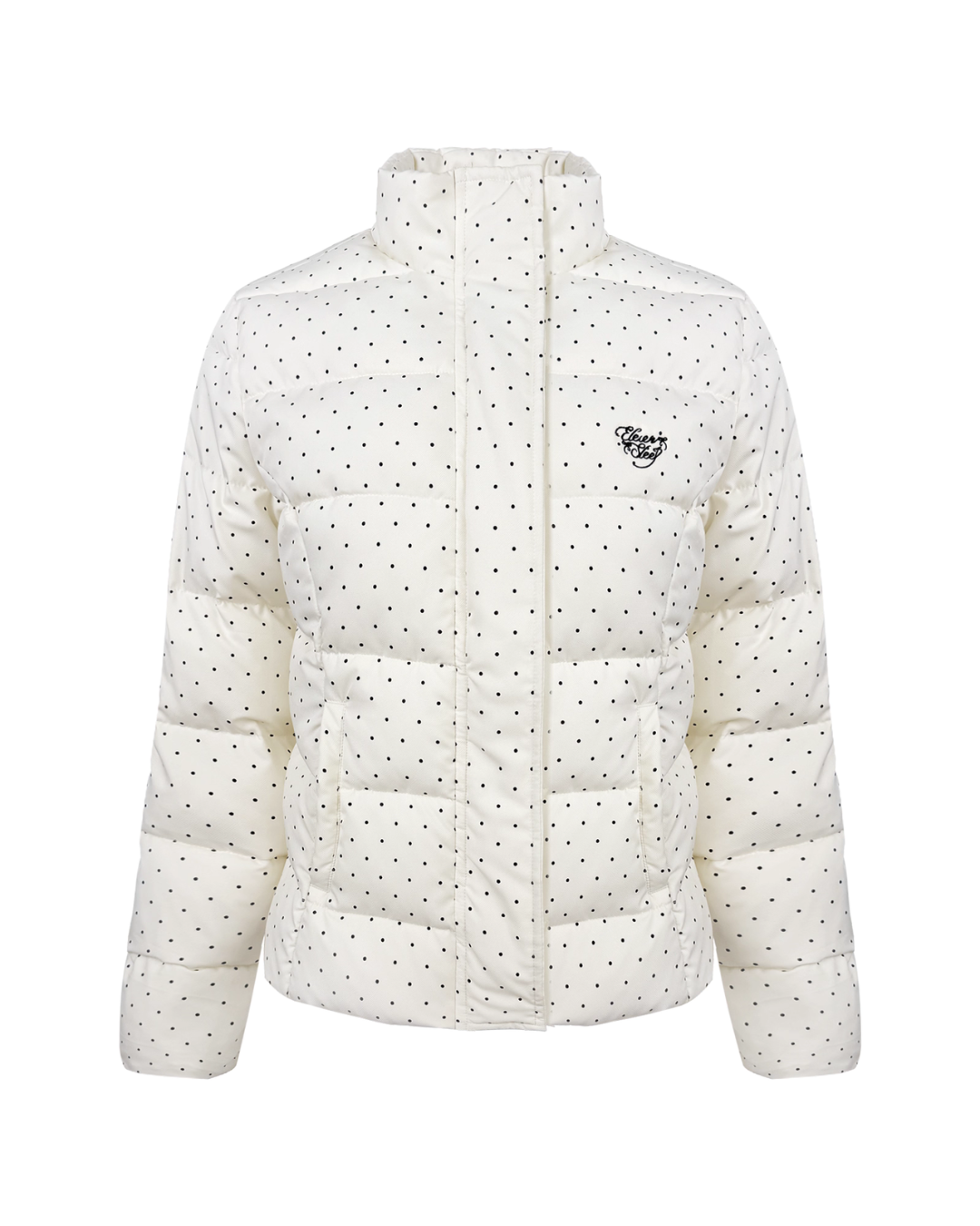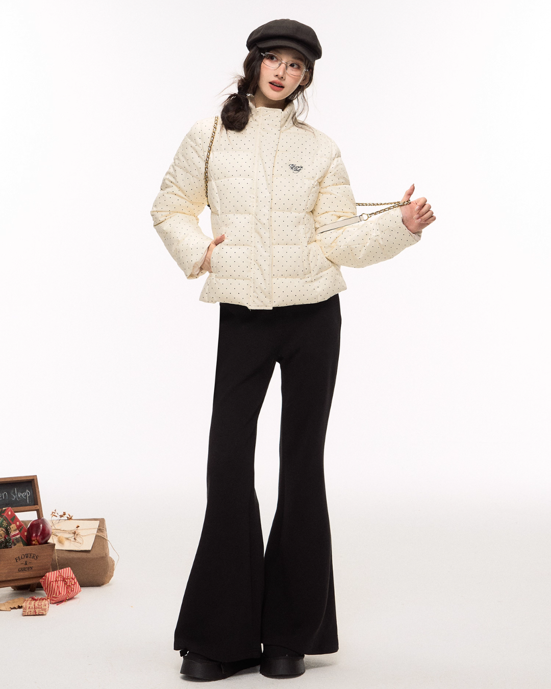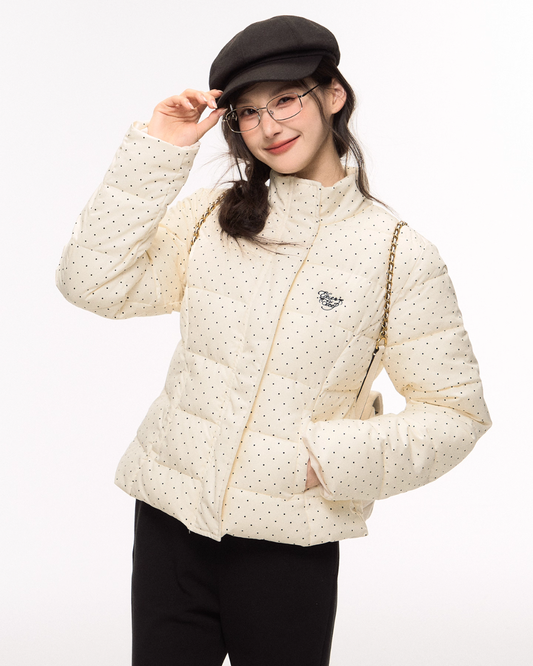 A set-up with a down jacket and pants featuring a polka dot pattern that exudes a classical atmosphere.