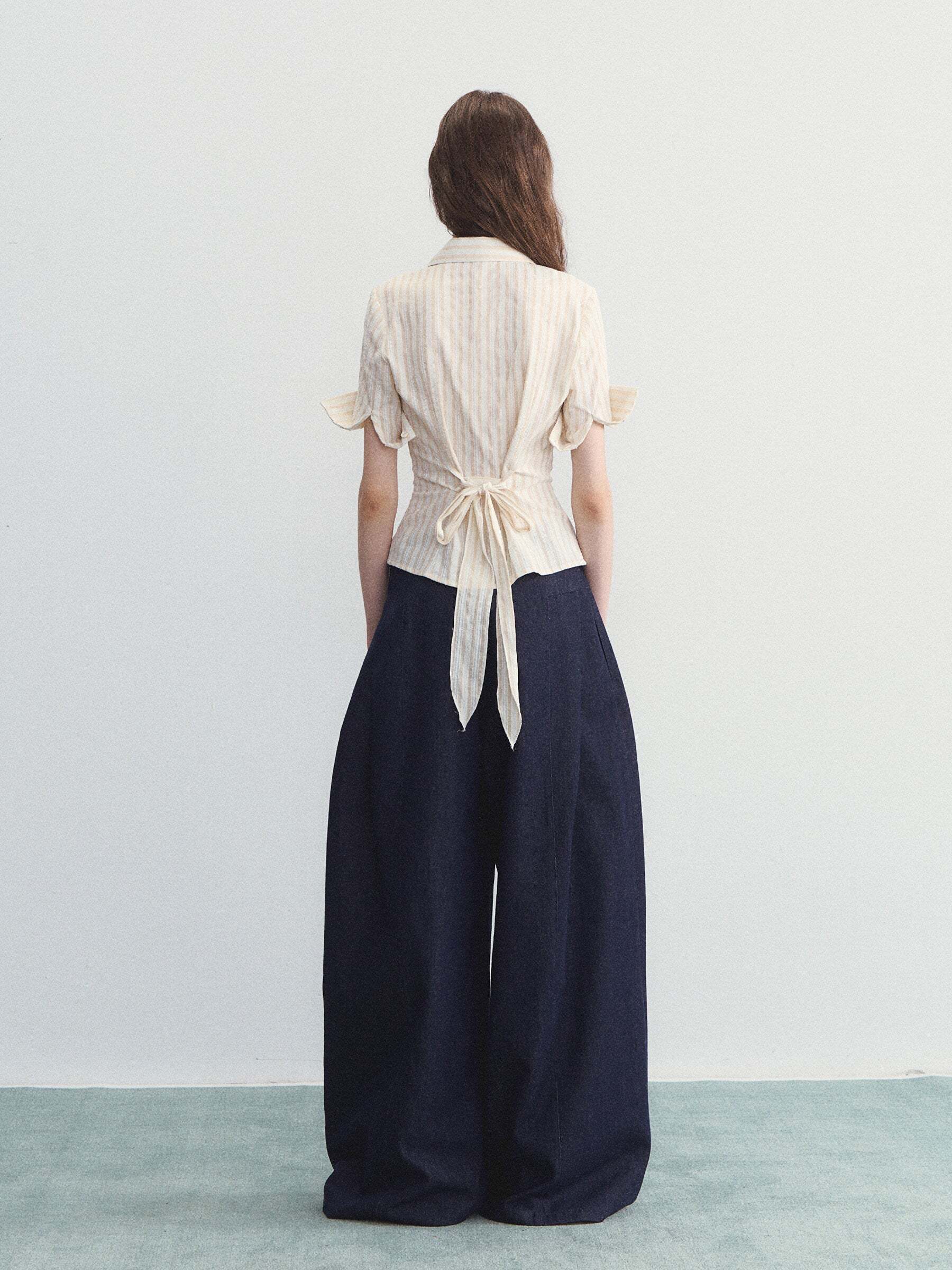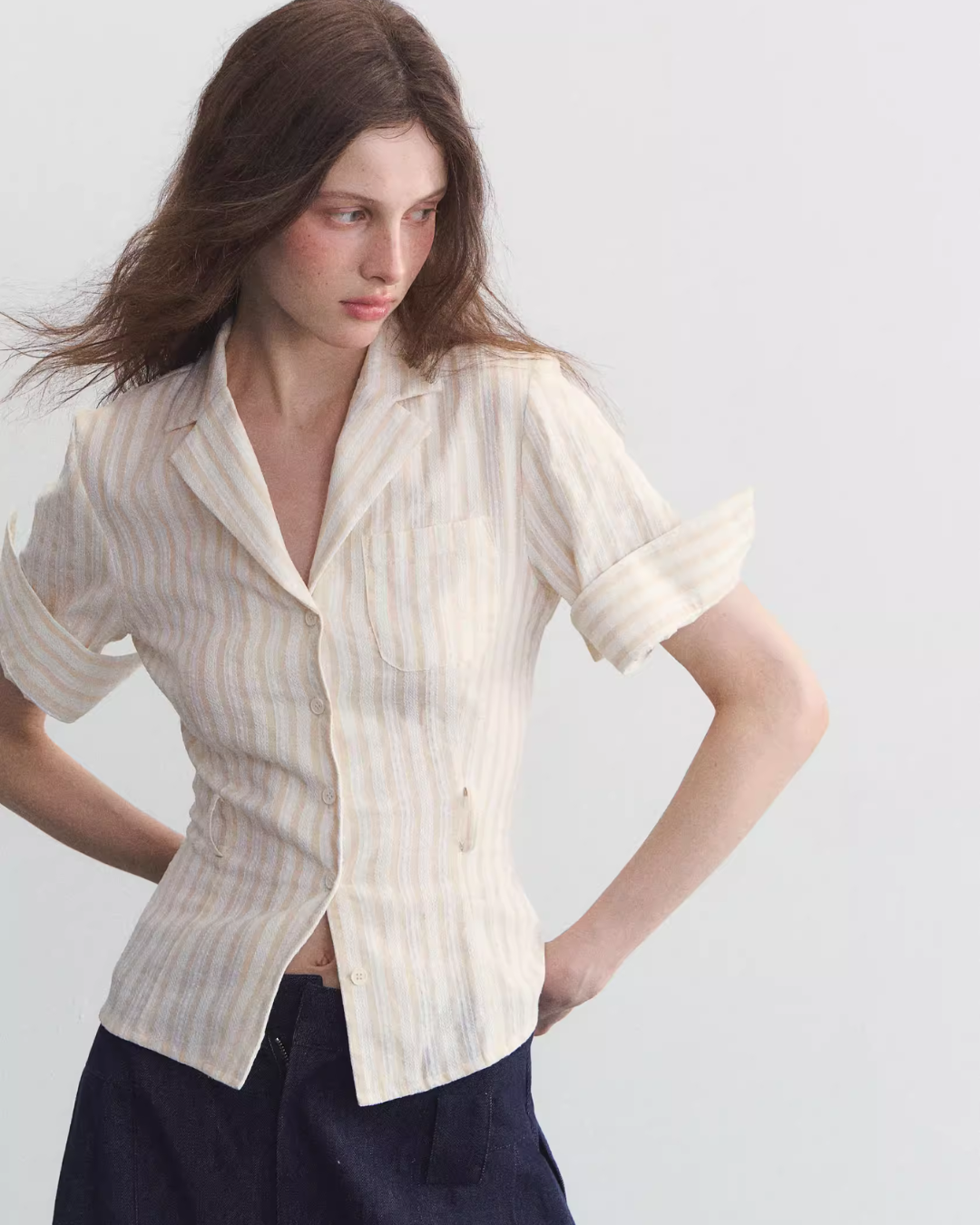 A shirt made with a stripe pattern fabric that gives a refreshing impression.