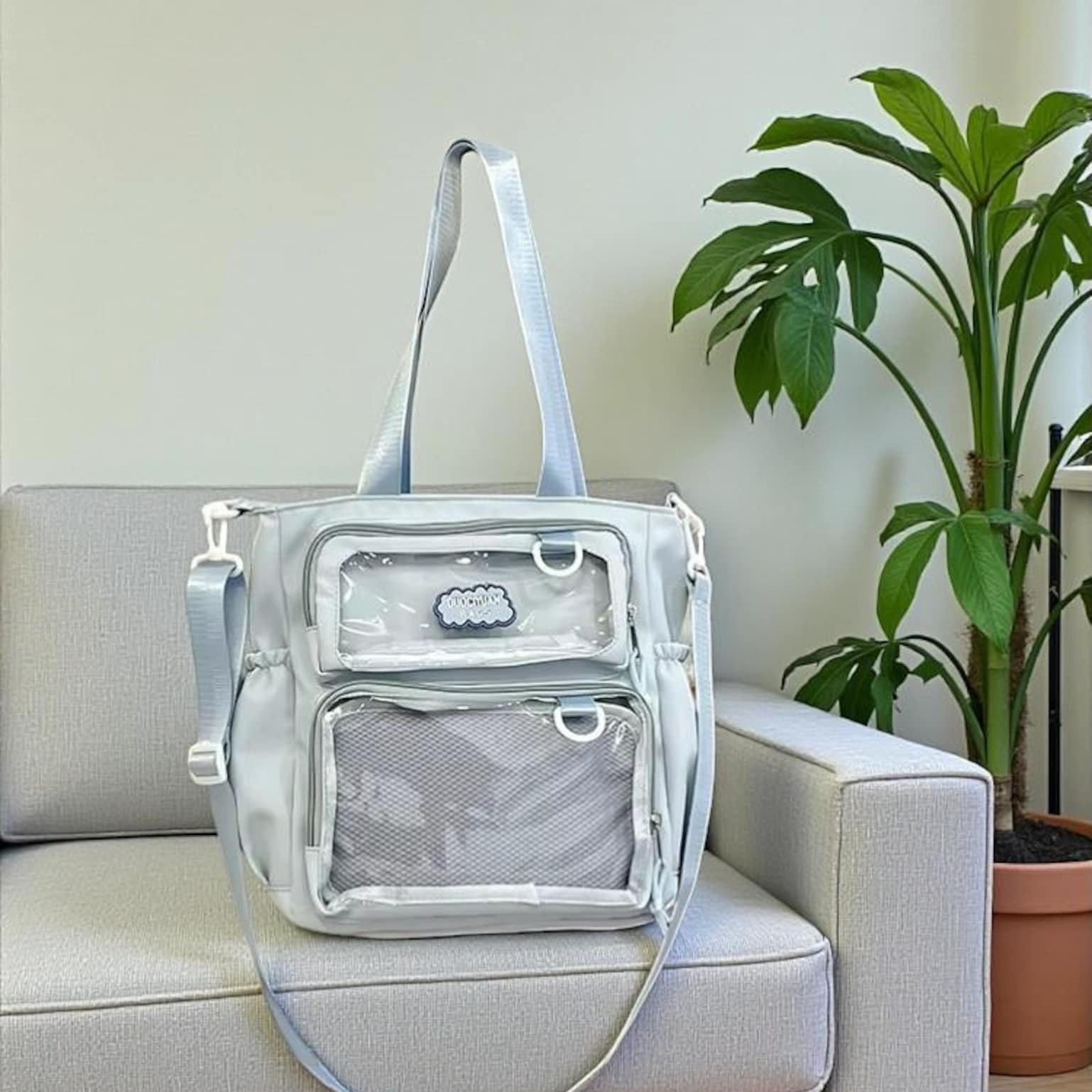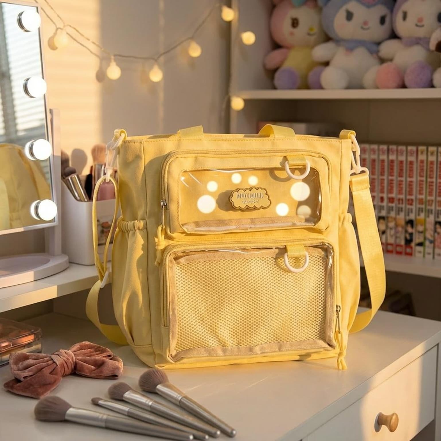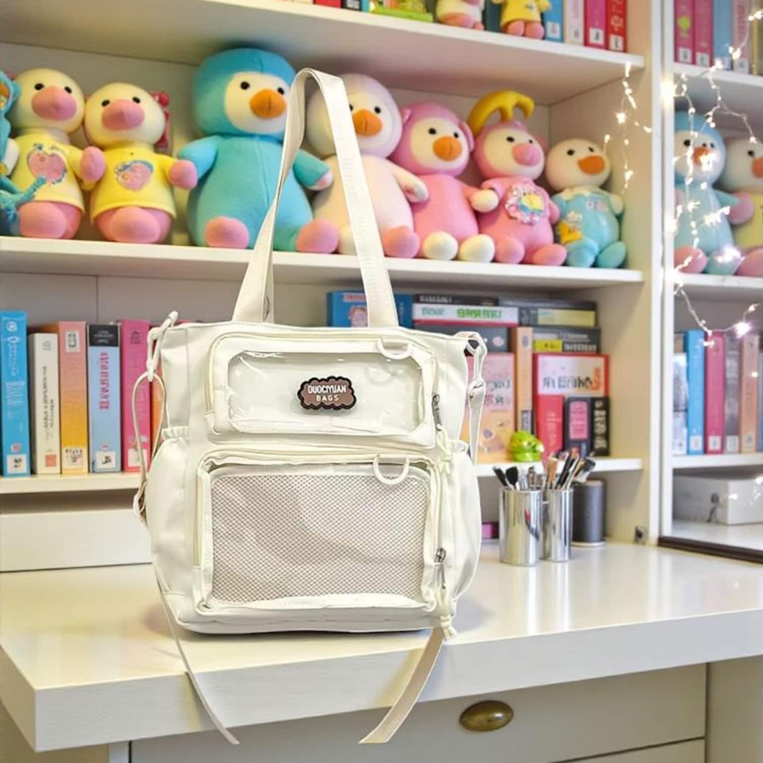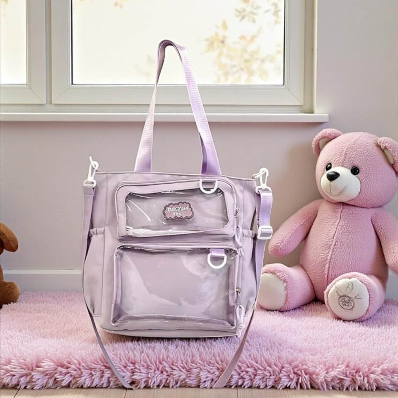 Purple Kawaii Convertible Ita Bag with Clear Window for Pin Display combines everyday carry with a clear display area for pins, badges, charms, or character merch.
