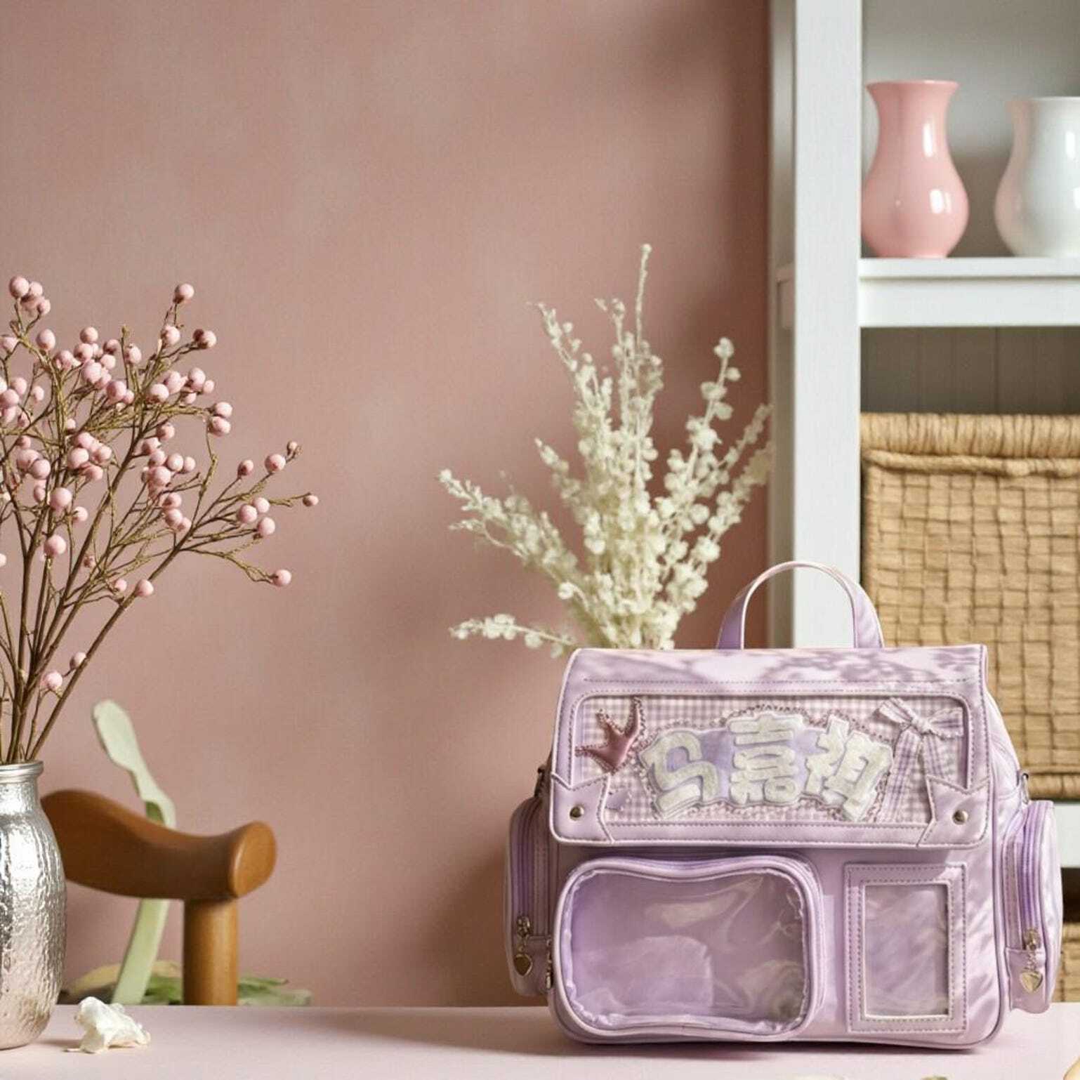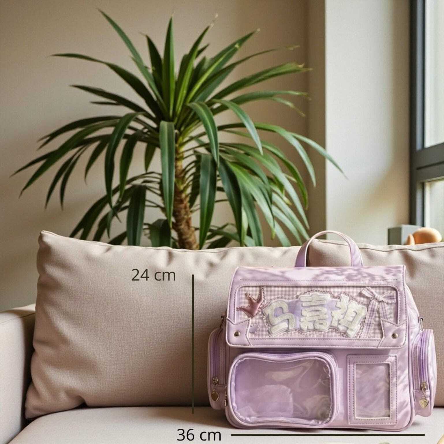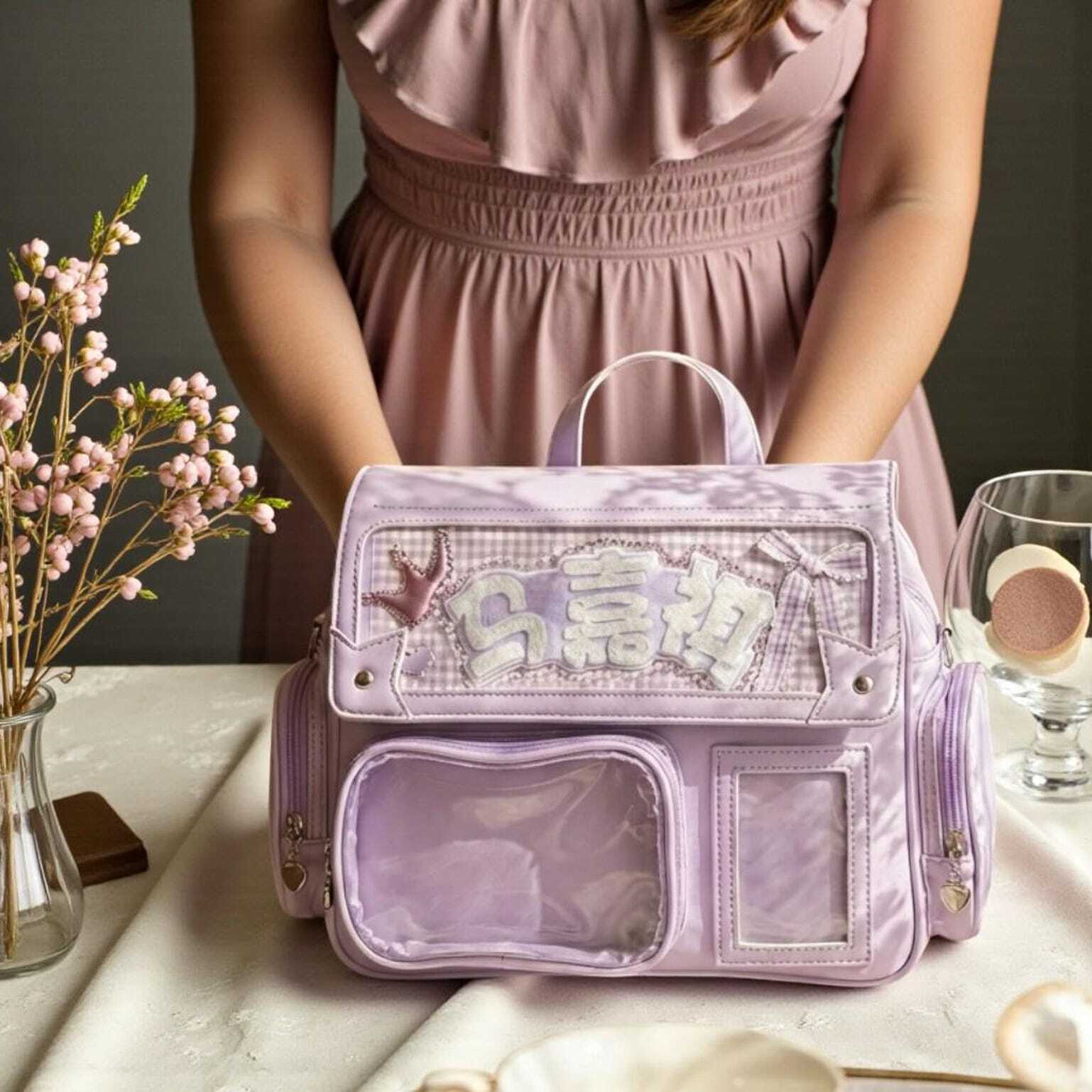 Purple Kawaii Convertible Ita Bag with Clear Window for Pin Display combines everyday carry with a clear display area for pins, badges, charms, or character merch.