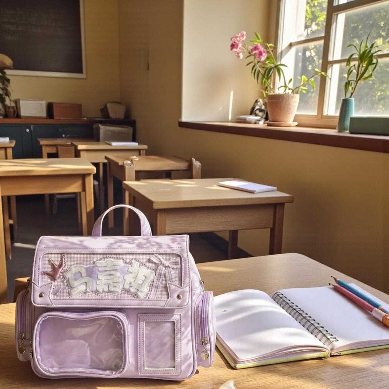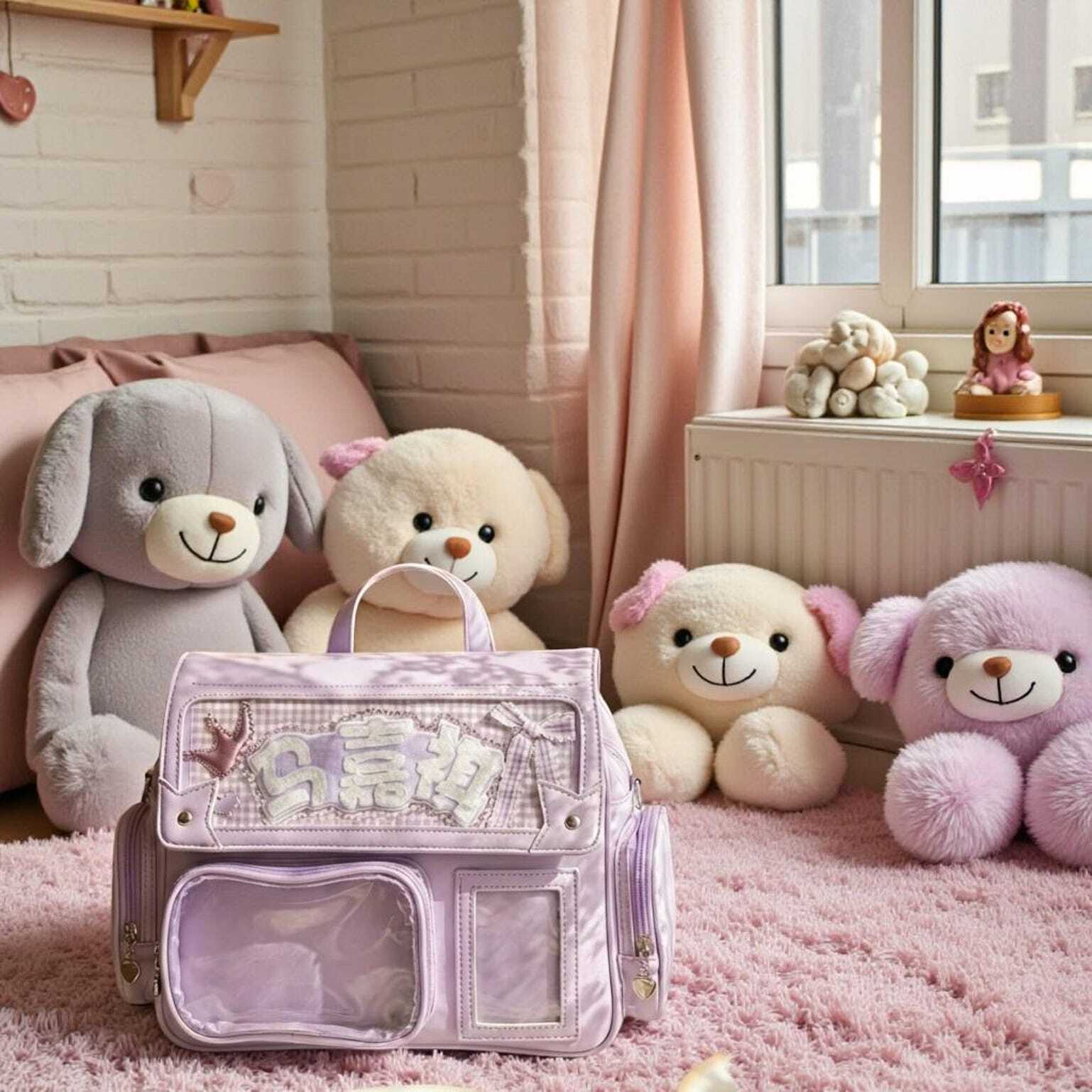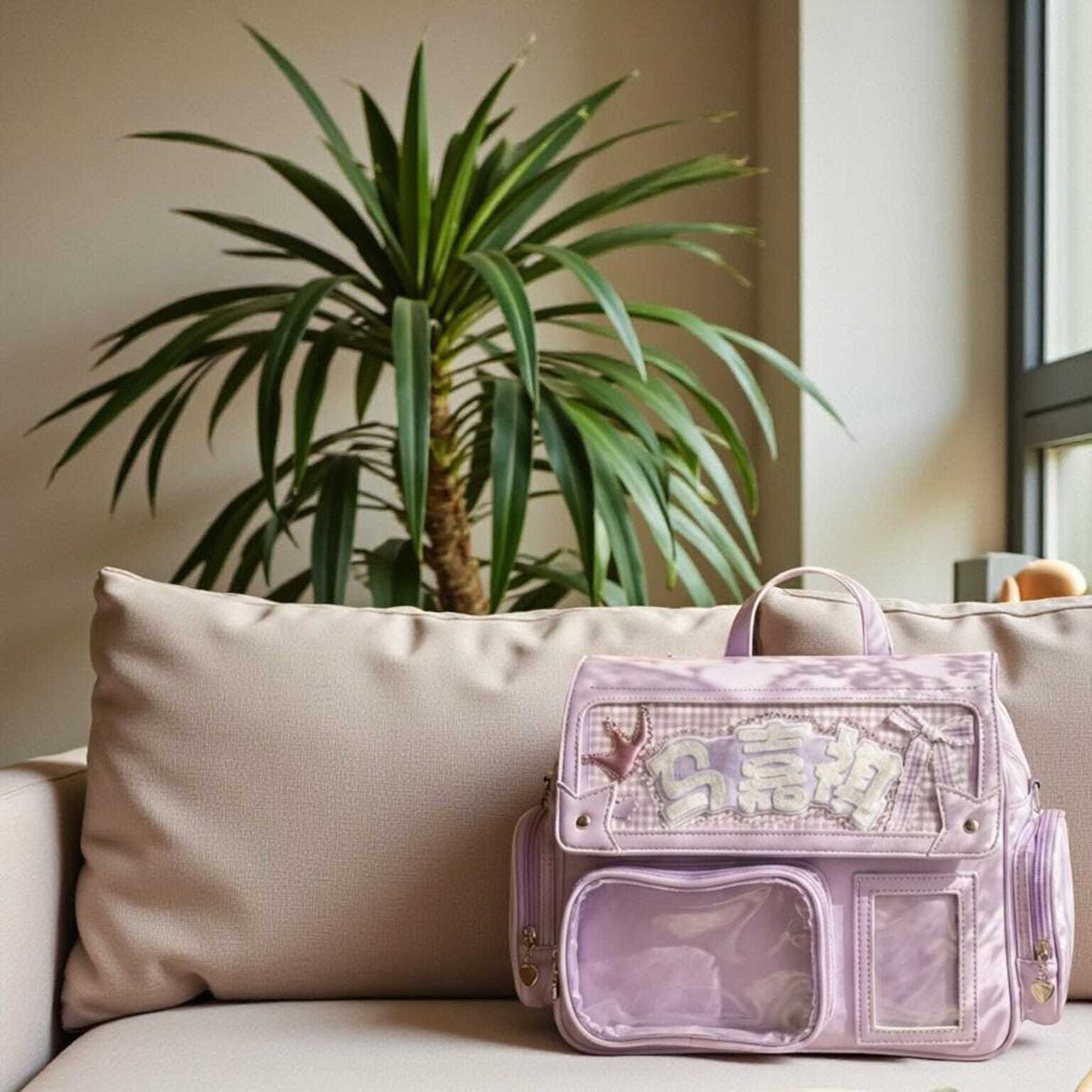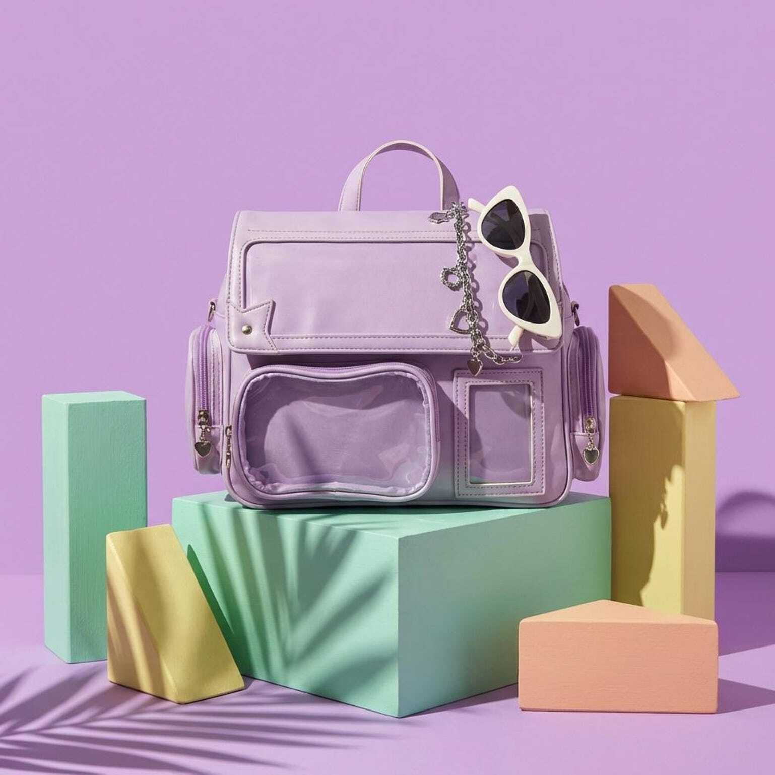 Purple Kawaii Convertible Ita Bag with Clear Window for Pin Display combines everyday carry with a clear display area for pins, badges, charms, or character merch.
