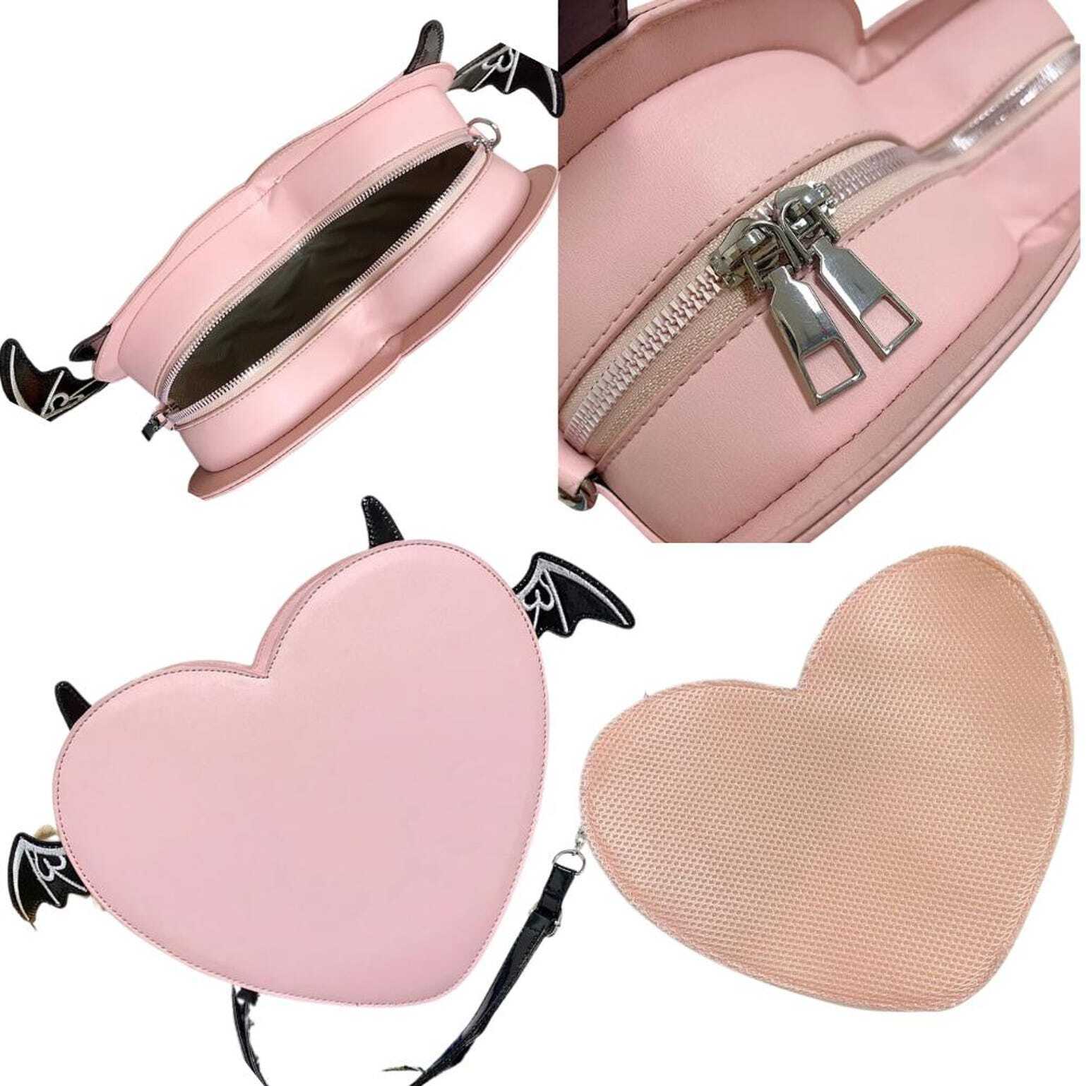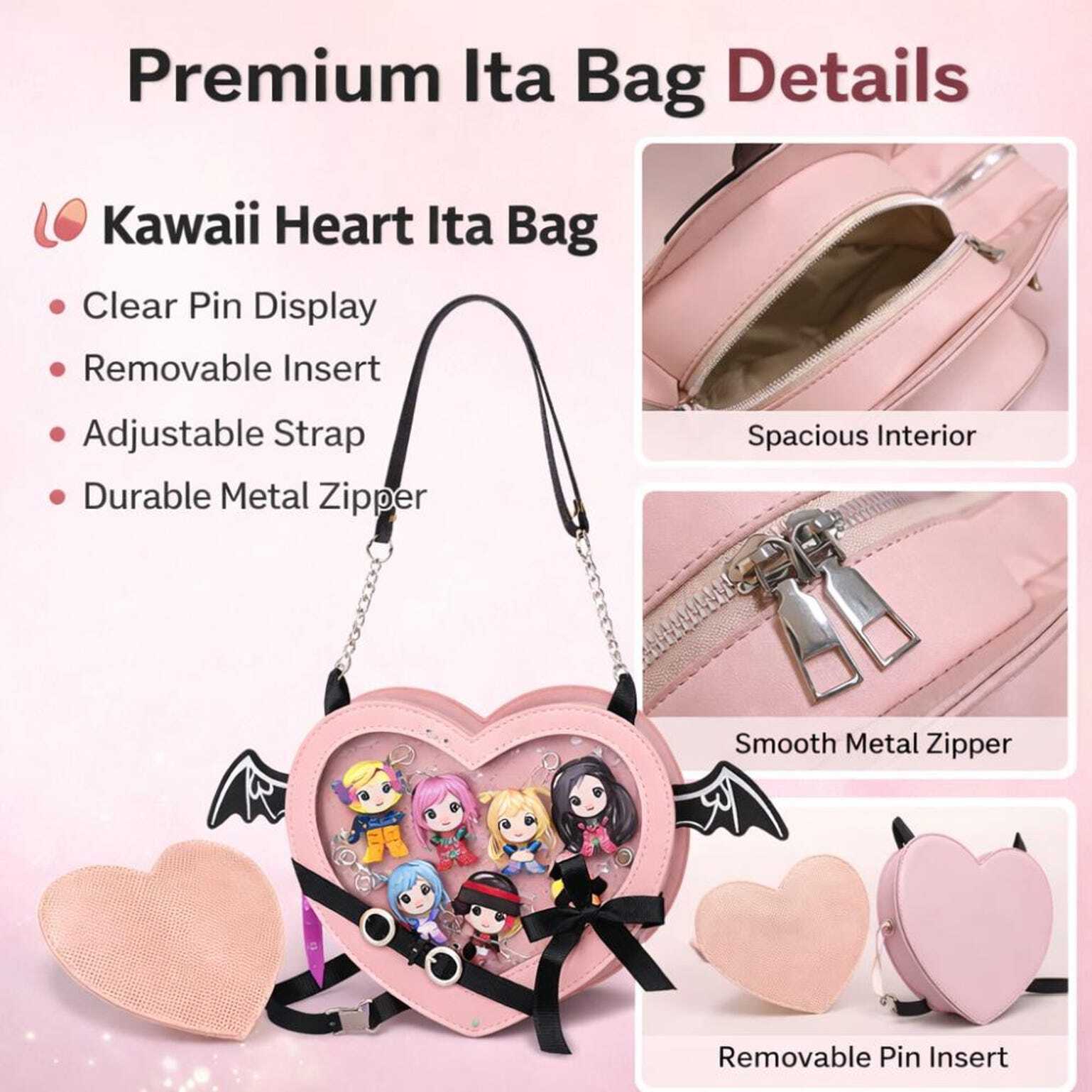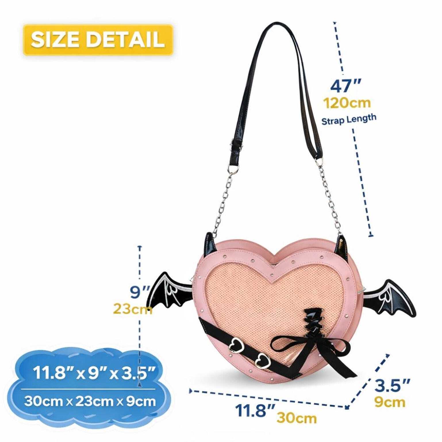 This unique devil heart ita bag features a transparent display window so you can decorate it with your favorite anime pins, badges, keychains or charms.