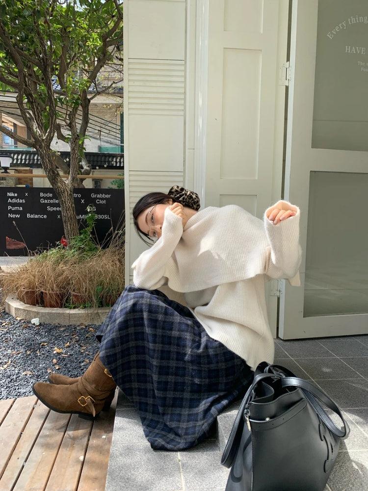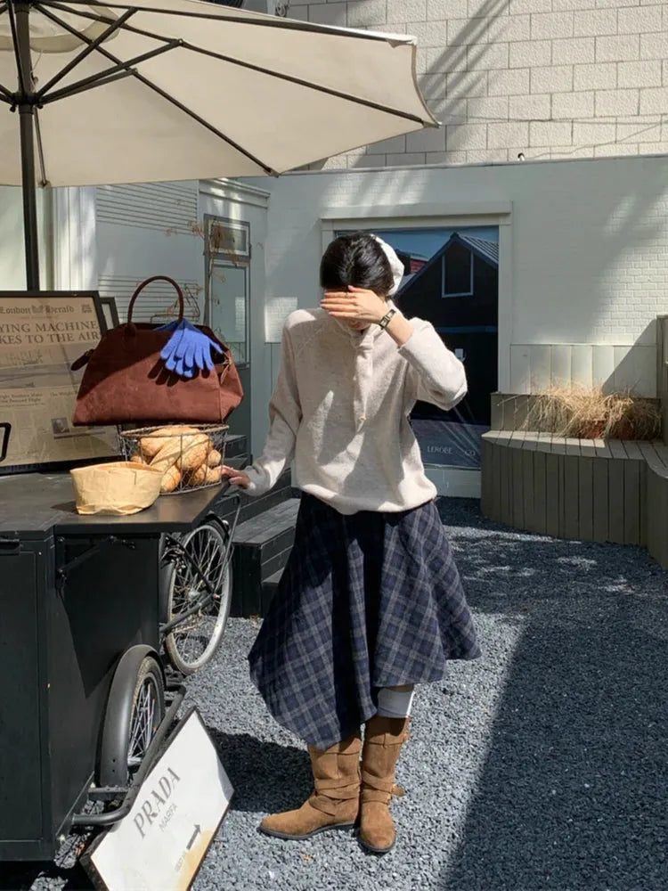 Classic with a twist—this plaid midi skirt features an elegant asymmetric hem that adds movement and personality to a timeless silhouette. Crafted in a cozy woven fabric, it’s perfect for layering with knits and boots for that effortless academic or vintage-inspired look.