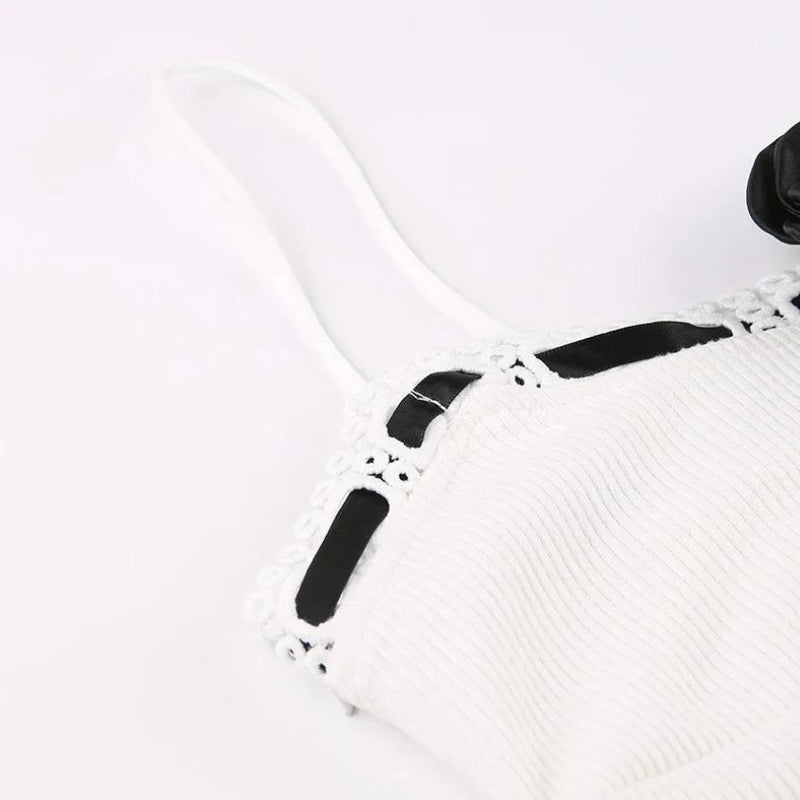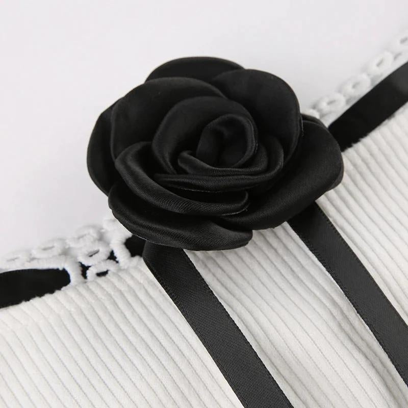 This coquette-inspired mini dress features delicate rose details on the chest and spaghetti straps. The bodycon design is accentuated with ribbon details at the bust and hem, making it perfect for parties, date nights, or when you want a chic and cute look.
