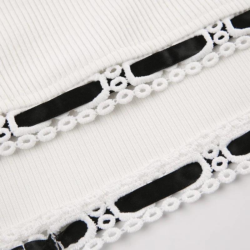 Korean Women's Vintage Aesthetic Strapless Color-Block Lace Trim Top with Waist Tie - 90s Inspired FashionKorean Women's Vintage Aesthetic Strapless Color-Block Lace Trim Top with Waist Tie - 90s Inspired Fashion