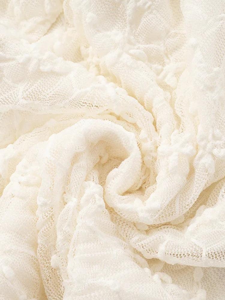 The Draped Front Top & Shorts Two Piece Set features a sheer ivory lace cropped top with a relaxed draped neckline and fitted long sleeves, paired with matching high-waisted lace shorts. The shorts offer a snug lace blend fit while the top showcases the chest and drapes softly. Both pieces provide airy elegance and coordinated style for resort wear or casual outings.