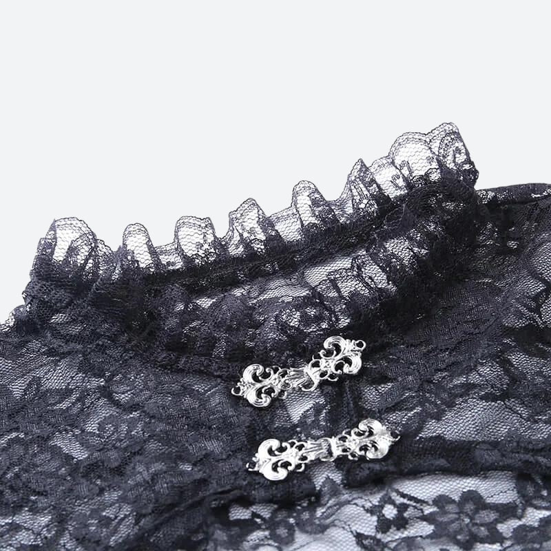 Draped in the night’s essence, this garment offers a bold statement with its transparent allure and cascading ruffles. A blend of shadowy elegance and romantic flair, this top is an ode to the mysterious charm of nocturnal grace, accented with lace-up details that invite a customizable fit. It’s the perfect fusion of edgy sophistication and contemporary fashion.