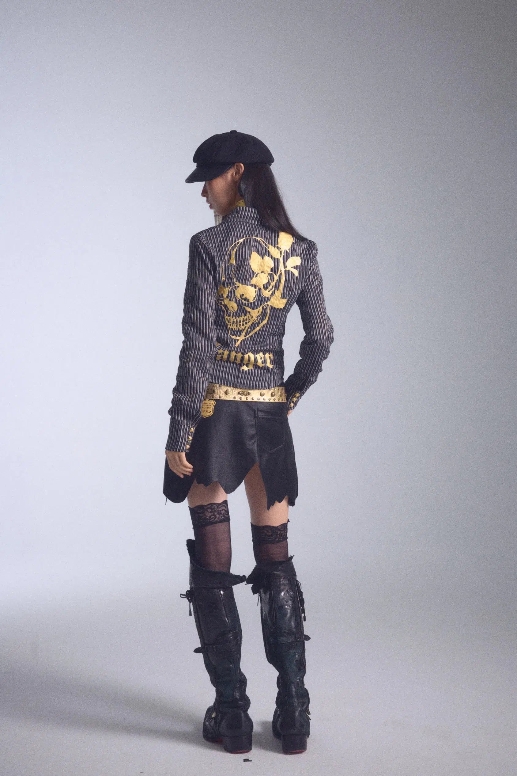 This bold striped shirt blends edgy design with a touch of gothic glam. The back features a striking golden skull and floral graphic, while the tailored fit and buttoned cuffs add structure. Perfect for adding an alternative flair to your wardrobe.
