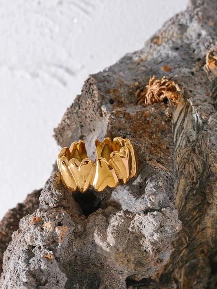 A stunning golden heart ring designed to add a statement to any outfit. Its unique design showcases multiple hearts, creating a bold and elegant look. Crafted with a high-shine finish, this ring is perfect for enhancing your jewelry collection with a touch of romance and sophistication.