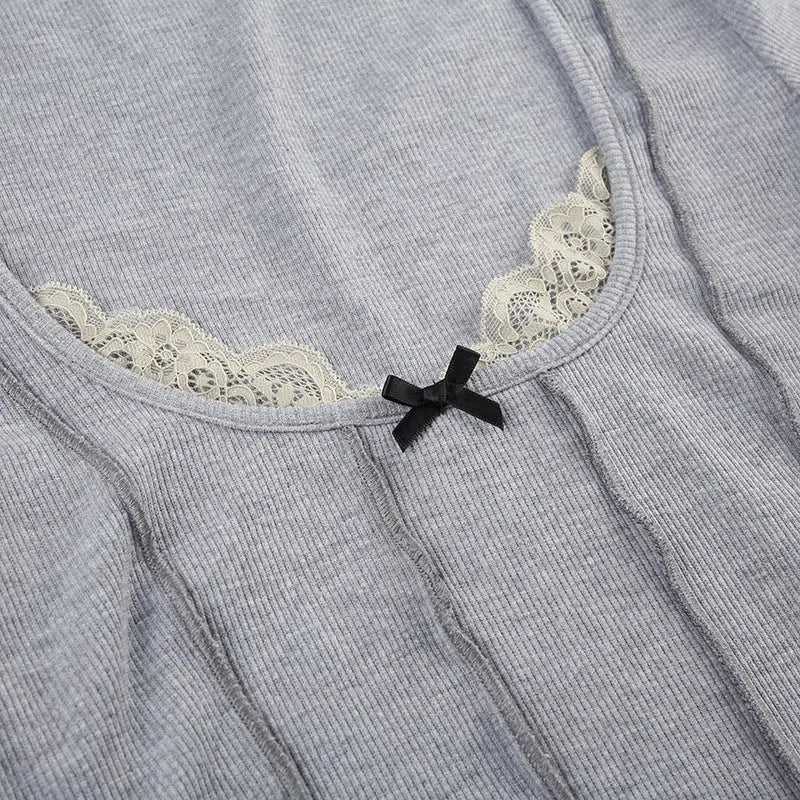 The Lace Trim Ribbed Crop Top adds a cute and feminine touch to any outfit with its delicate lace details and fitted ribbed fabric. Featuring a scoop neckline and subtle bow accent, this top is perfect for casual styling or layering with your favorite jackets.