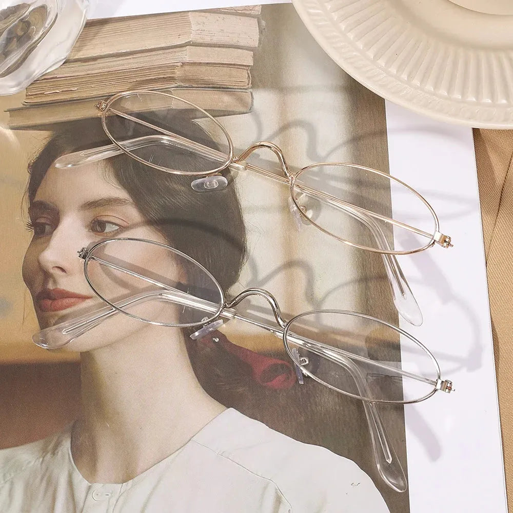 The Oval Glasses shown in the image have a delicate, vintage-inspired charm. With a minimal gold metal frame and narrow oval lenses, they give off a soft, intellectual vibe with a dash of Y2K cool.