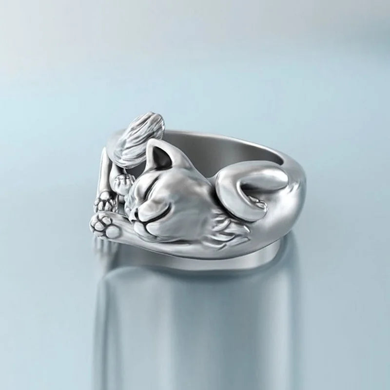 Show your love for cats with this adorable ring. Crafted from high-quality materials, it features a detailed design of a curled-up cat, adding a touch of whimsy to any outfit. Perfect for cat lovers, this ring is both charming and unique, making it a delightful accessory for any occasion.