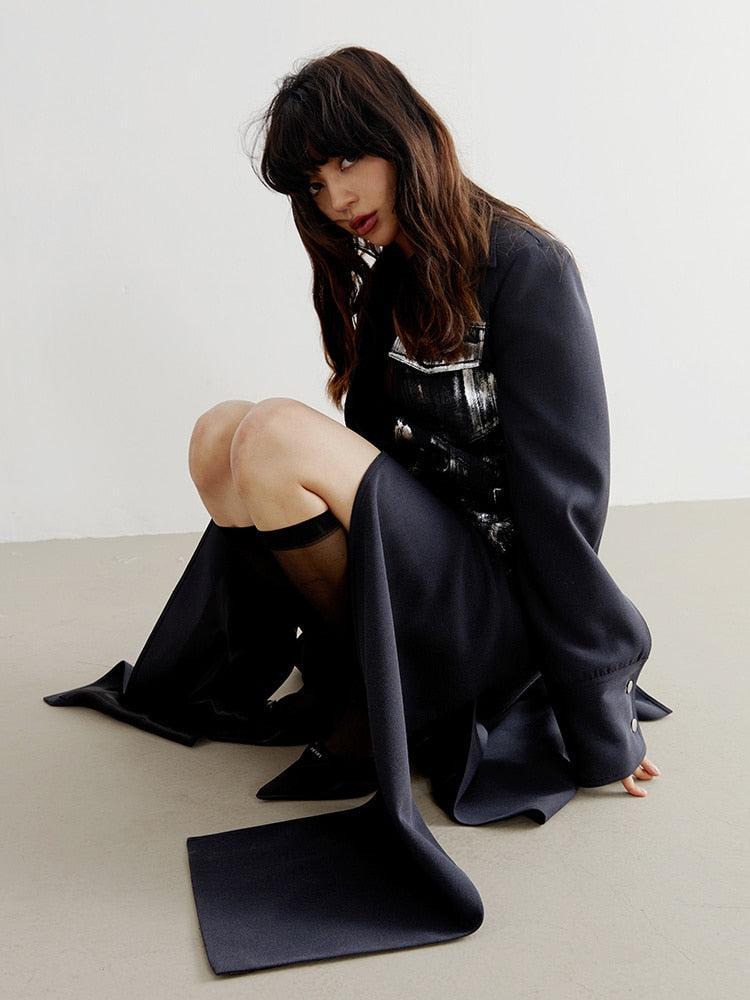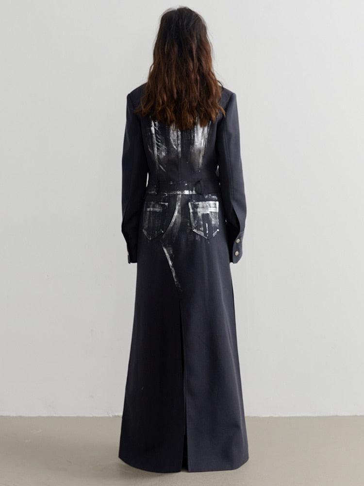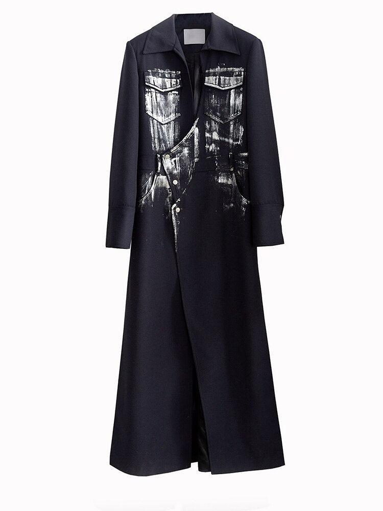 This black, one-piece wonder ingeniously combines a blazer and maxi skirt, presenting a unique take on the distressed aesthetic. With its front button fastening and an array of pockets – two on the hips, two on the chest, and an extra pair at the back, it’s not just fashionable but also practical. The invisible split detail adds a surprising twist, while the cotton-polyester blend ensures comfort. Its lapel collar adds a sophisticated touch. For an edgy look, wear it as a dress or pair with bold accessories. Perfect for those who love to experiment with their style.