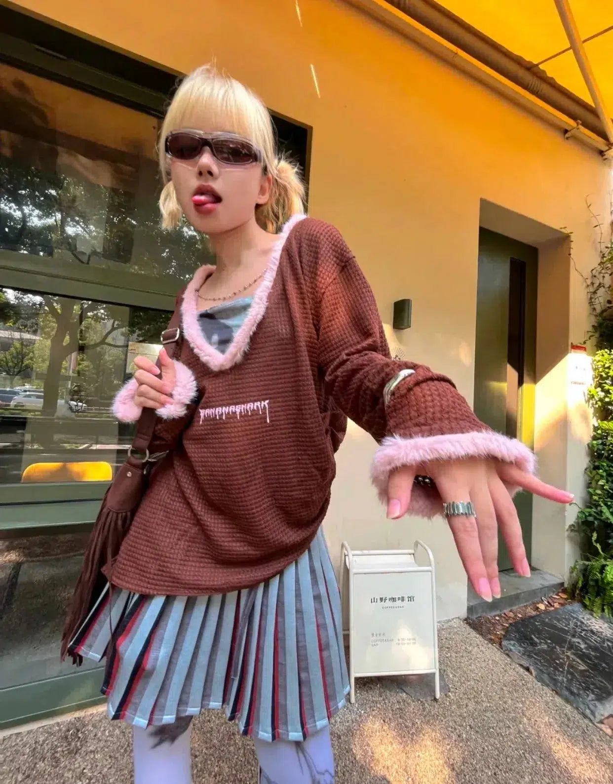 Step back into the Y2K era where fun and flamboyance reigned supreme. This deep V-neck sweater captures that essence. Composed of cotton and polyester, its long sleeves promise warmth, while the design screams party-ready. It’s perfect for those who love to blend vintage vibes with teen spirit.