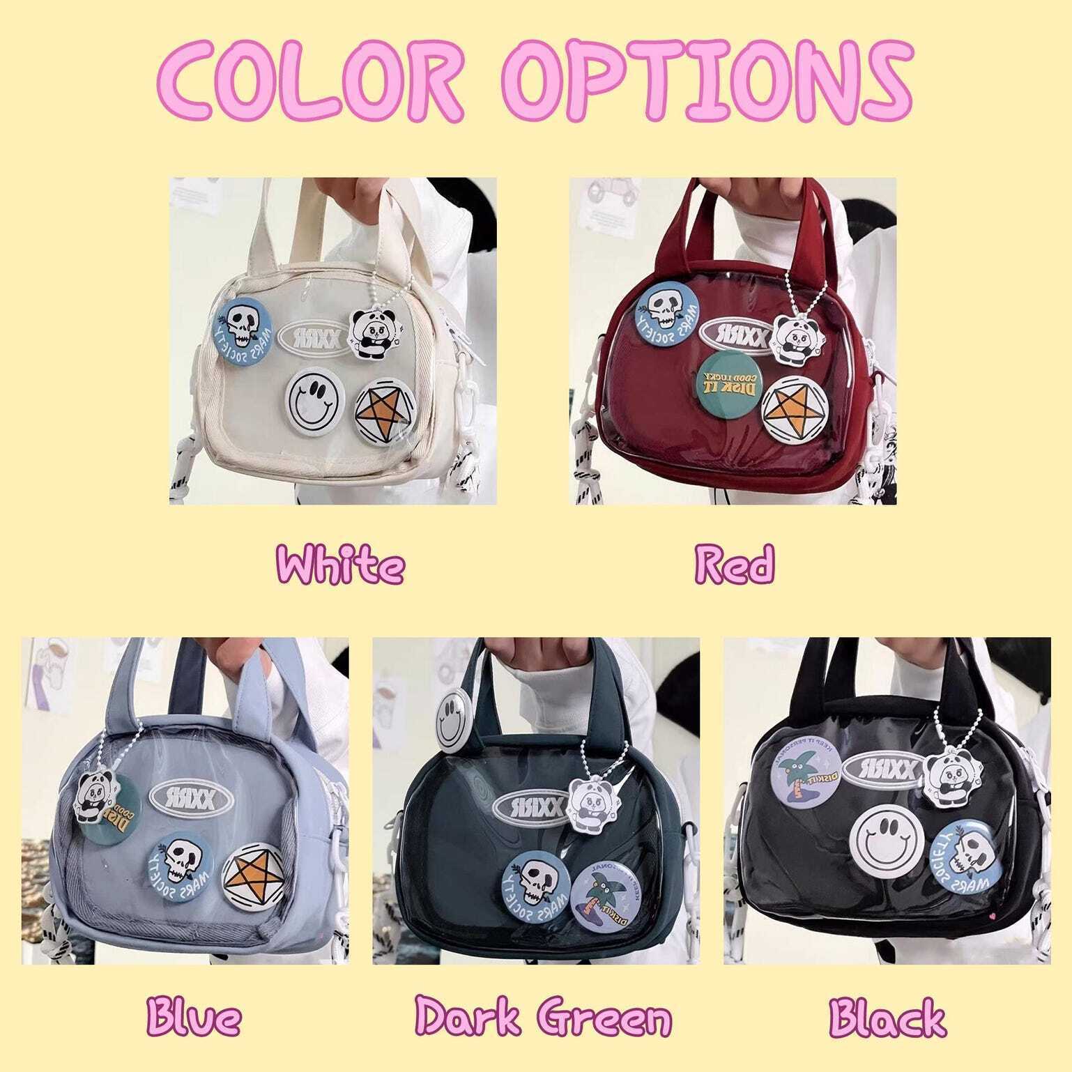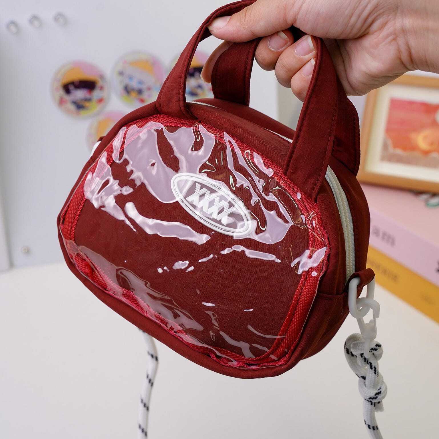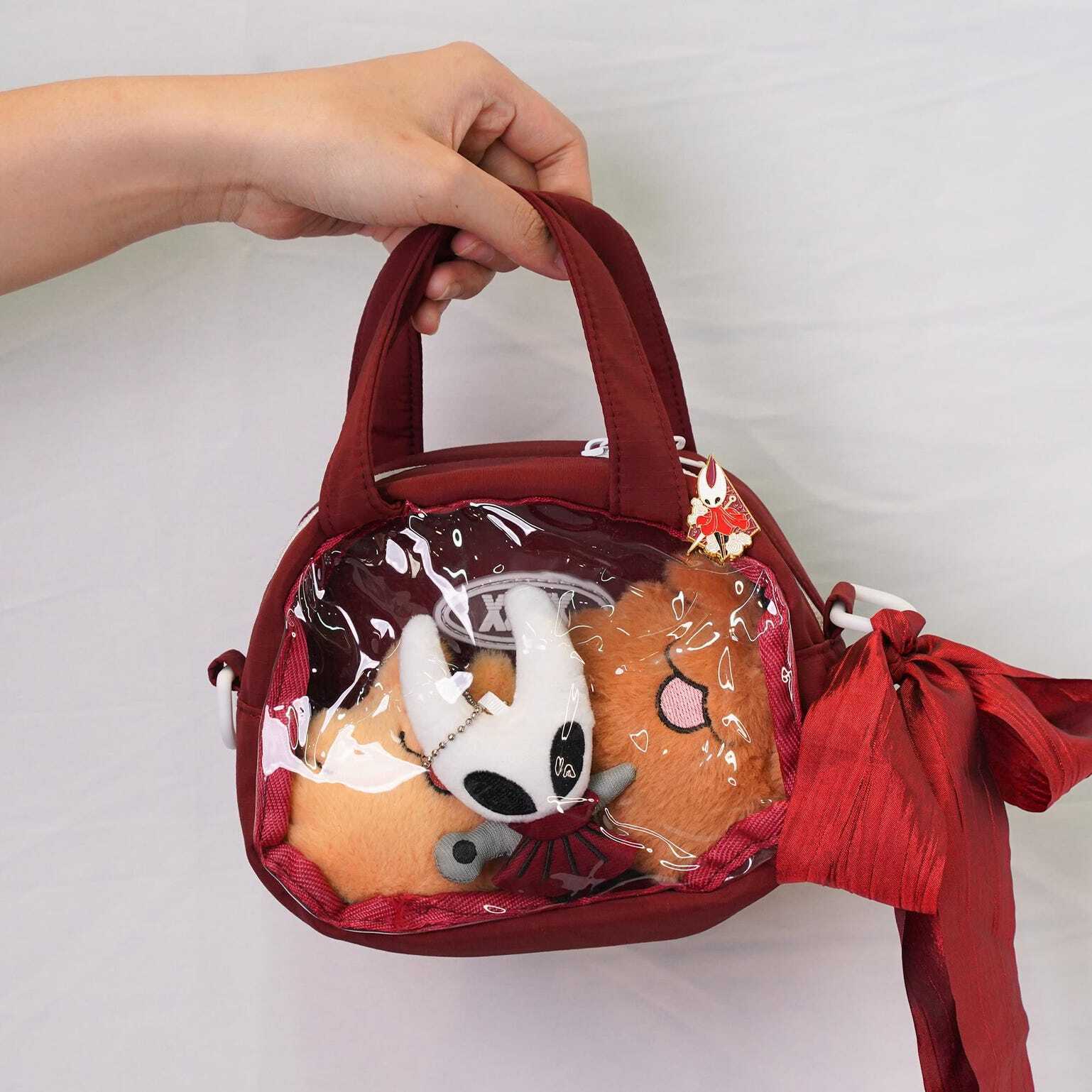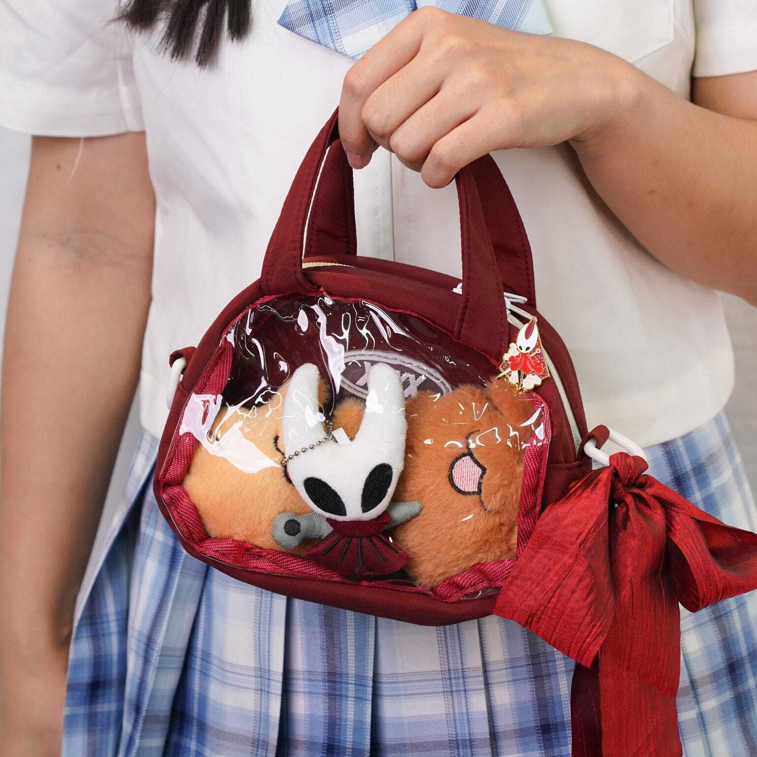 Red Kawaii Convertible Ita Bag with Clear Window for Plushies and Pins combines everyday carry with a clear display area for pins, badges, charms, or character merch.