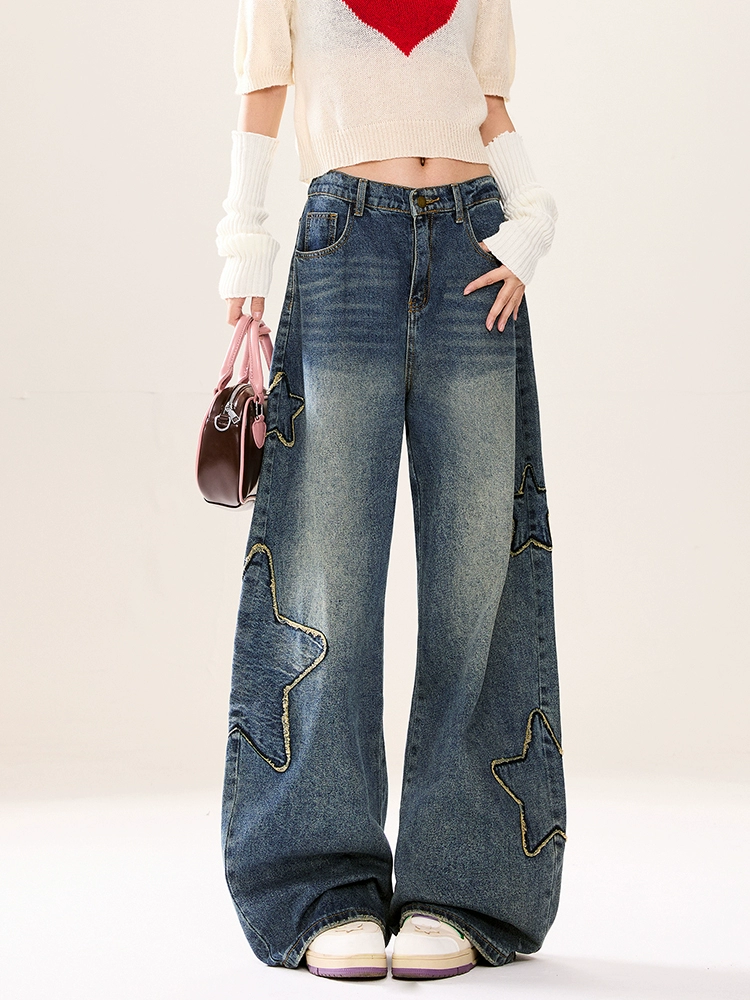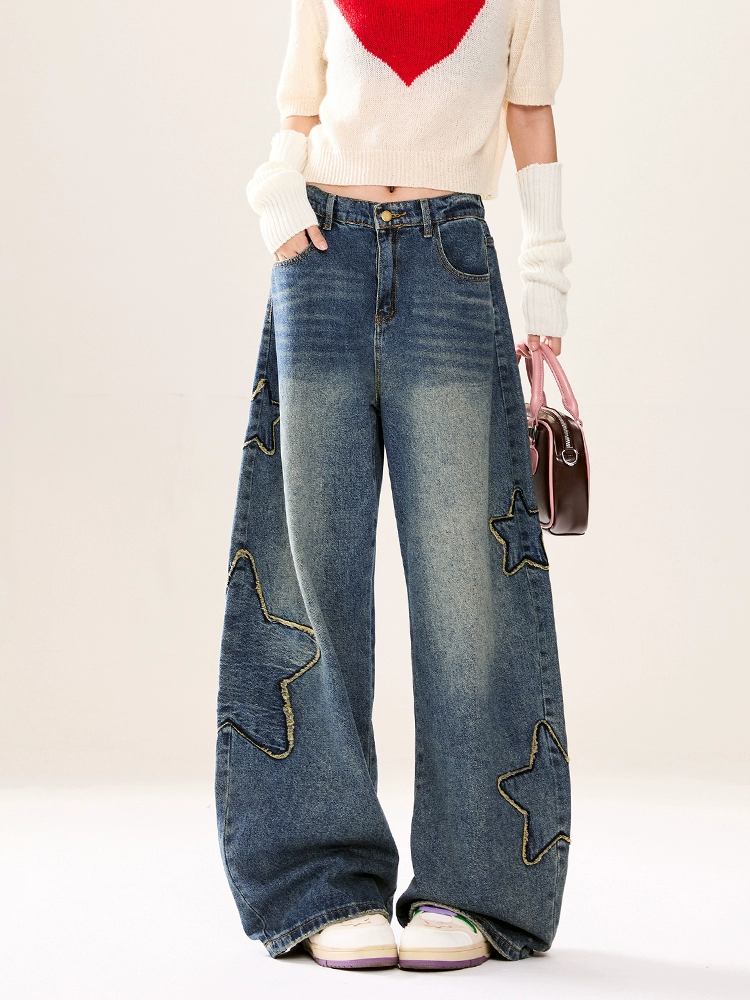 Retro distressed raw edge star patch jeans for women 2025 new loose slimming and drapey wide-leg floor-length trousers