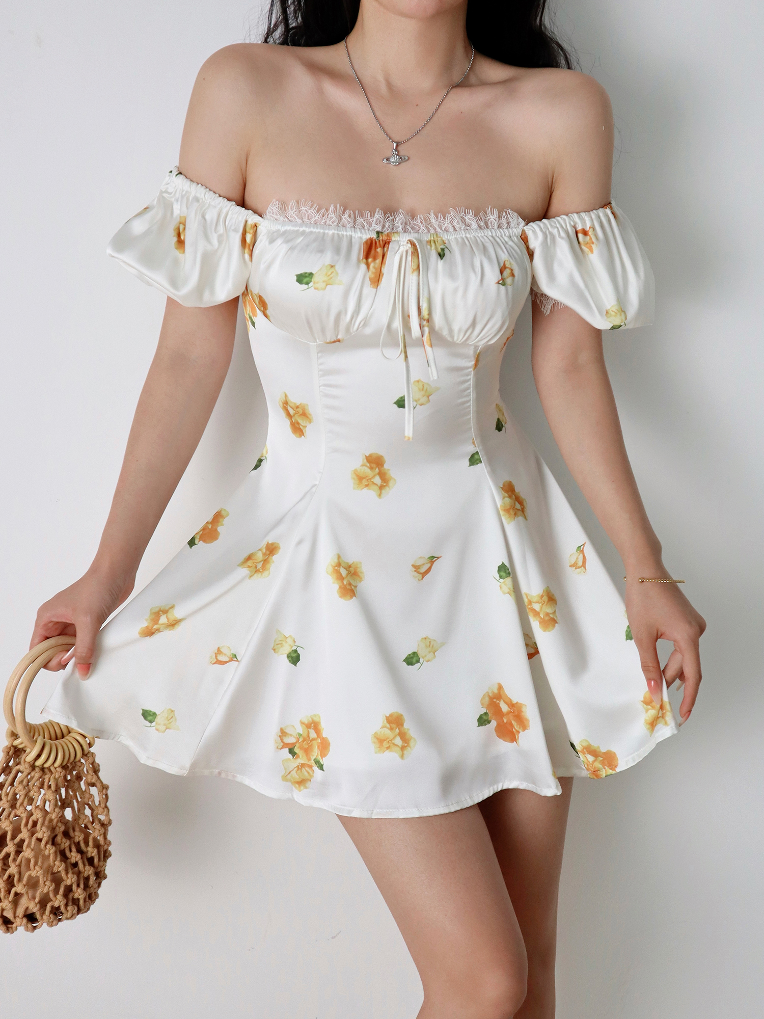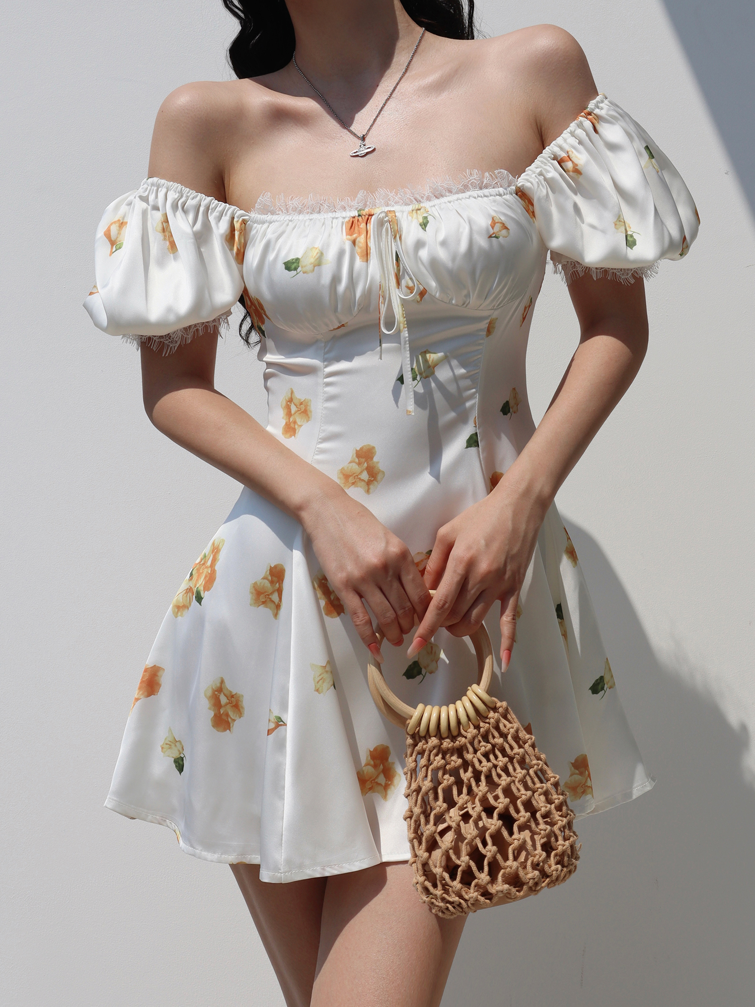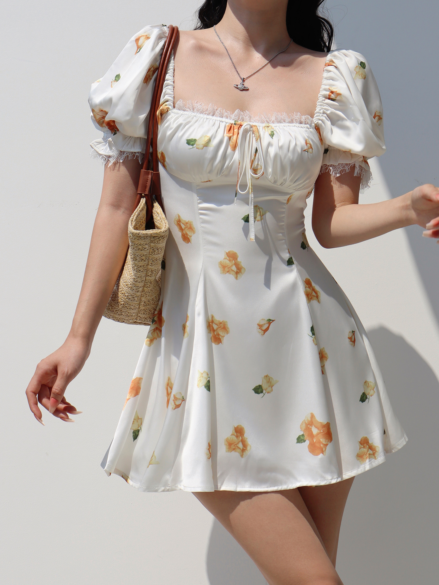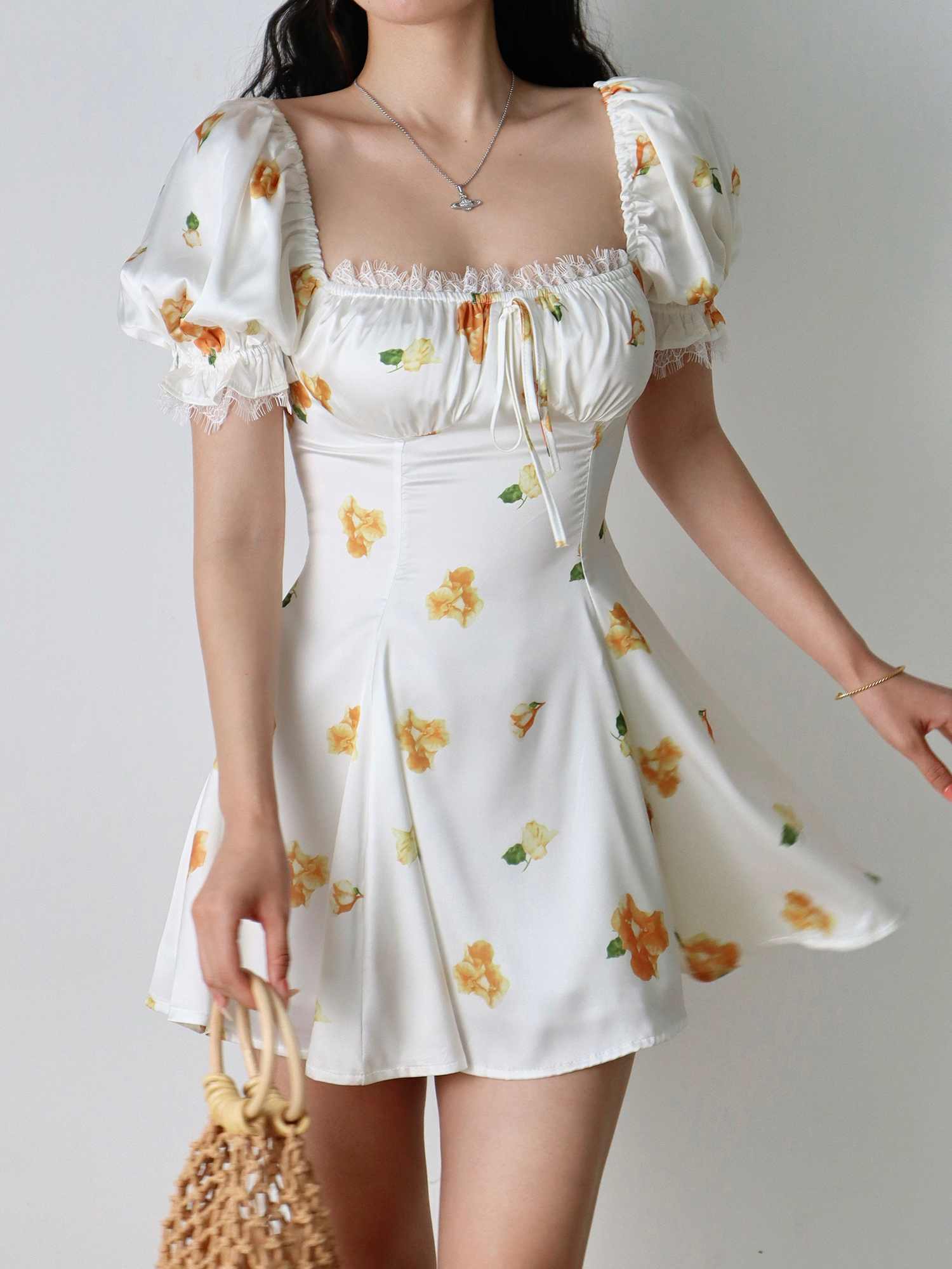 Retro Floral Lace Square Neck Puff Sleeve Dress Women