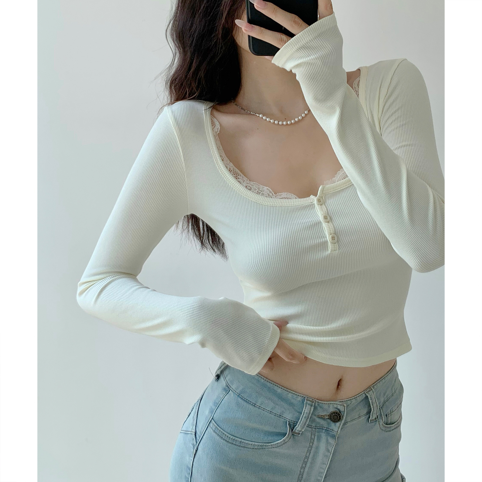 Retro Lace Ribbed Long Sleeve Top Slim Fit Stretch Y2K, Lovers