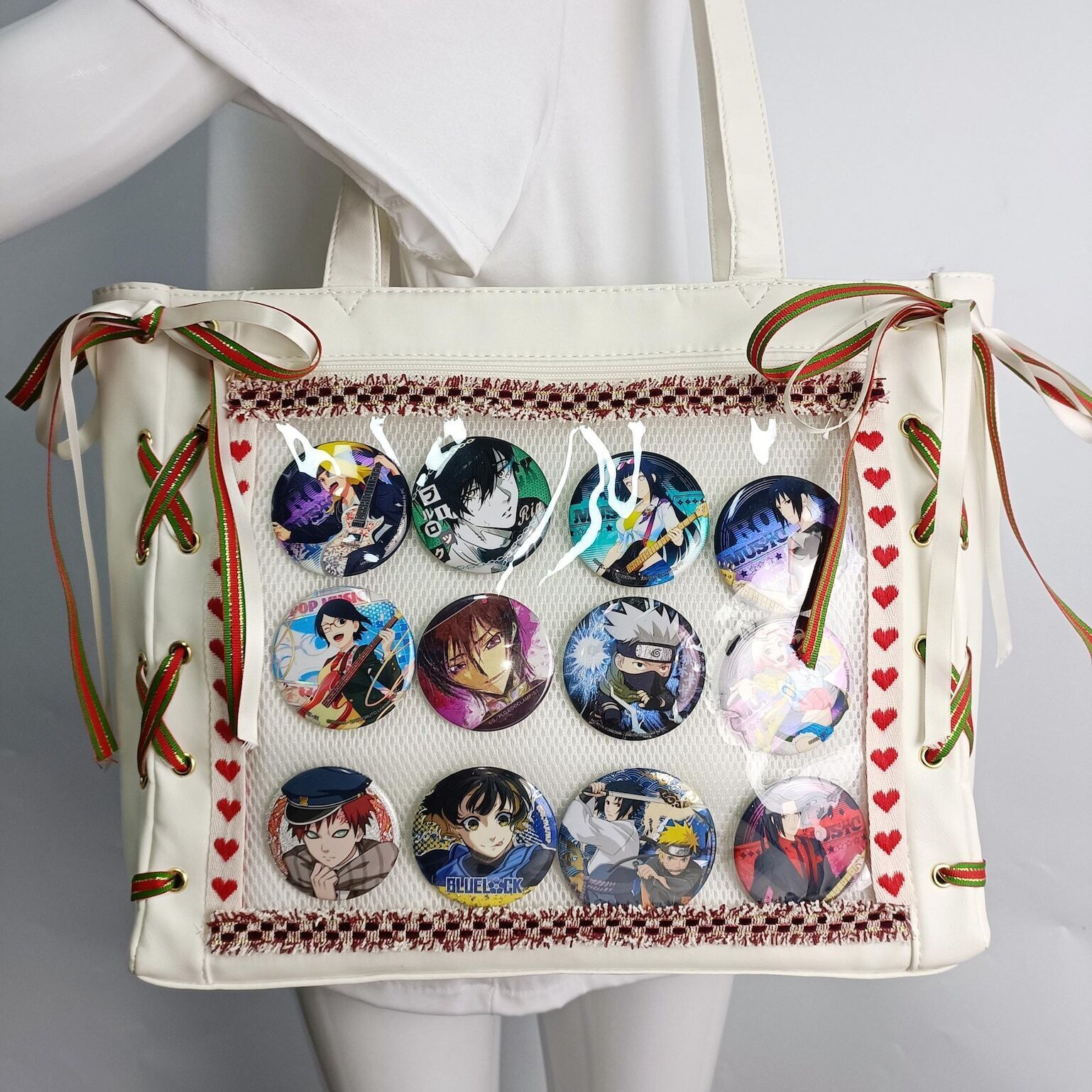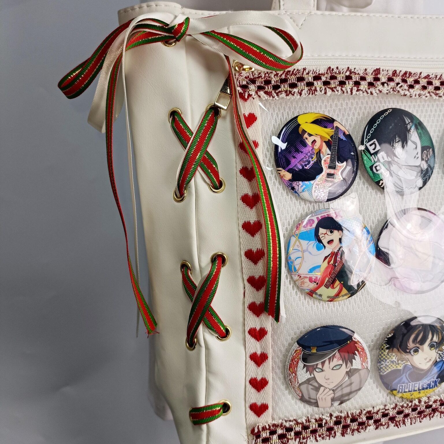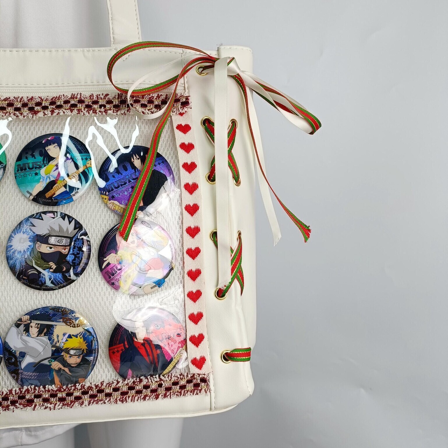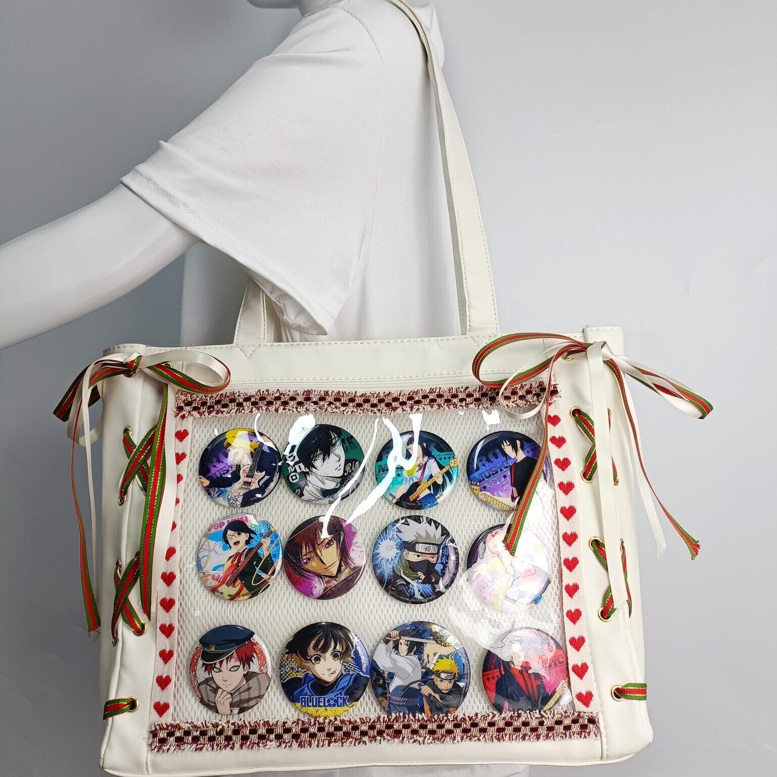 Ribbon Ita Shoulder Bag with Clear Window for Plushies and Pins is designed to display plushies, dolls, pins, and badges while keeping everyday essentials organized.