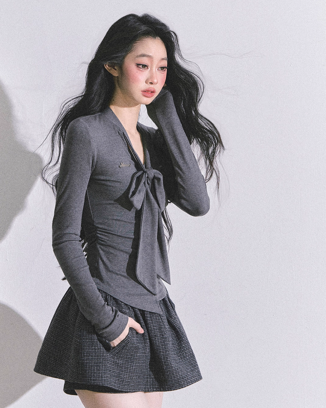 A top with a sophisticated impression featuring a ribbon detail at the collar.