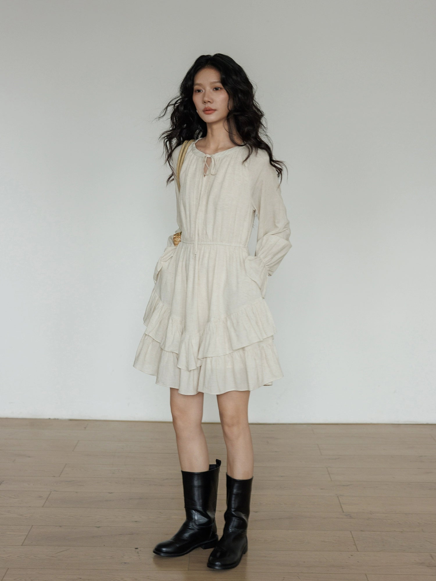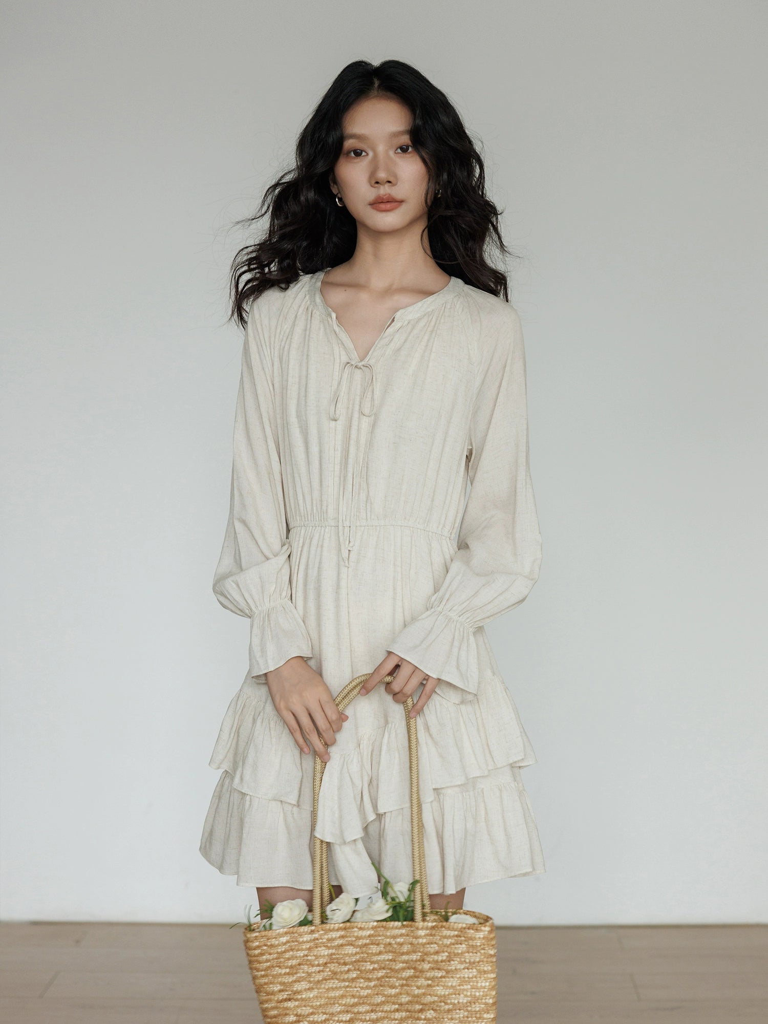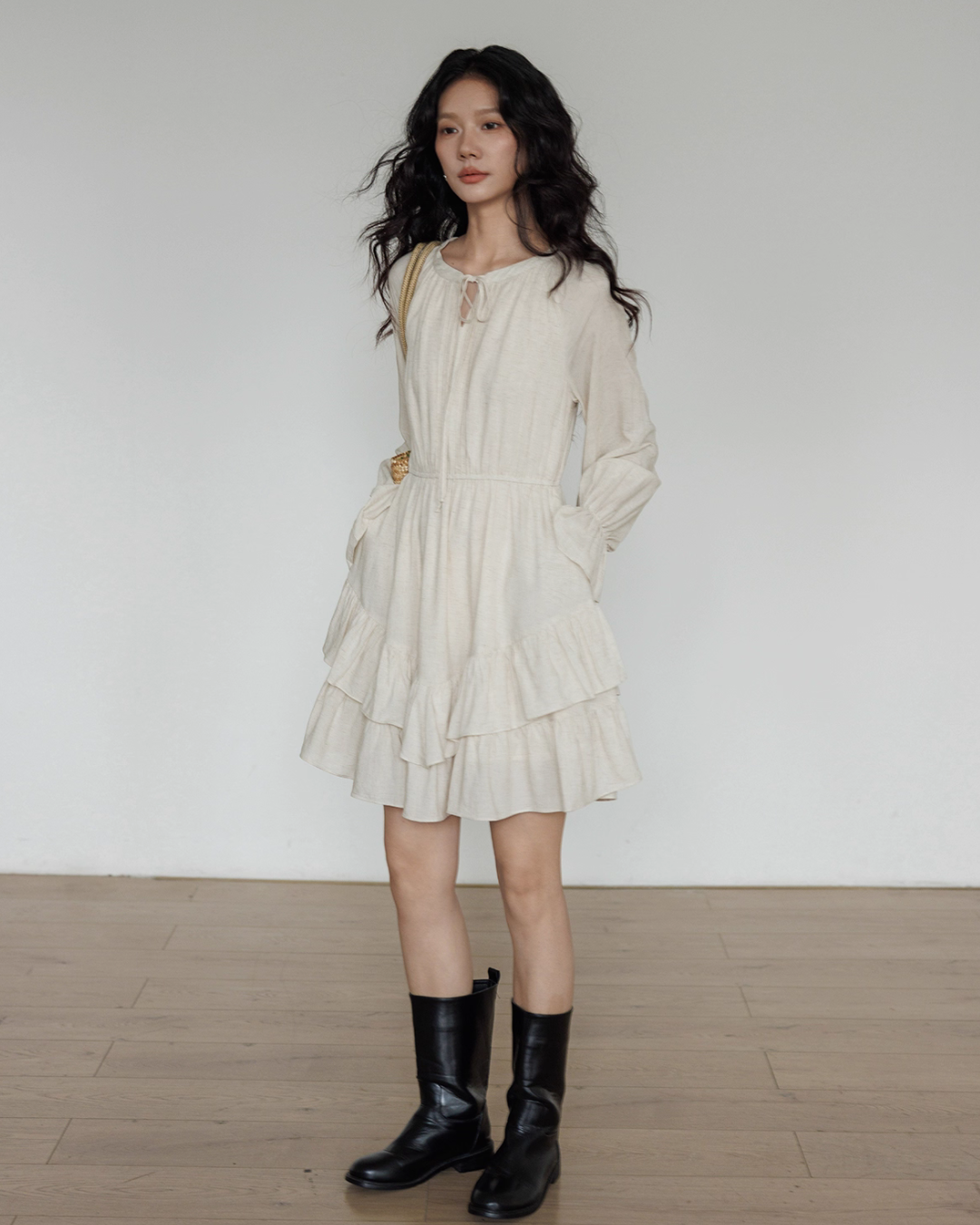 A one-piece dress with a natural and clean feel, creating an adult girly atmosphere.